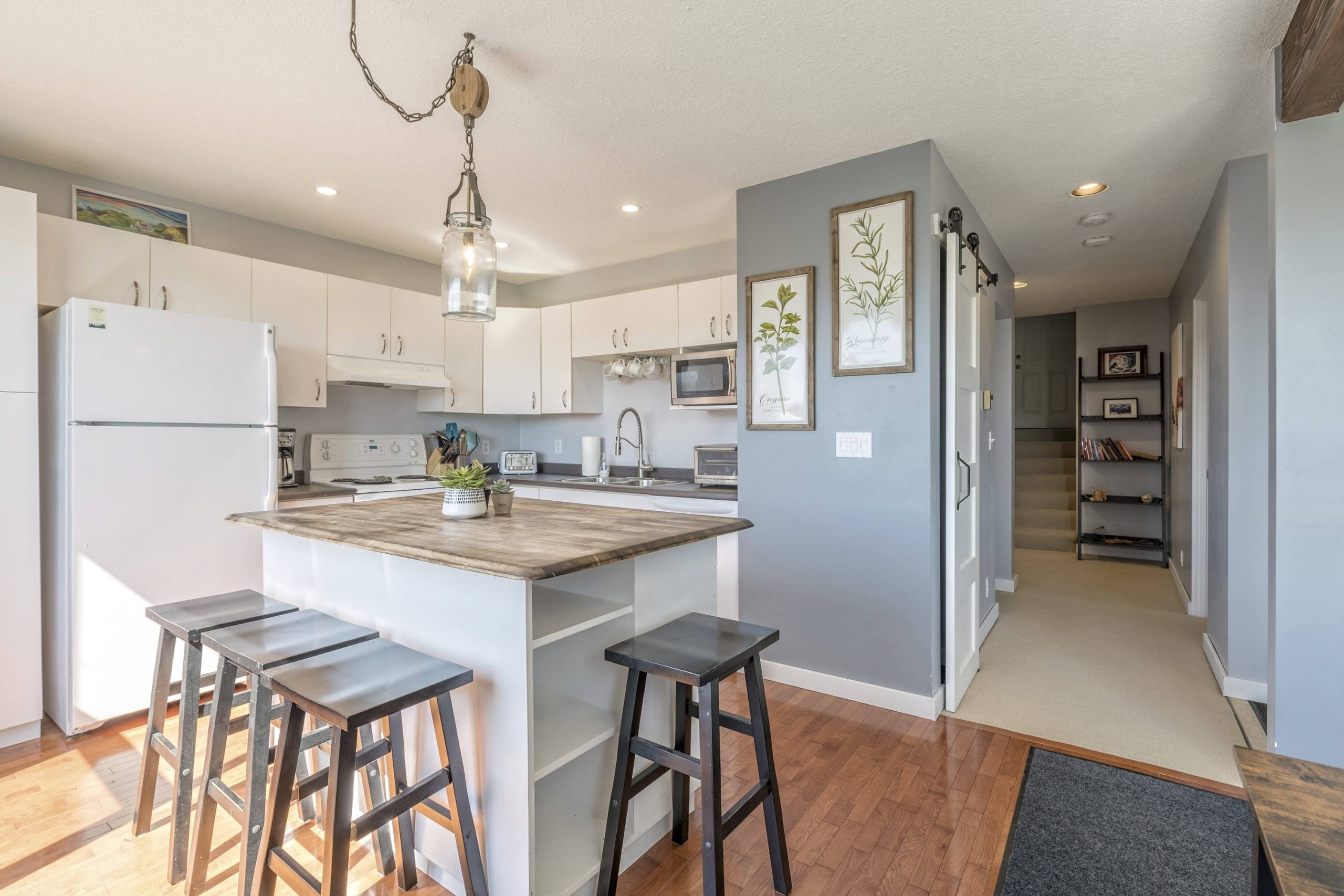 Walk in the front door to an open living room with beautiful views, fireplace, SMART TV, and kitchen area. This is the perfect spot to hang out after a long day on the mountain. From here, head up a couple stairs to the three bedrooms.