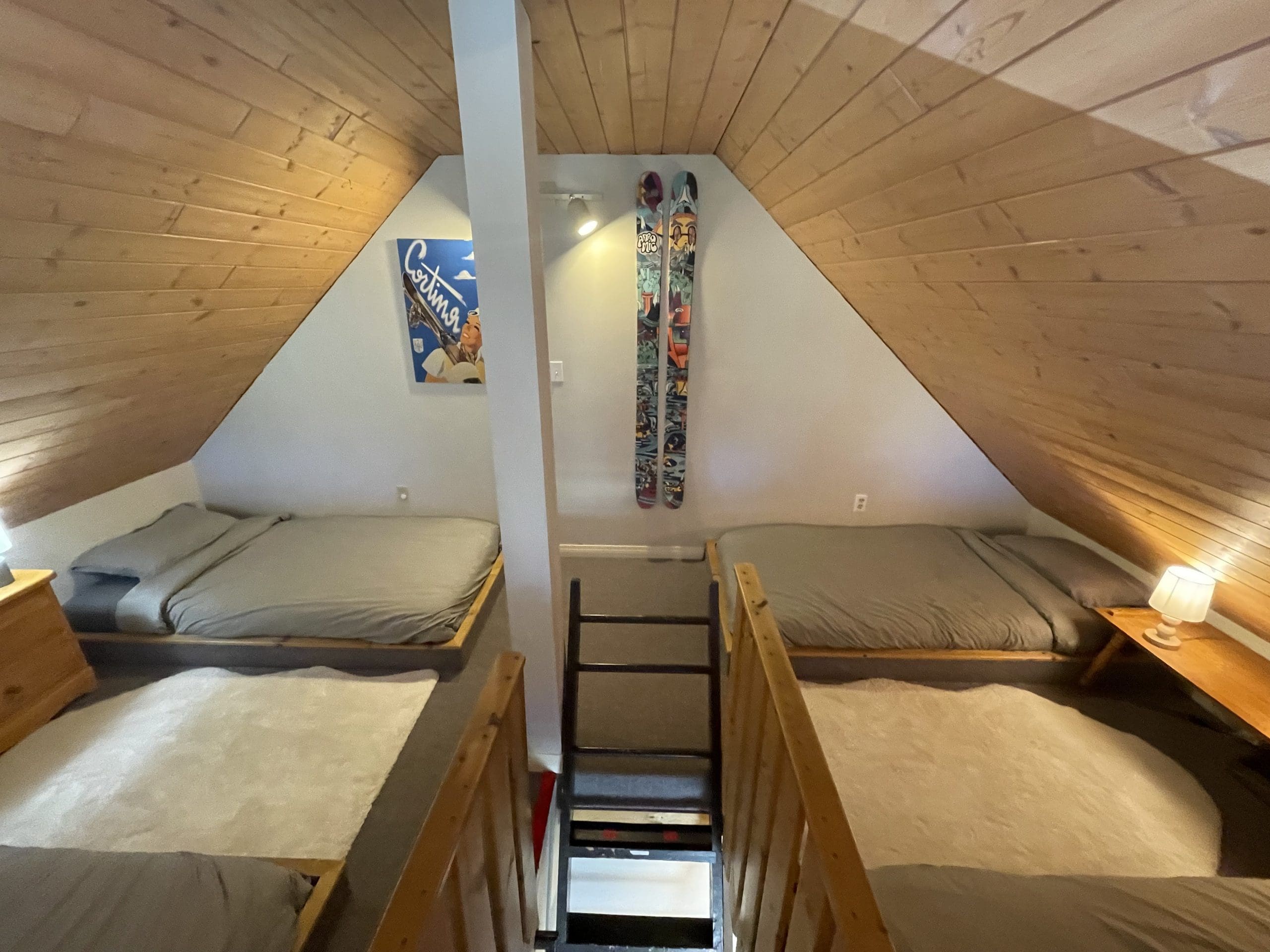 Want a cool spot for the kids? Head up the ladder to the loft which has four twin beds. This is the perfect spot for the kids to hang out after a fun day on the mountain or visiting the Okanagan.