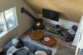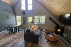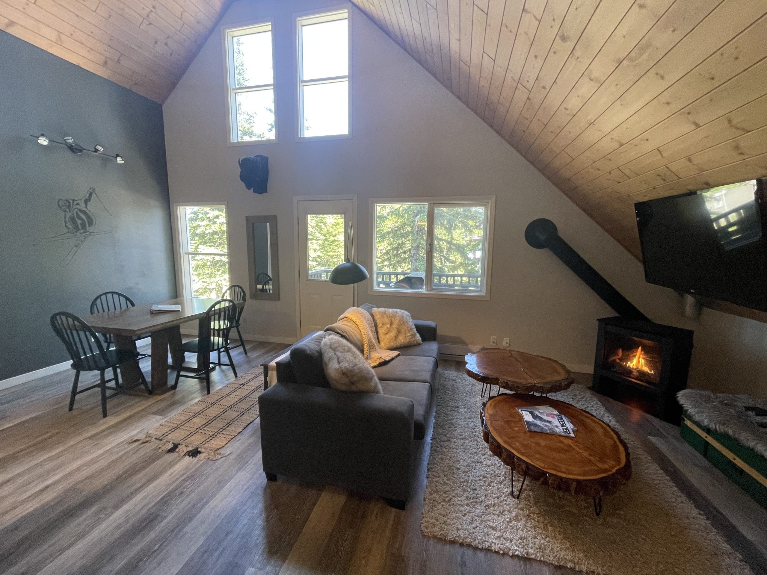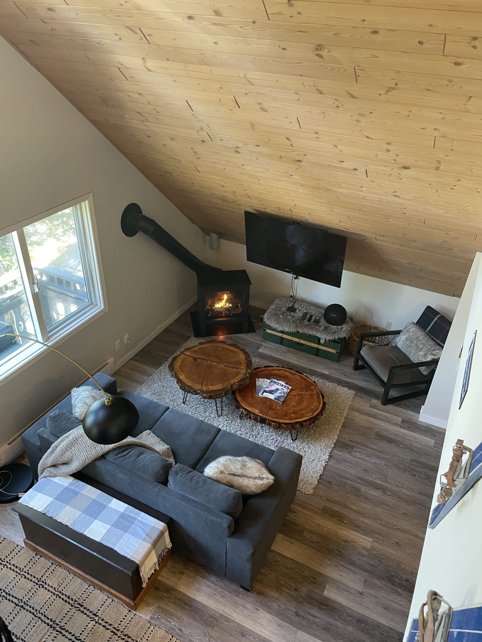 Après Chalet is a gem on the mountain. This suite is nestled in the trees and has a unique layout being on the top floor of a house with incredible, large windows and a cool loft overlooking the main living area.