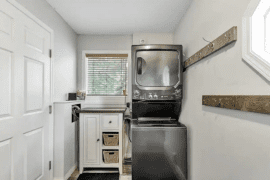 Walk in the front door to the entry way which also doubles as the laundry area. From here, head upstairs to the large and open living area with a cozy living room, fully stocked kitchen and dining room. There is also a deck with a BBQ for you to use.