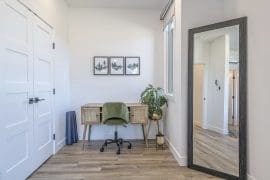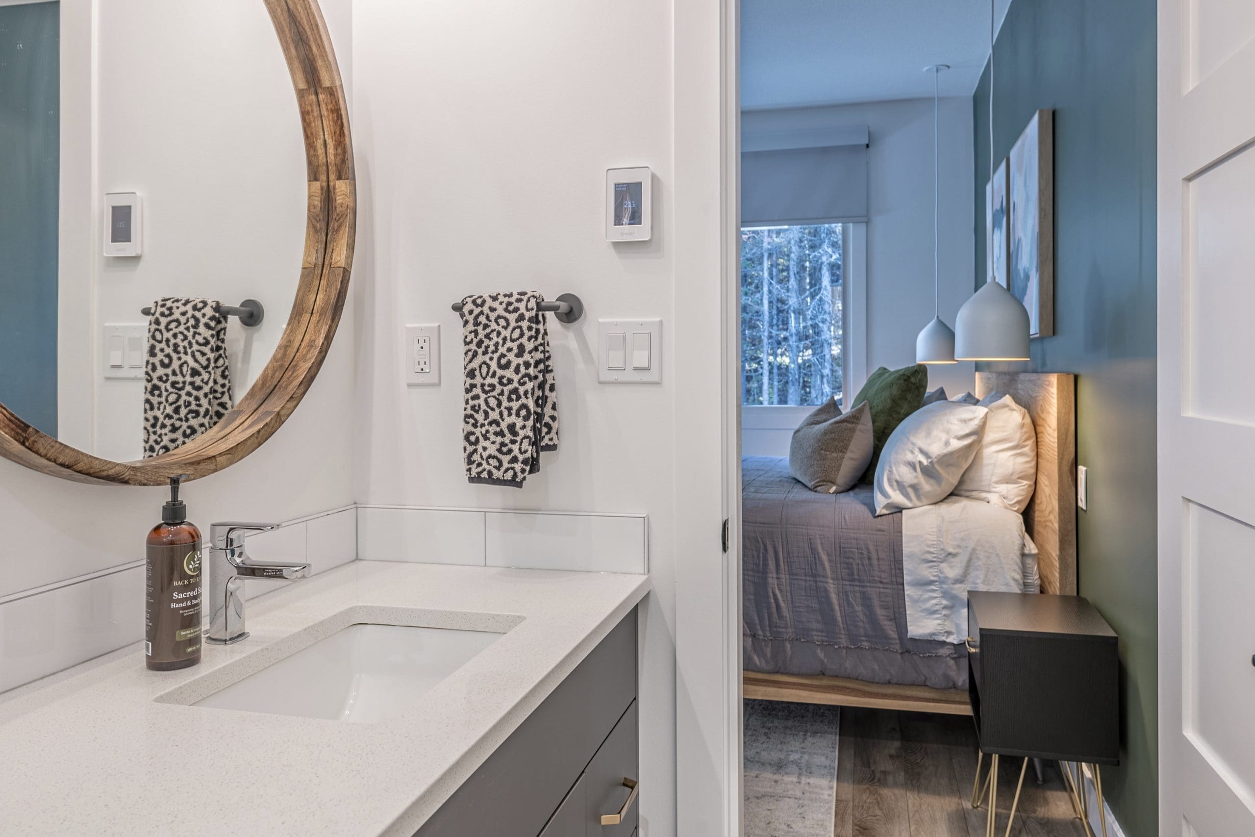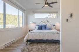 Upstairs, on the third floor, you’ll find all three bedrooms. And you’re in luck, there are two spacious master bedrooms with king beds! The first master bedroom has an ensuite with a beautiful standup shower. The second master bedroom is larger with mountain views. It also has a quiet desk nook for remote work or creative thinking, along with upgraded WiFi. The jack and jill bathroom connects the second master bedroom to the bunk room, and boasts a private toilet, standup shower, heated towel bars and double sinks. All bathrooms on the third floor have underfloor heating for your comfort.