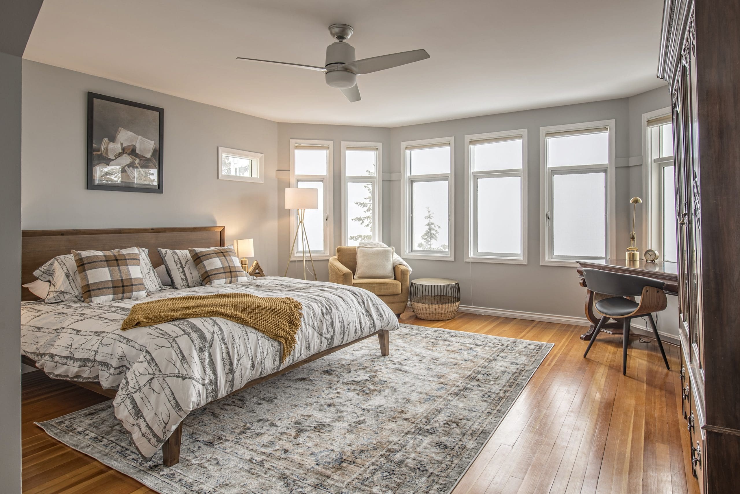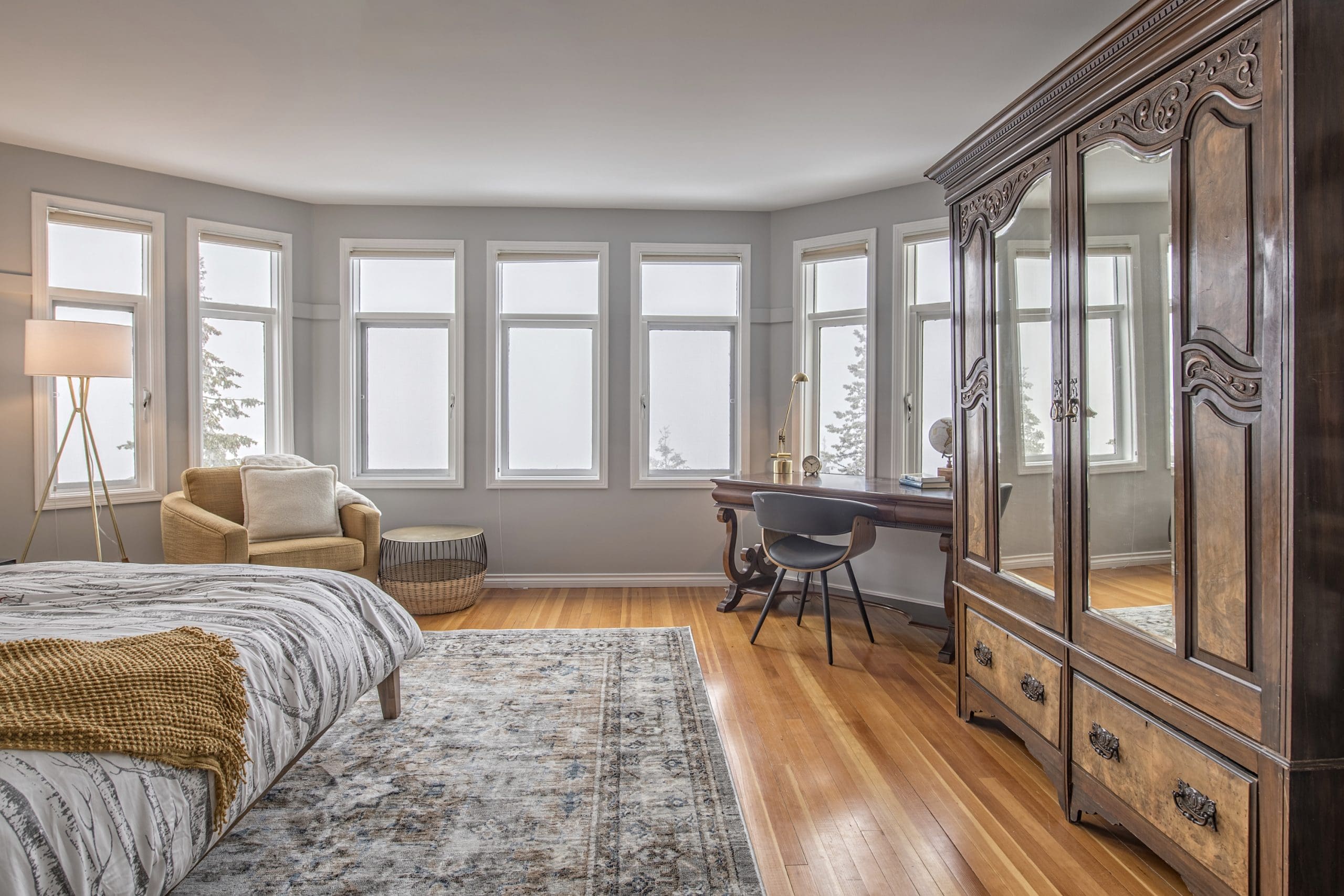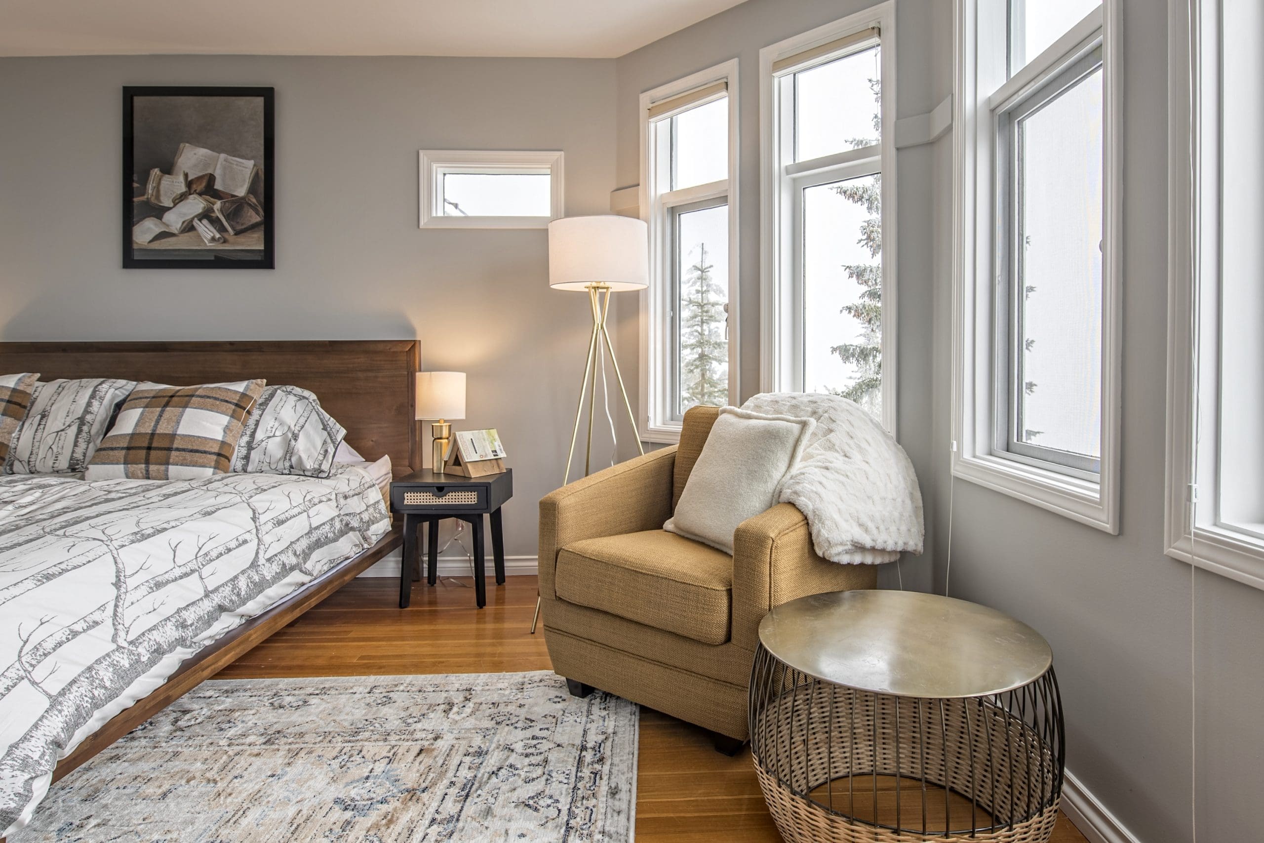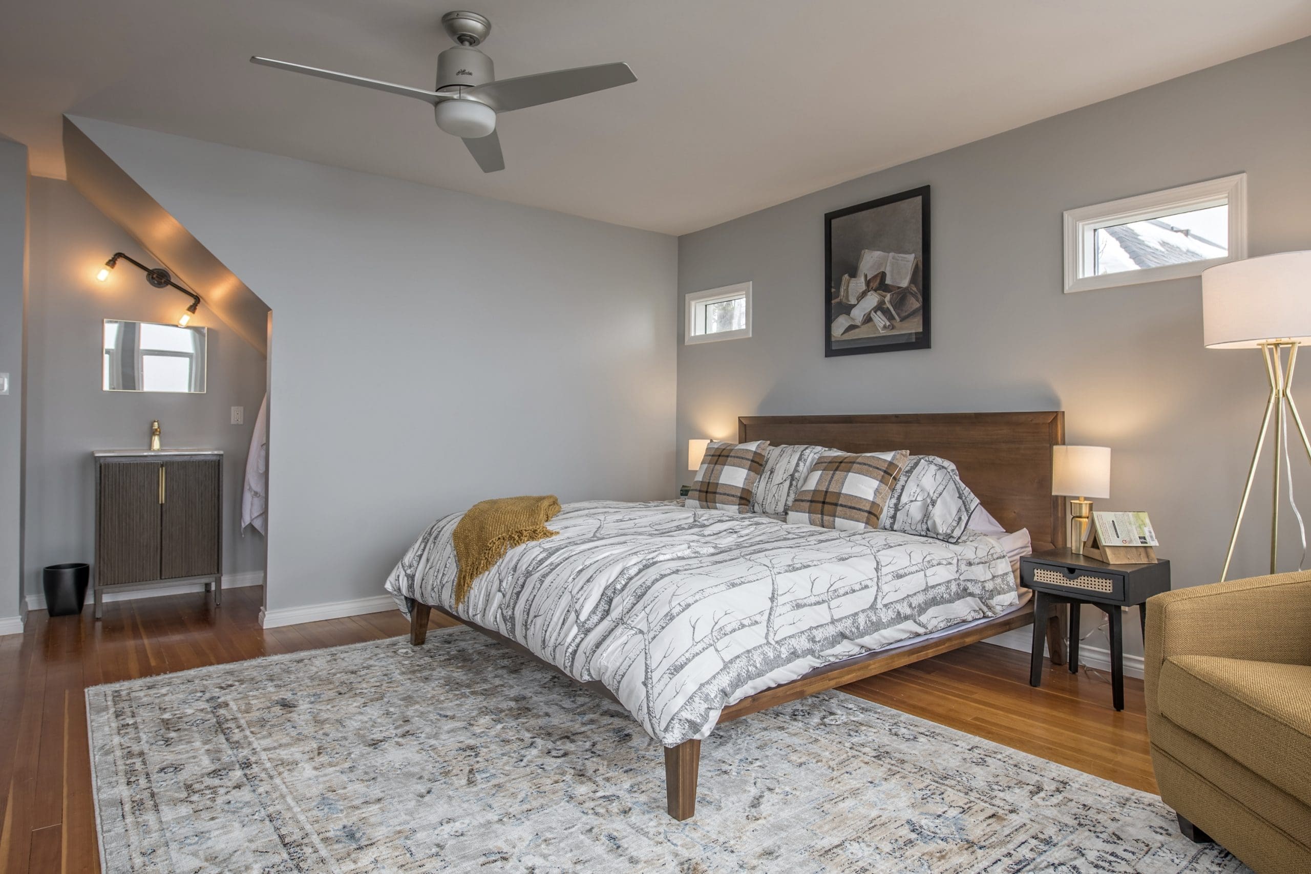 Ascend to the master bedroom floor, featuring a king-size bed, sitting area with an electric fireplace, coffee and wine bar, and a spacious ensuite bathroom with a clawfoot tub and stand-up shower. This area is perfect for those that need a little extra space and a bit of privacy.