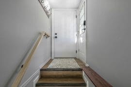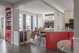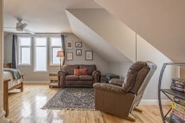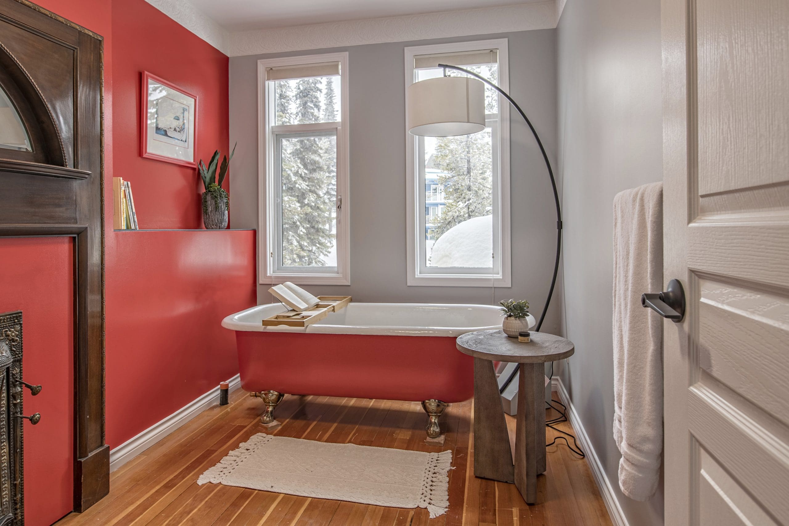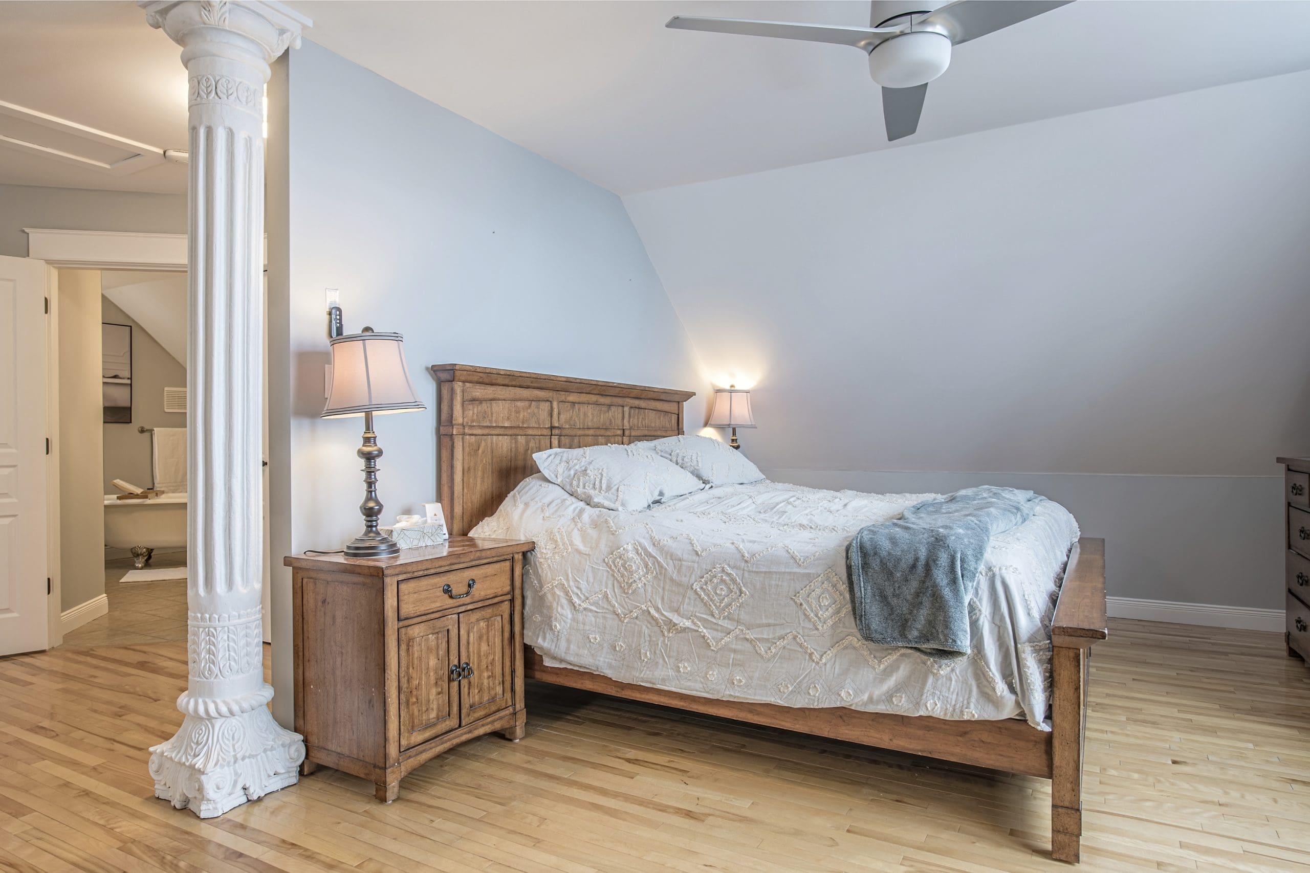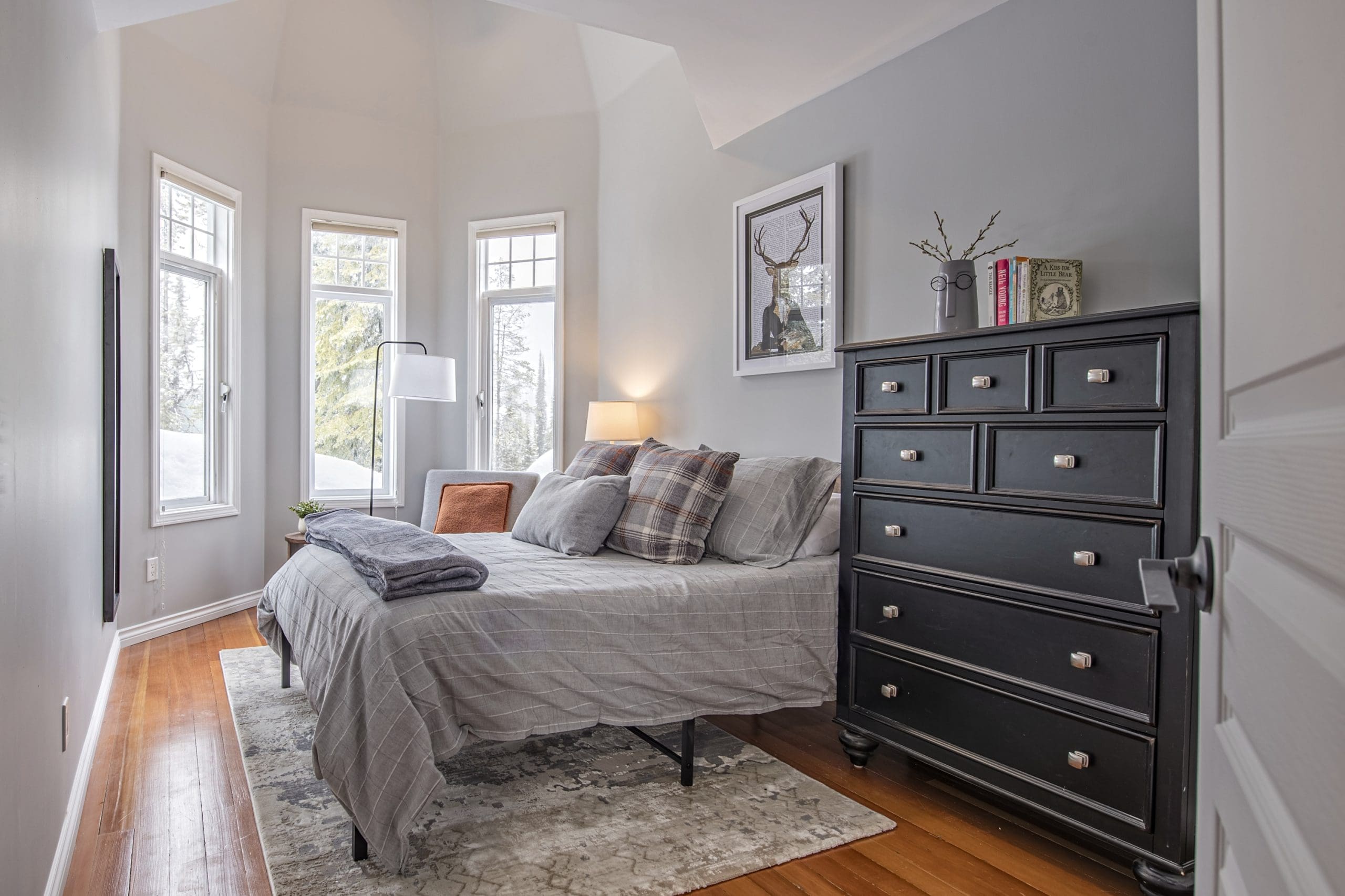 Ascend to the master bedroom floor, featuring a king-size bed, sitting area with an electric fireplace, coffee and wine bar, and a spacious ensuite bathroom with a clawfoot tub and stand-up shower. This area is perfect for those that need a little extra space and a bit of privacy.