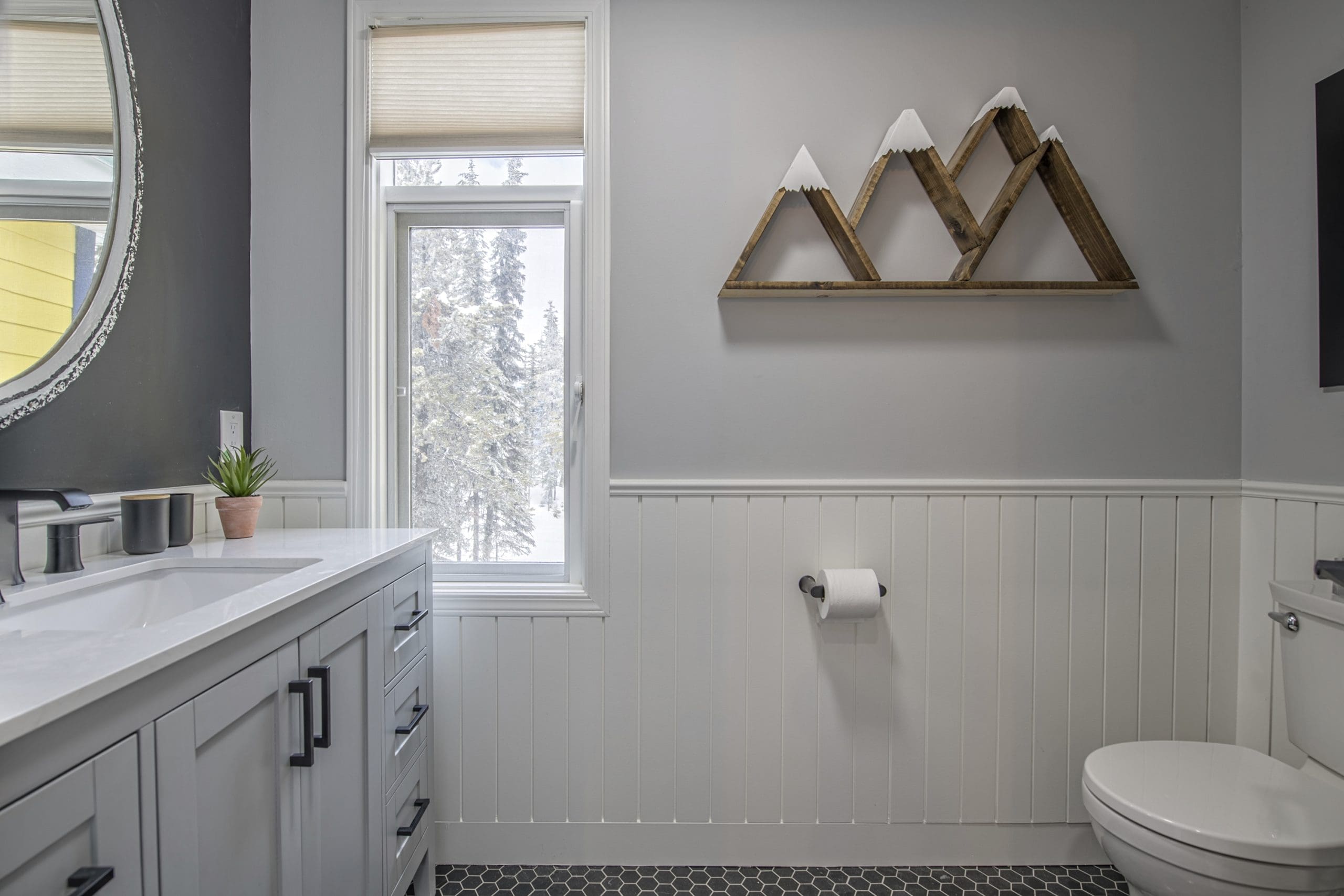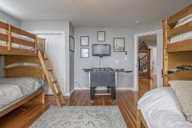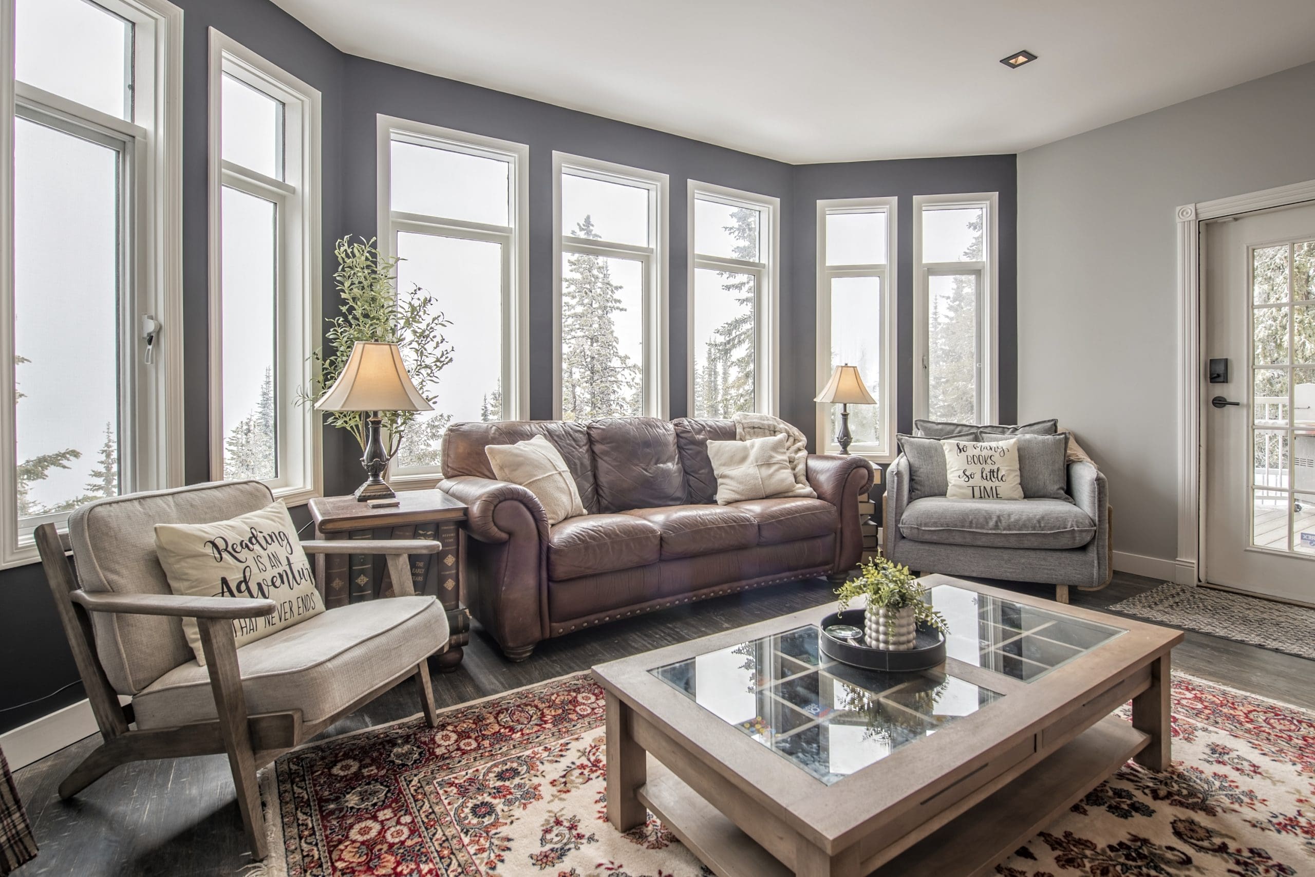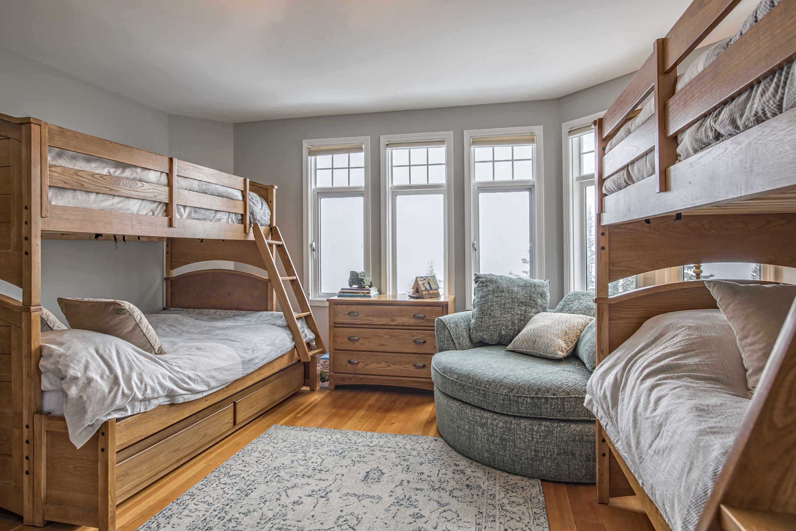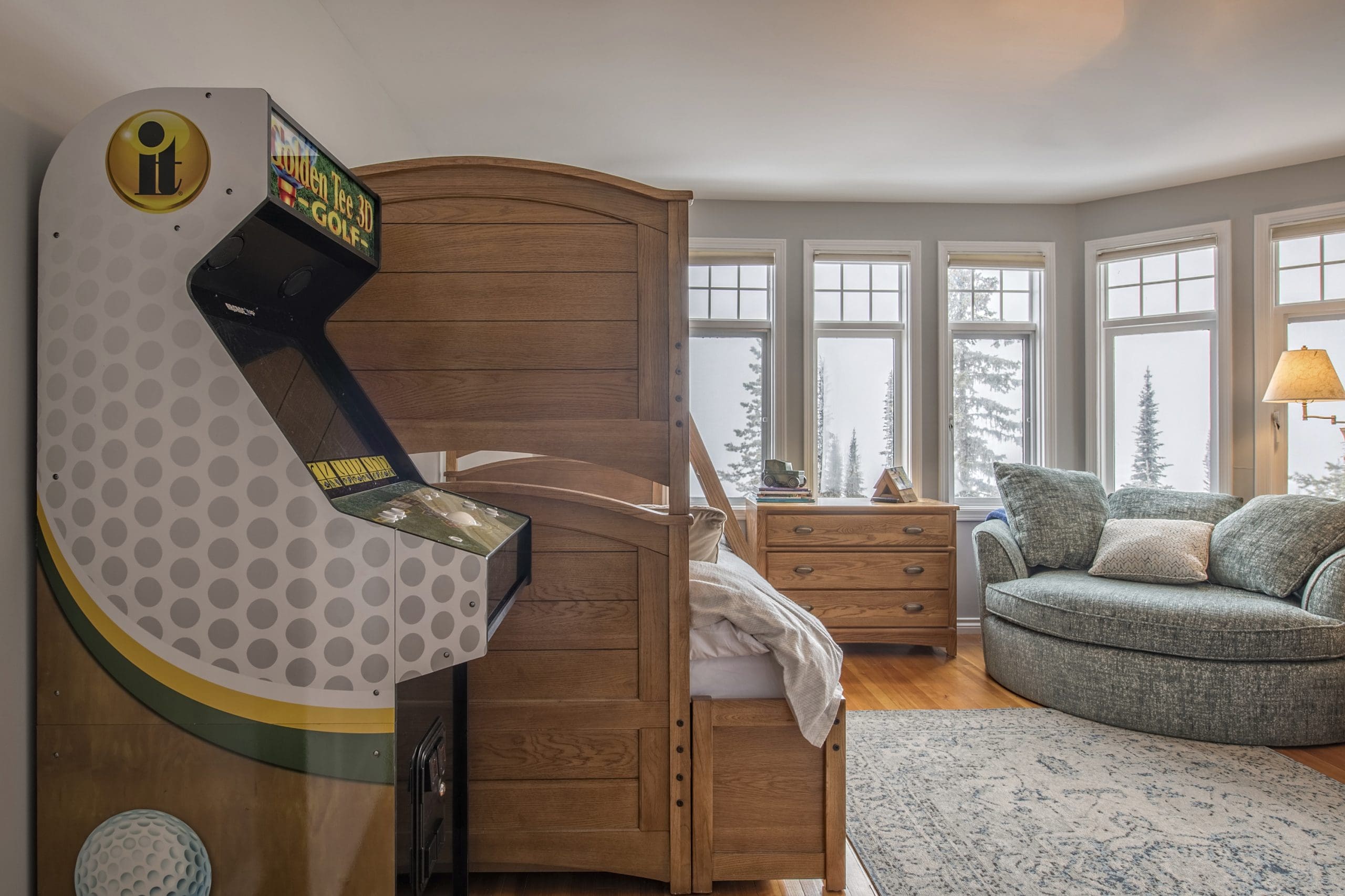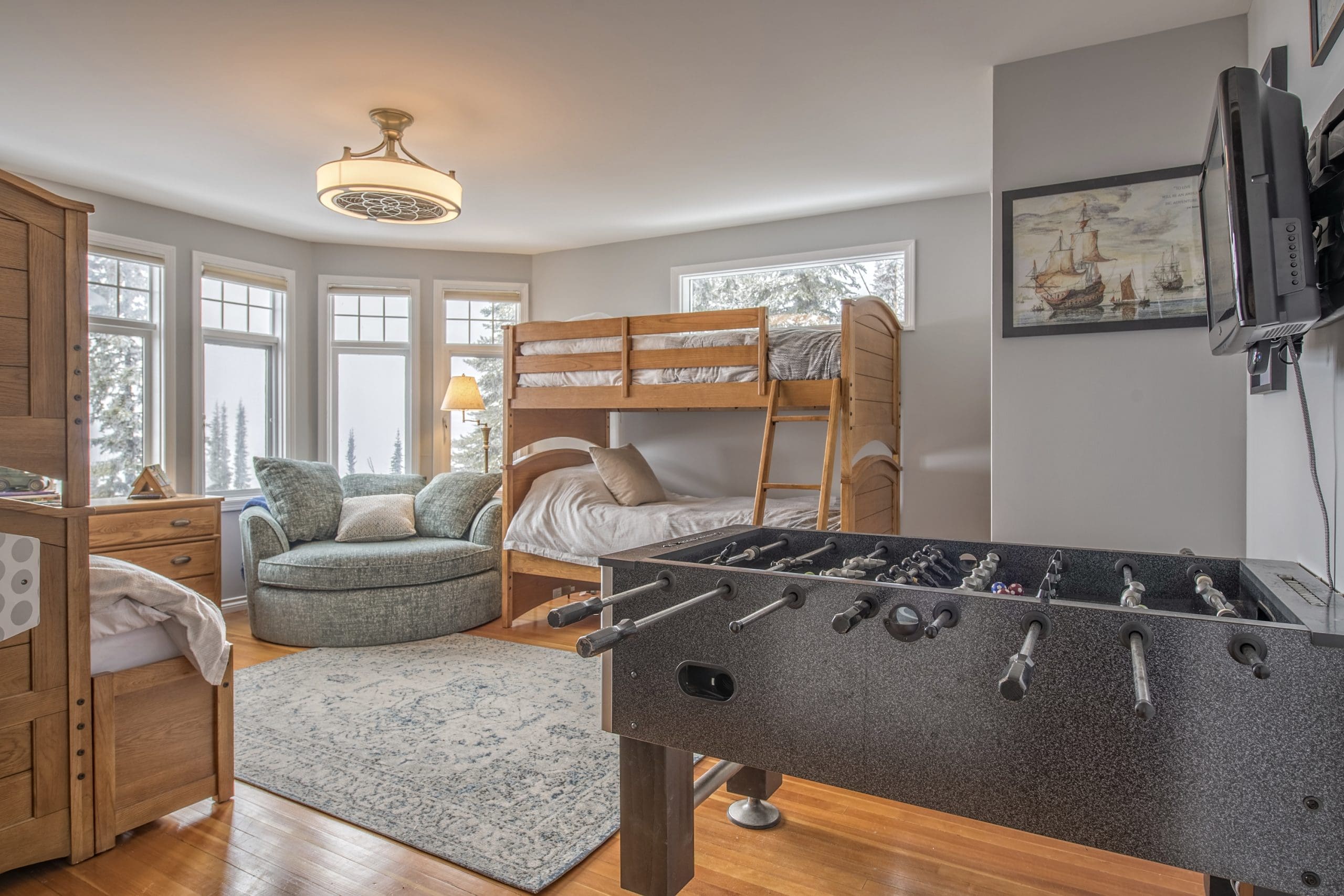 Venture upstairs to discover three bedrooms, a unique separated 3-piece bathroom, and the 8-person sauna which is perfect for the end of a long day on the mountain. All bedrooms are set up for maximum comfort with cozy beds, sitting areas, and scenic views. The king bedroom on this level even has a desk overlooking the Monashee Mountains – in case you have some work to do. The bunk room is a kid’s paradise! There are two sets of bunk beds with a trundle bed. Not to mention a TV, an oversized cozy chair, arcade cabinet, and foosball table. Could you ask for anything more?