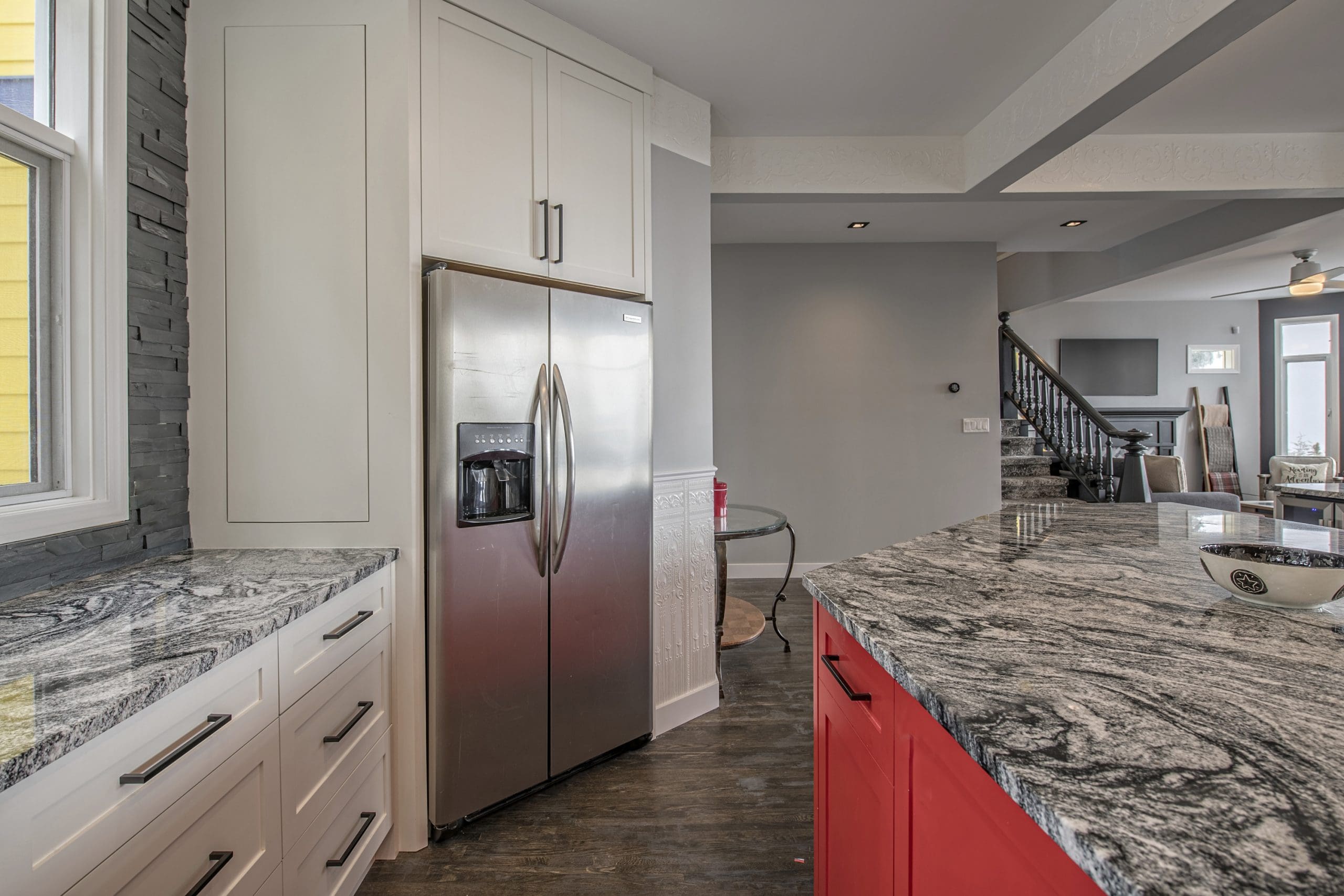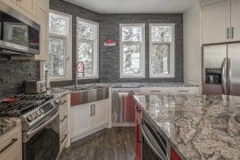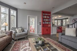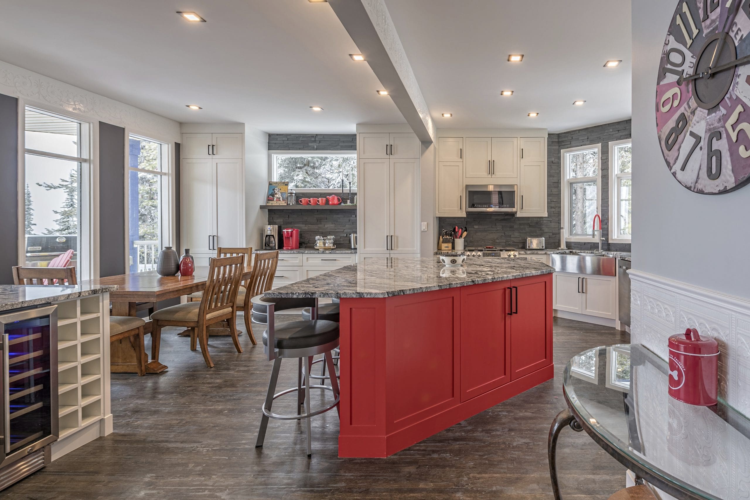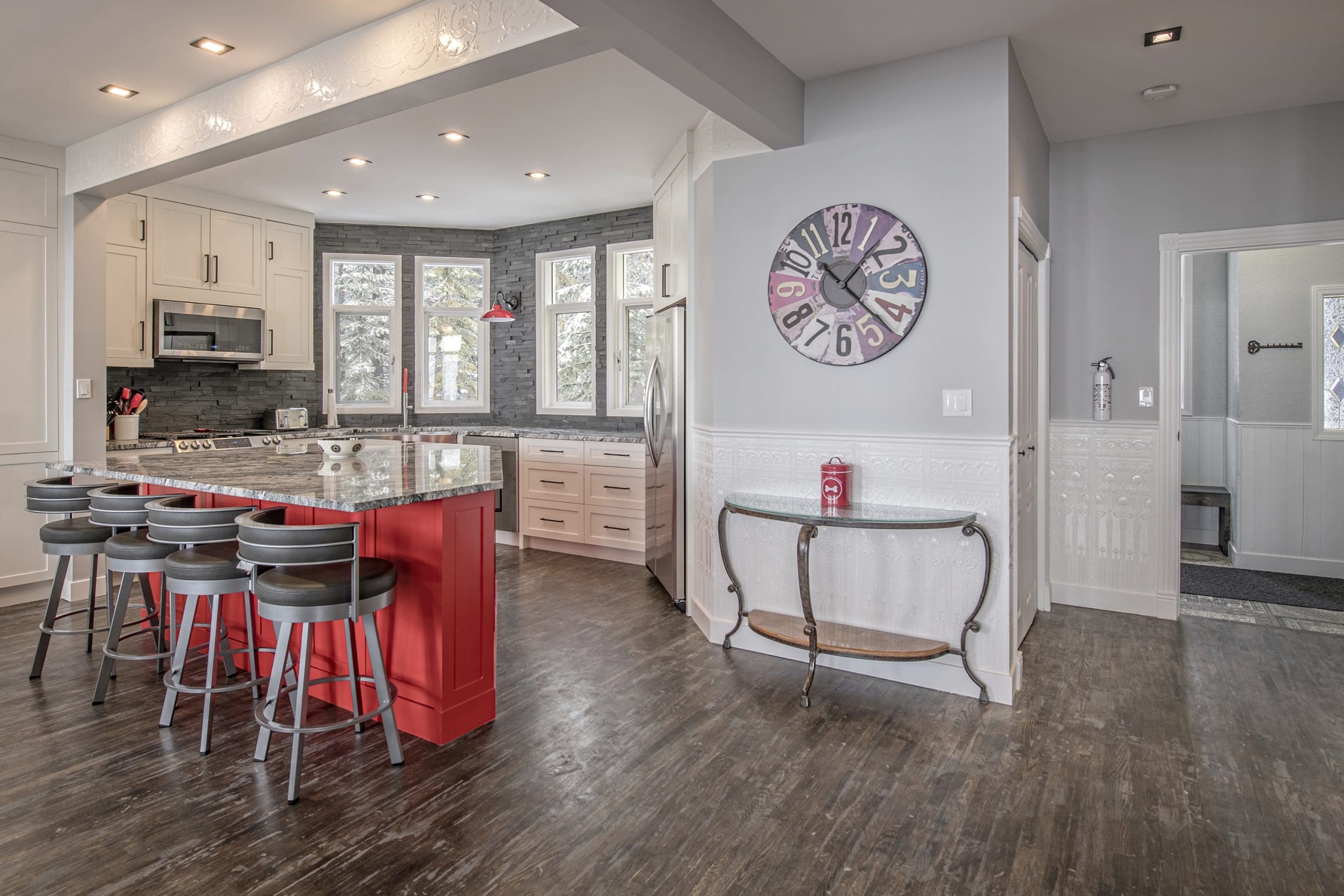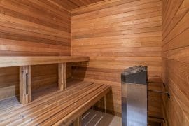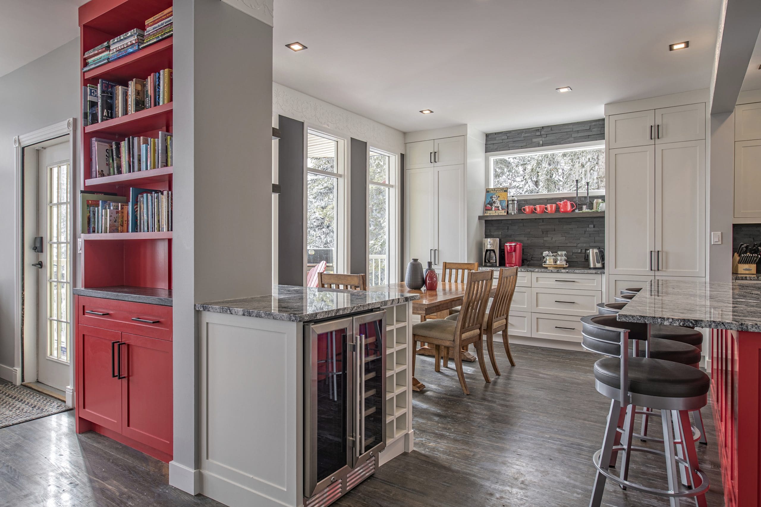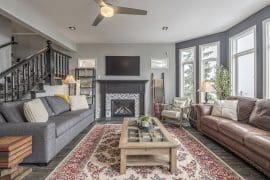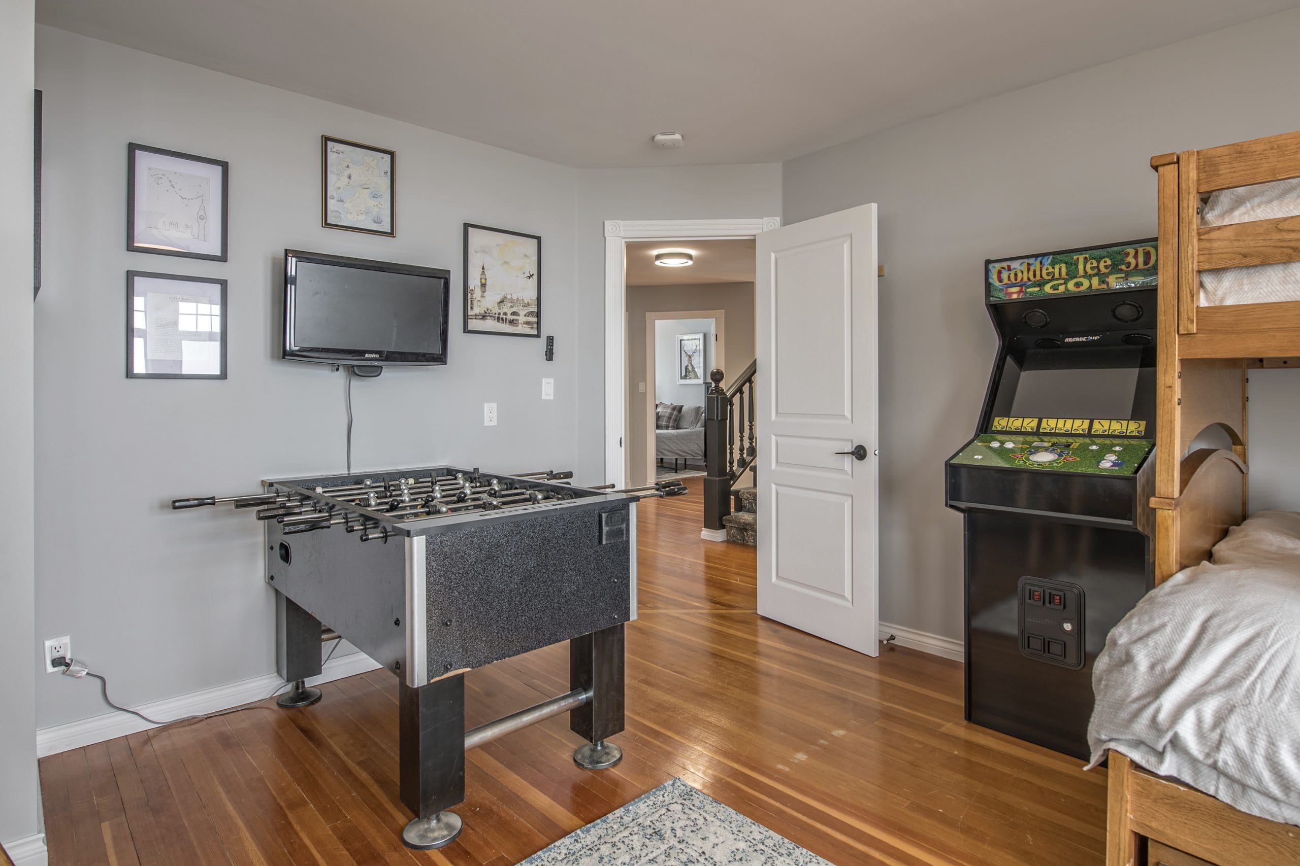 Venture upstairs to discover three bedrooms, a unique separated 3-piece bathroom, and the 8-person sauna which is perfect for the end of a long day on the mountain. All bedrooms are set up for maximum comfort with cozy beds, sitting areas, and scenic views. The king bedroom on this level even has a desk overlooking the Monashee Mountains – in case you have some work to do. The bunk room is a kid’s paradise! There are two sets of bunk beds with a trundle bed. Not to mention a TV, an oversized cozy chair, arcade cabinet, and foosball table. Could you ask for anything more?