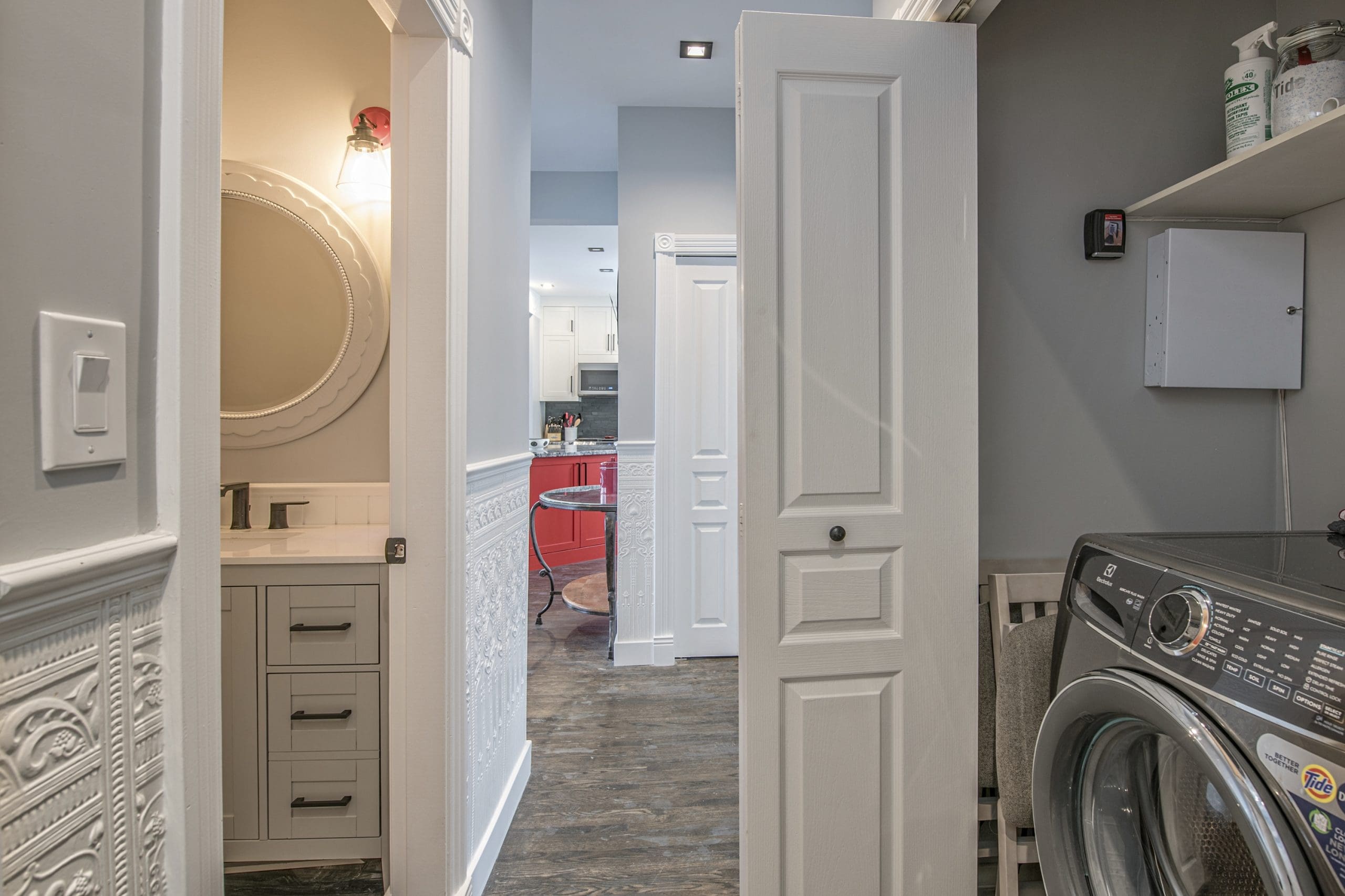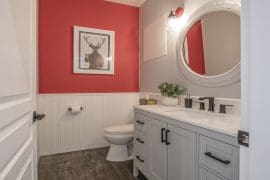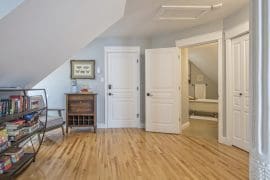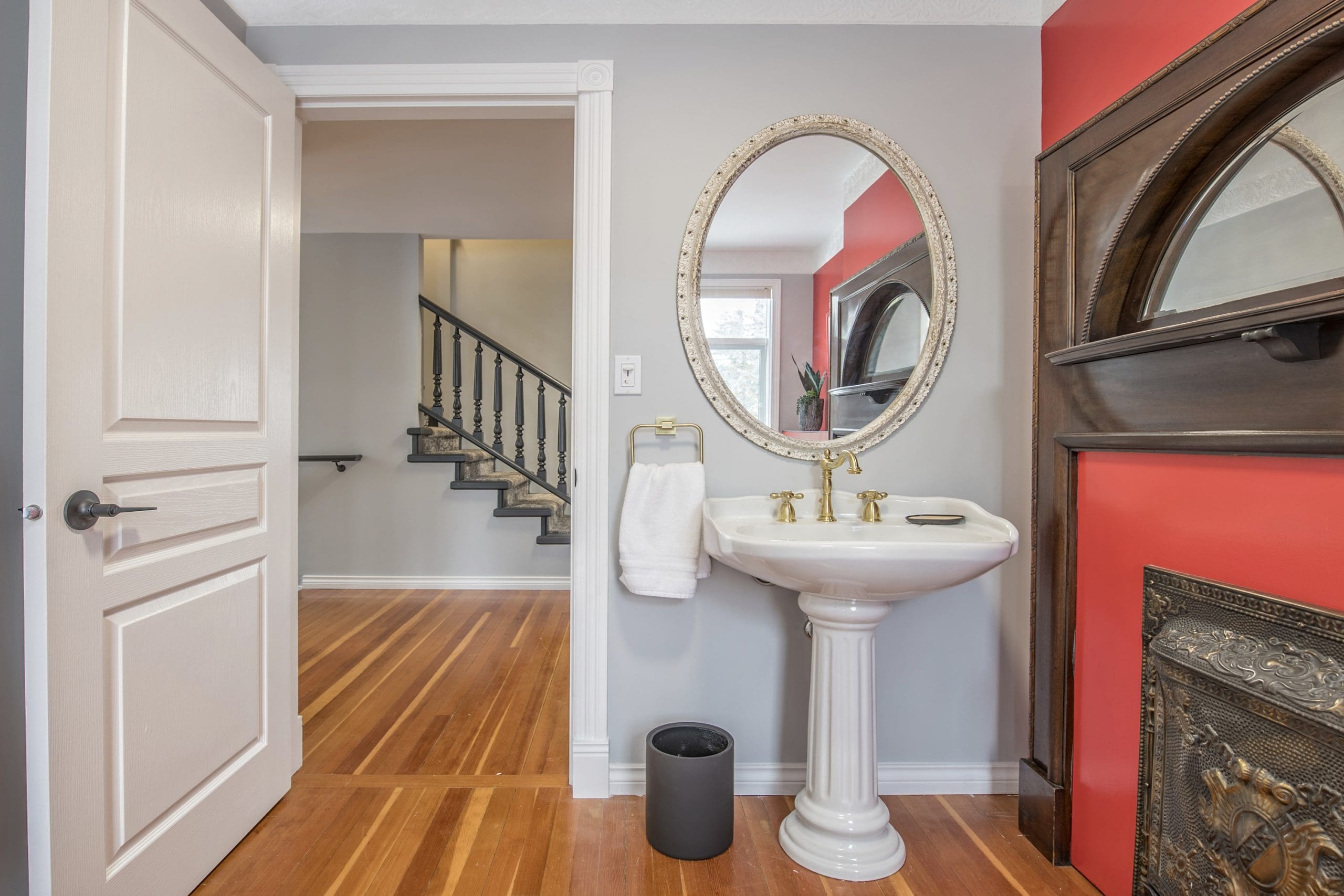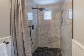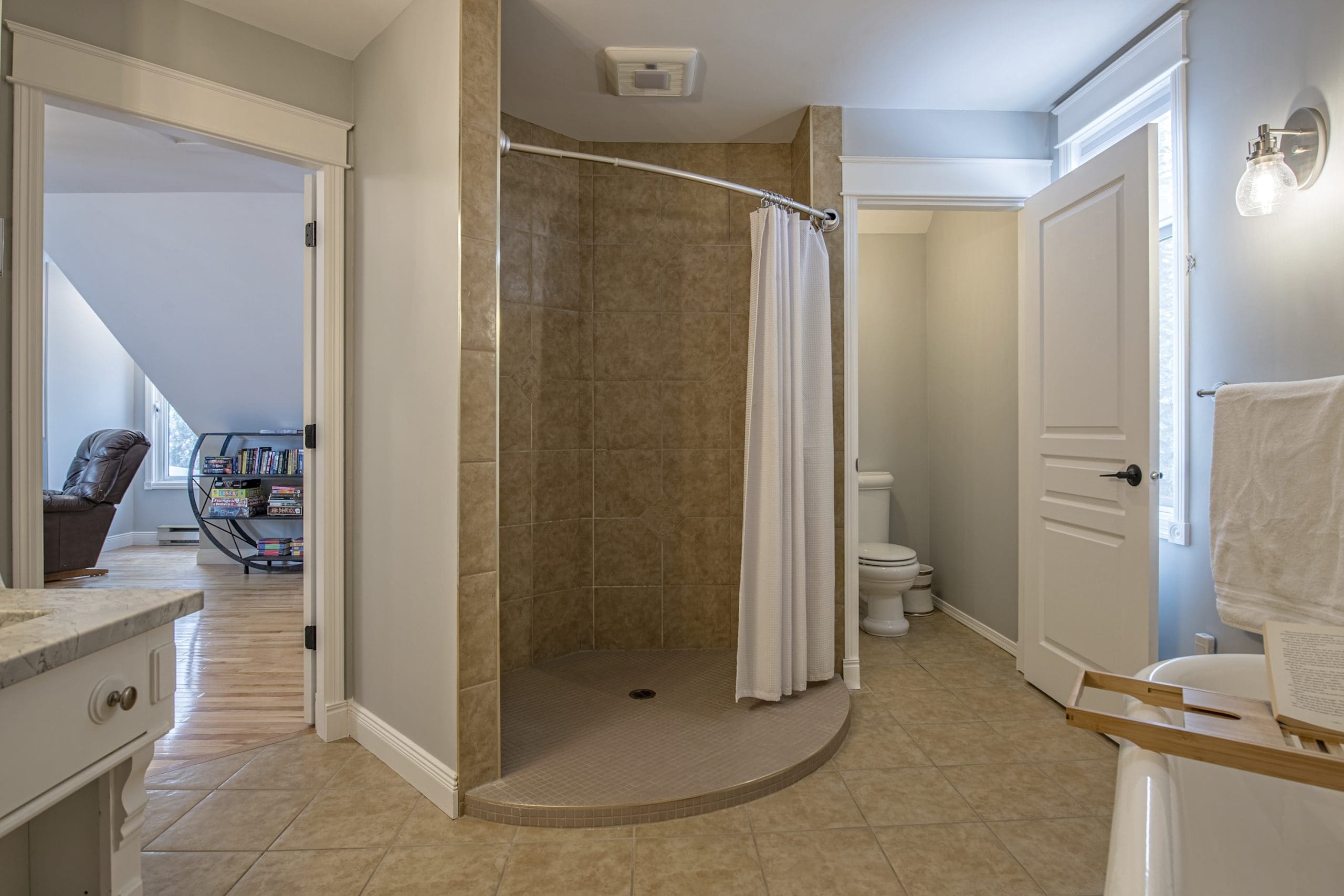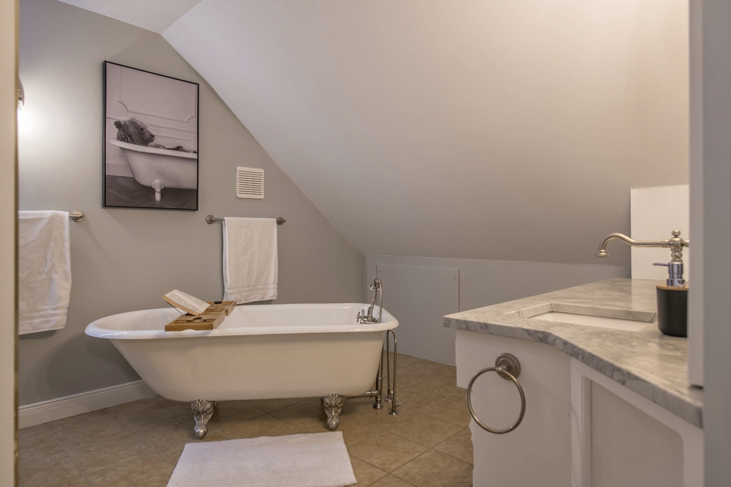 The bathroom layout on this level ensures convenience and privacy, with separate areas for bathing and grooming. Separate rooms house the clawfoot tub and a sink, the stand-up shower, and the toilet with an additional sink. This thoughtful arrangement caters to the needs of large groups, ensuring simultaneous access to all facilities.