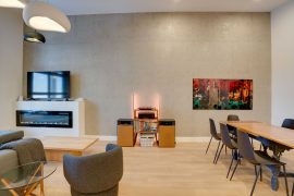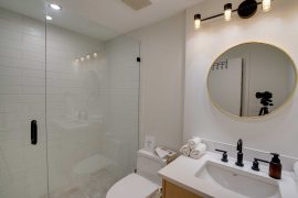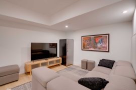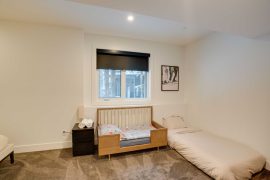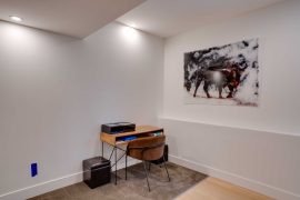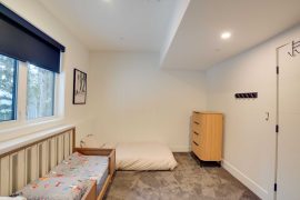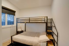 When you arrive, enter the duplex through the large front door and head right up to the second floor. This floor is an open concept TV room with semi-private sleeping quarters. This room is perfect for kids or any guests that want to hang out together but have the added privacy of room dividers in the sleeping areas. The TV area has a cozy pullout couch – perfect for après ski movies and there is a full bathroom on this level too. There is also a new 4th bedroom on the lower level/den area with a Queen bed – photos to come.