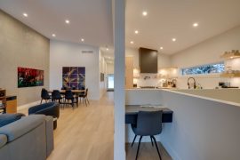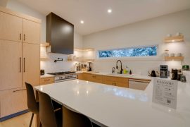 From here, head upstairs to the incredible main living area of the house. With the vaulted ceilings, cement walls and large windows this is the best place to take in the views and relax after a fun day on the mountain. At the end of the day, cozy up in front of the fireplace with your book or you can put together a gourmet meal in your upgraded kitchen. Just off the main living area, you’ll also find all three bedrooms and the back deck where you have access to your private hot tub.