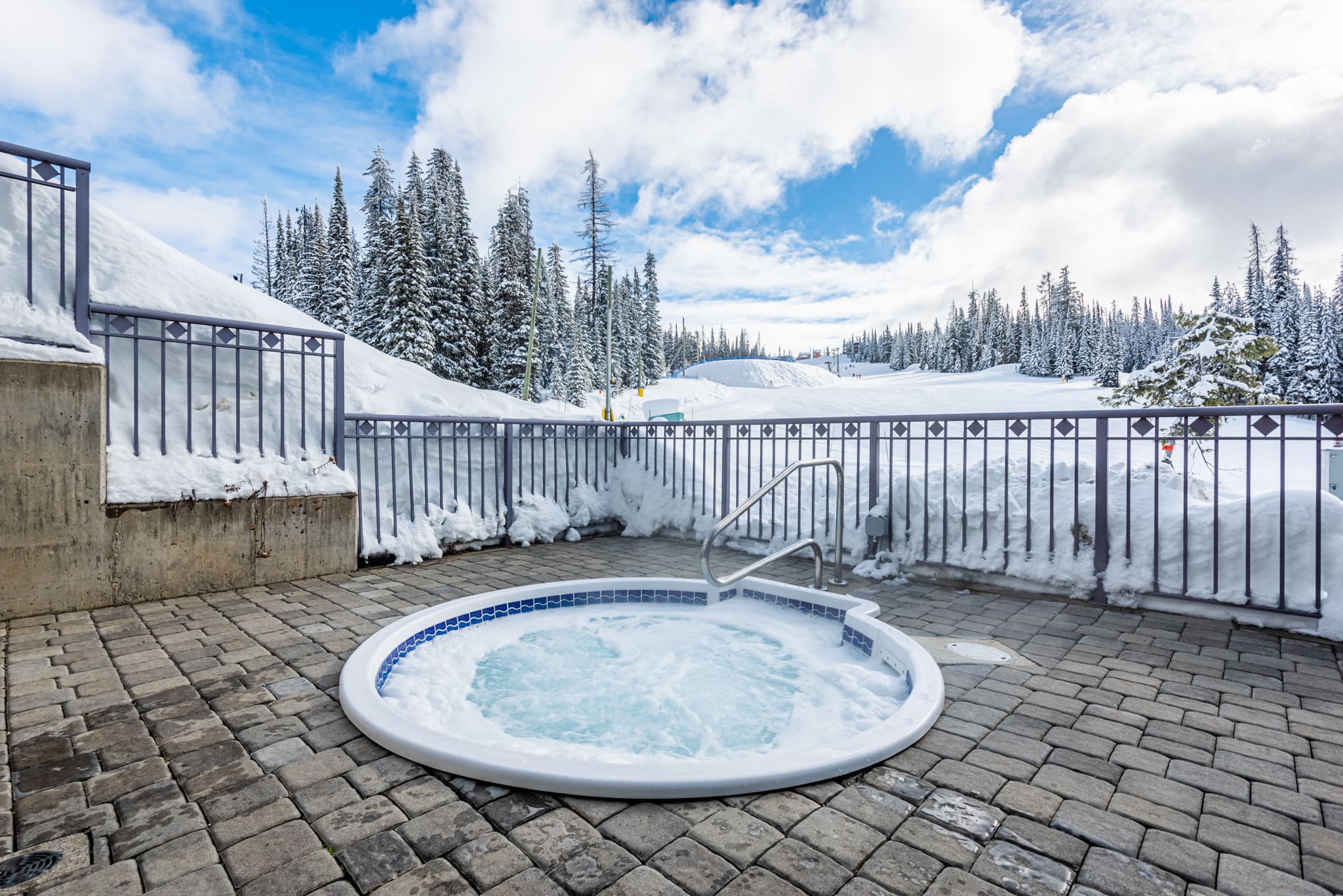 The shared outdoor hot tub in the Foxglove building in Creekside is open during the ski season only. For the summer season, there is one hot tub open in the Creekside complex for all guests to use.