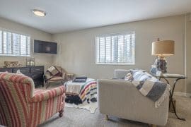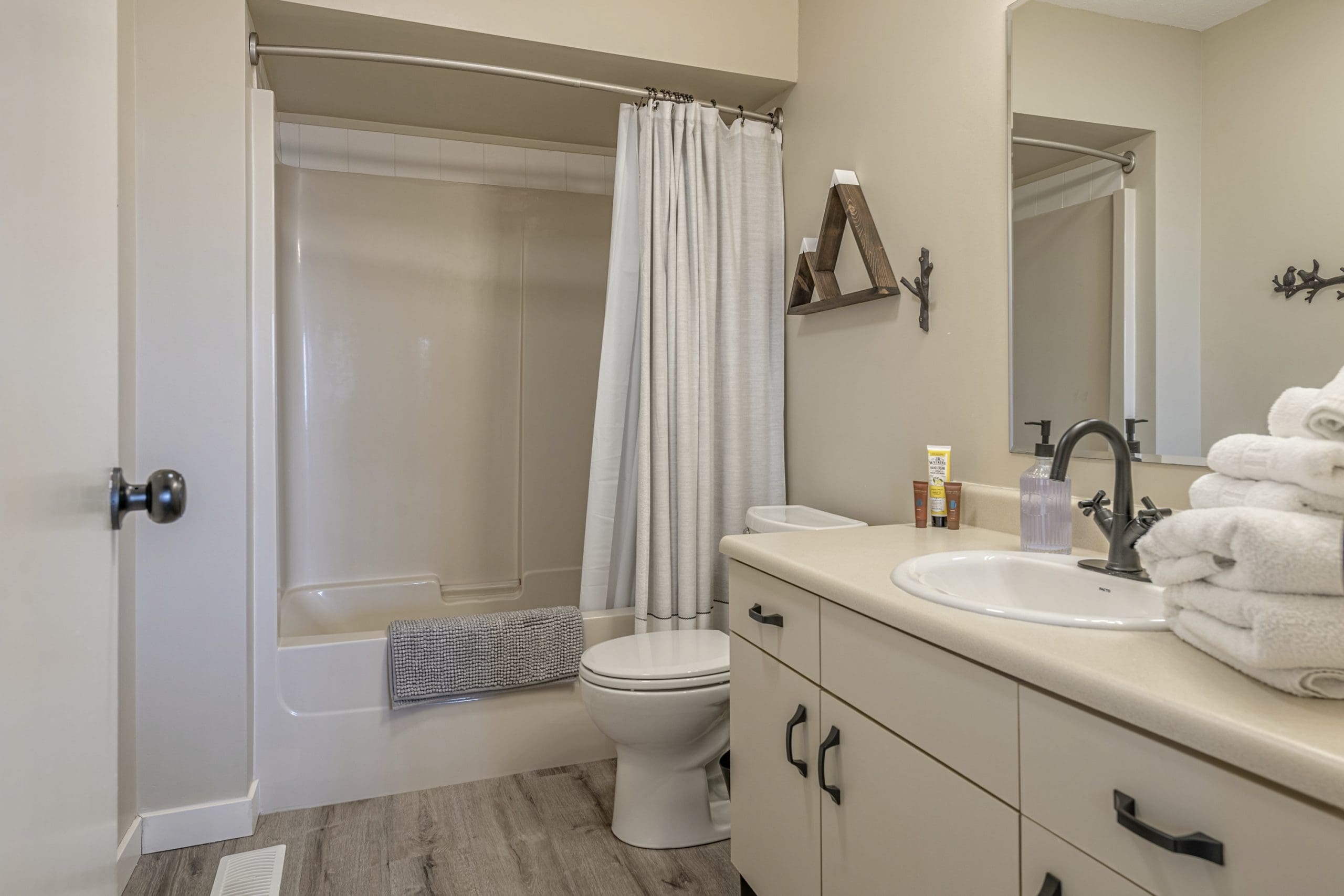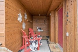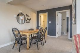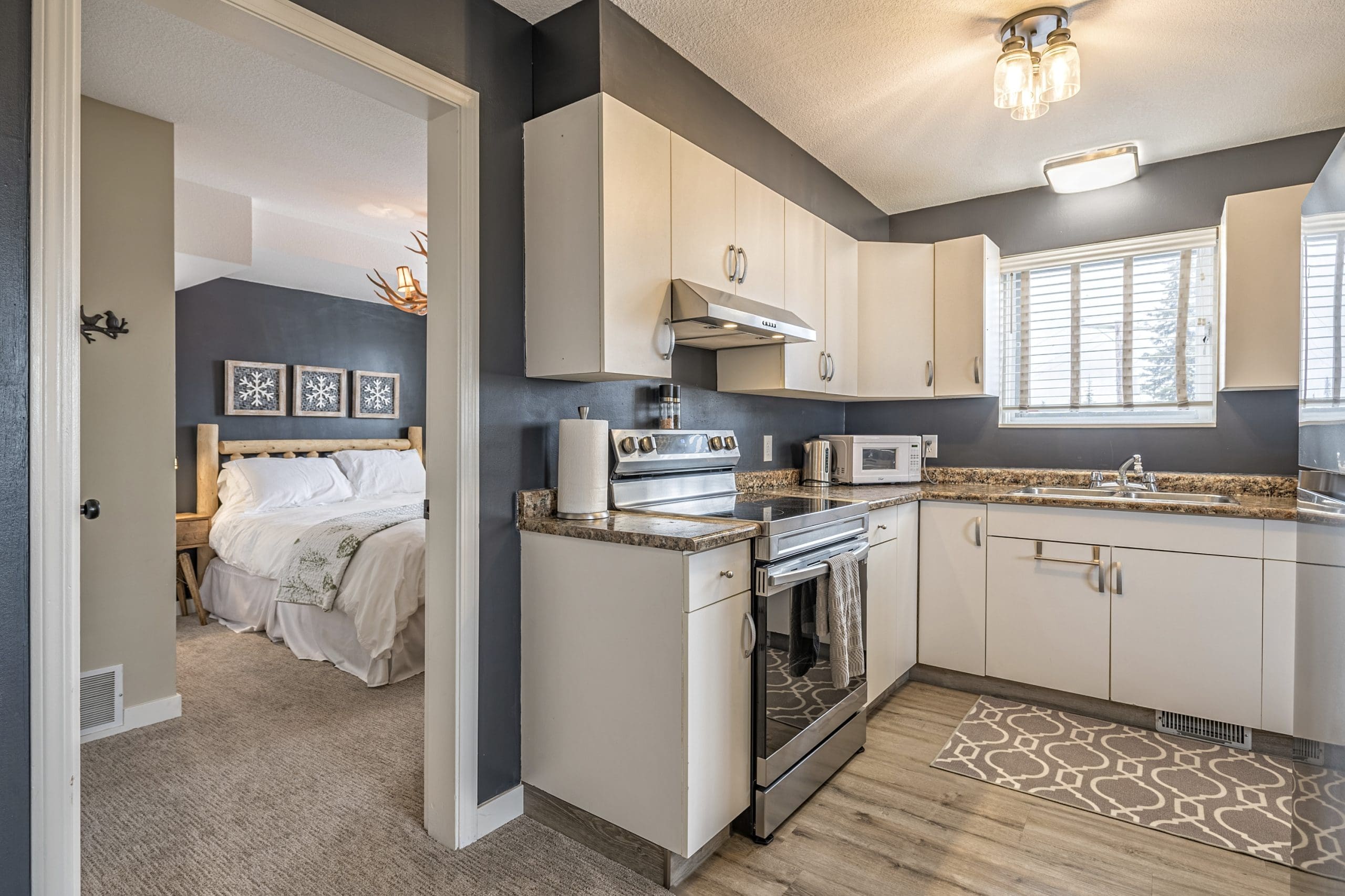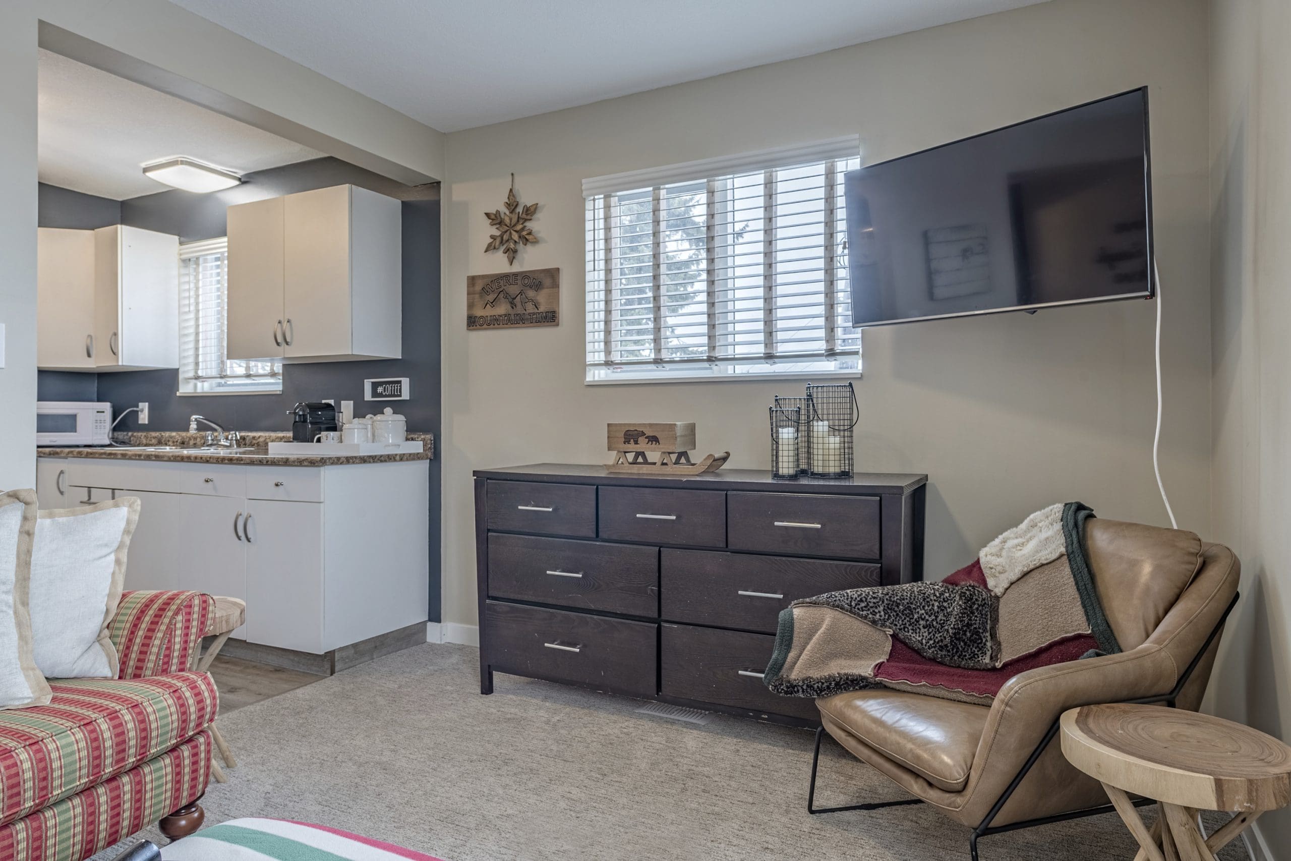 Head through the red front door to your bright and cozy suite. Coco’s Corner has a living room with a pullout couch, dining room and a kitchen that has everything you need! When the sun is shining, there is no better place to be then reading a book on the couch. This suite is perfect for a couple or small family while you’re exploring the mountain.