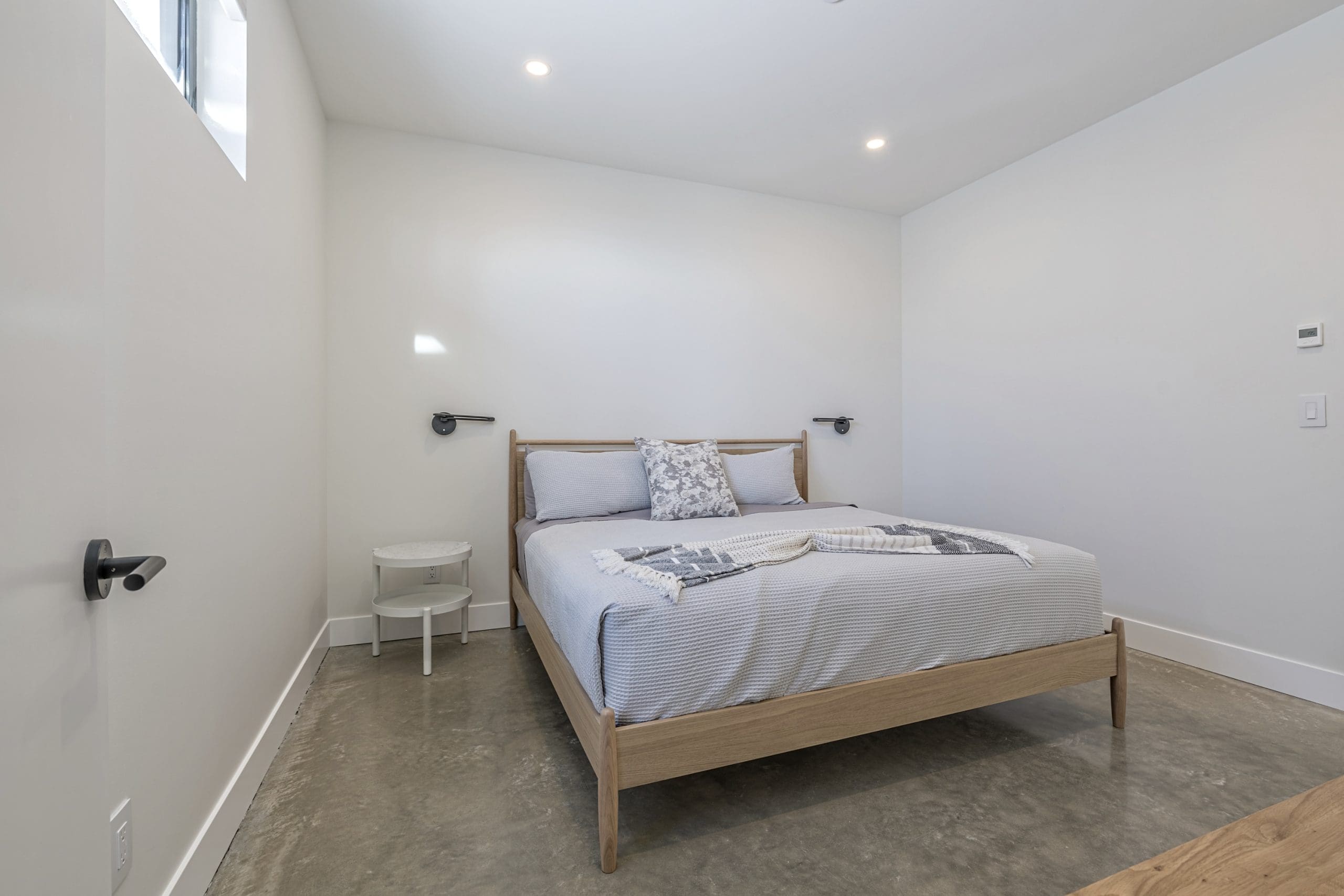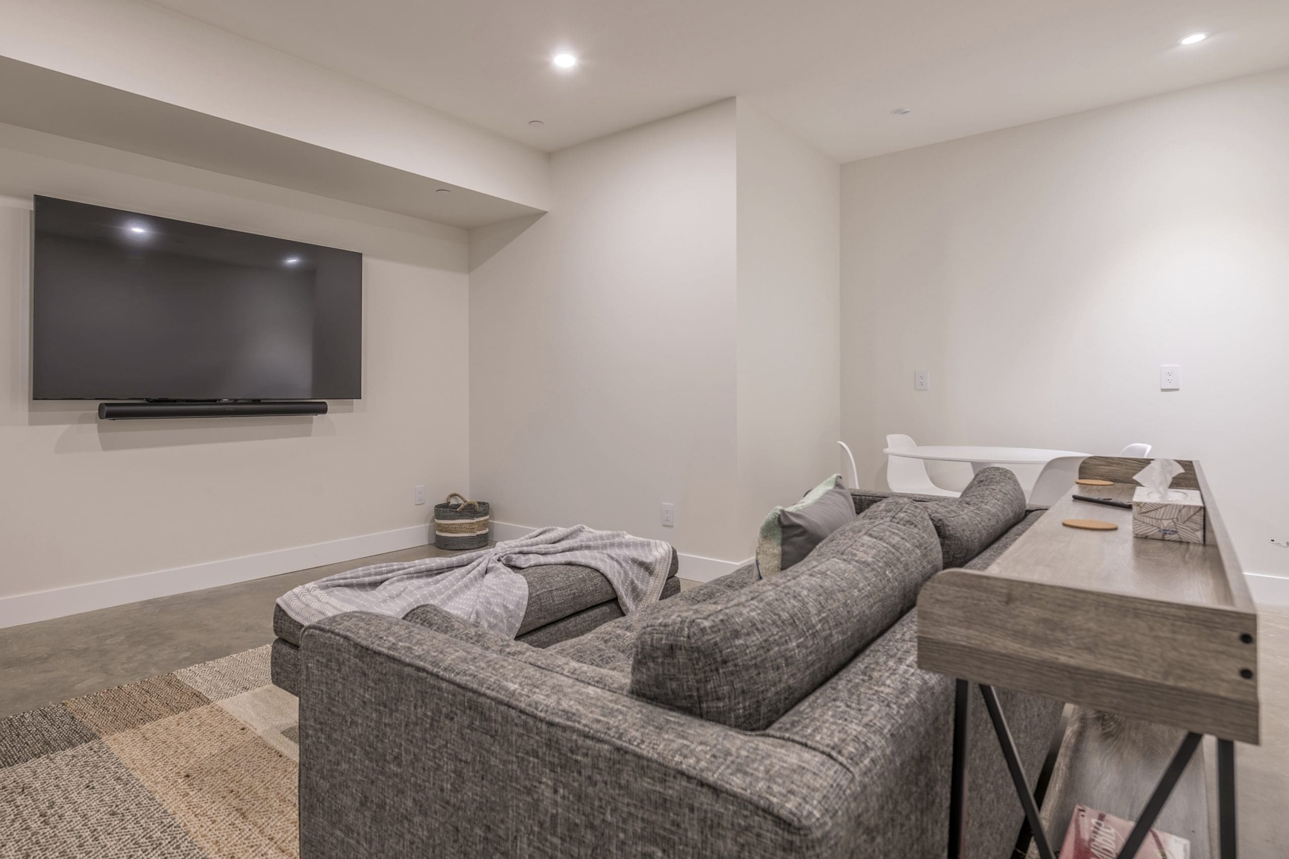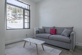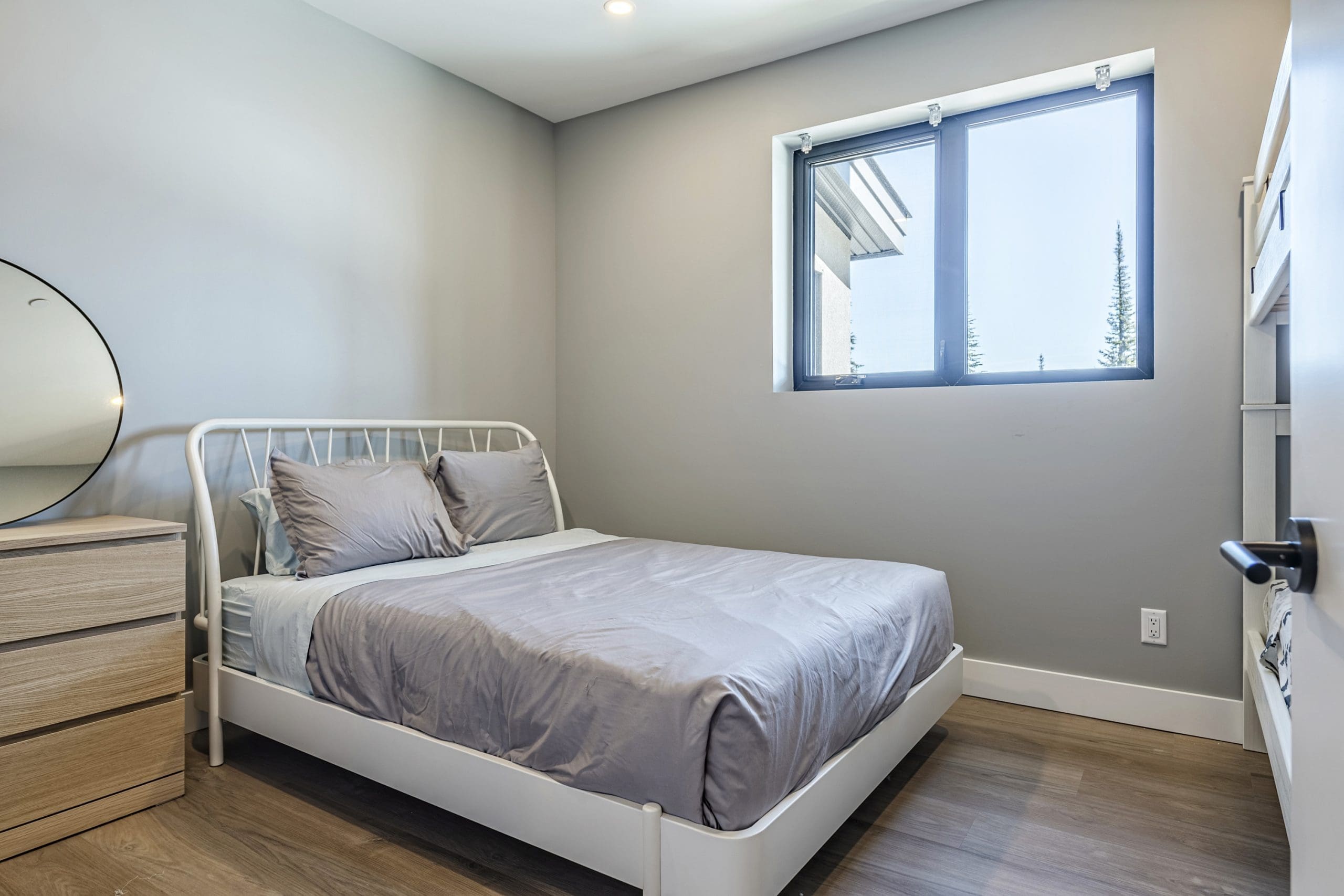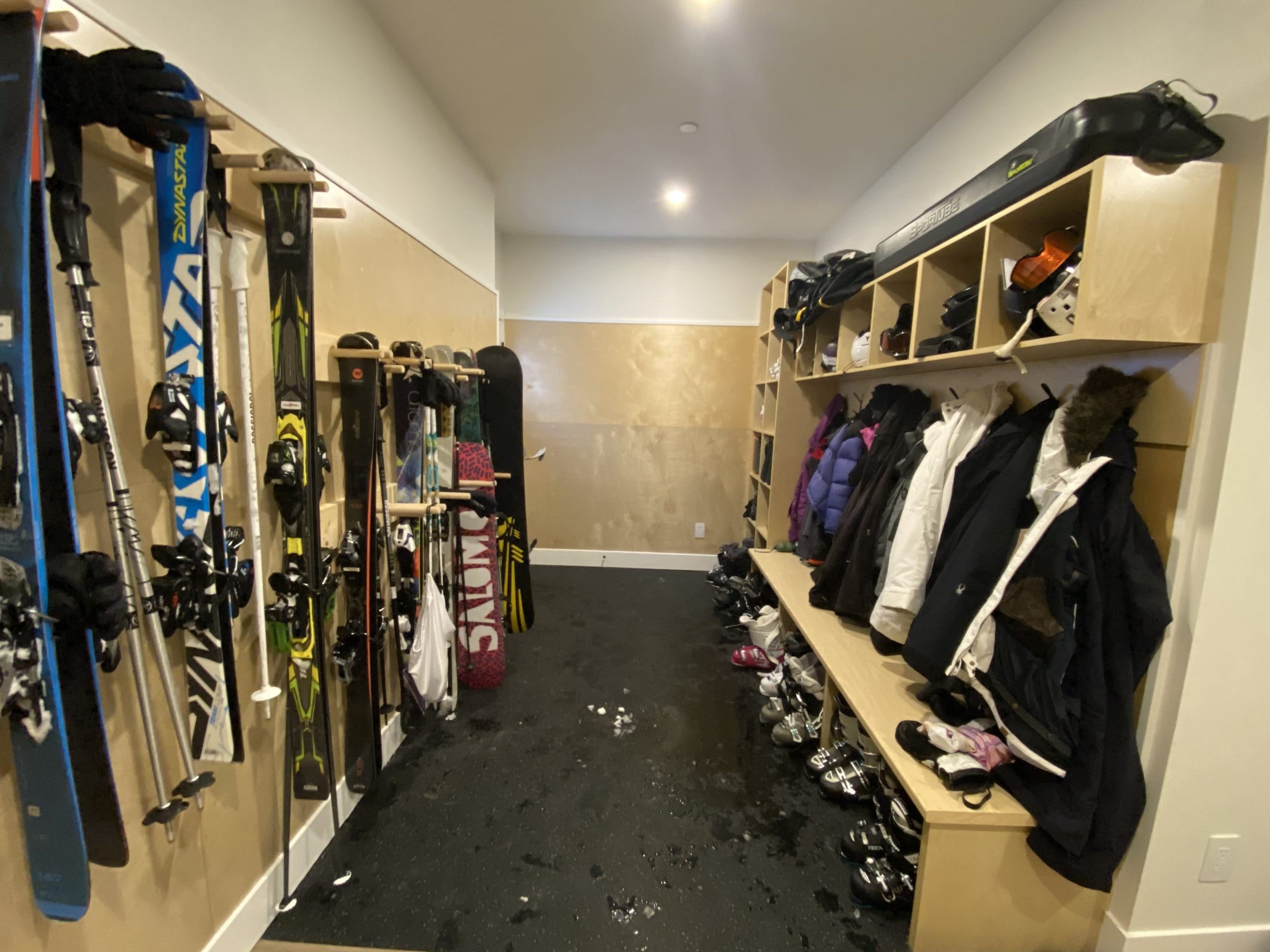 From here, you’ll head down to the suite that can be accessed via an internal door through the massive ski room. The suite has one bedroom with a queen bed and single/single bunk beds – perfect for a small family. You’ll also find a full bathroom, second laundry room and open living with pullout couch, dining room and kitchen. Just off the living room, you have a second ski room and access to a second hot tub. Can it get any better than this?