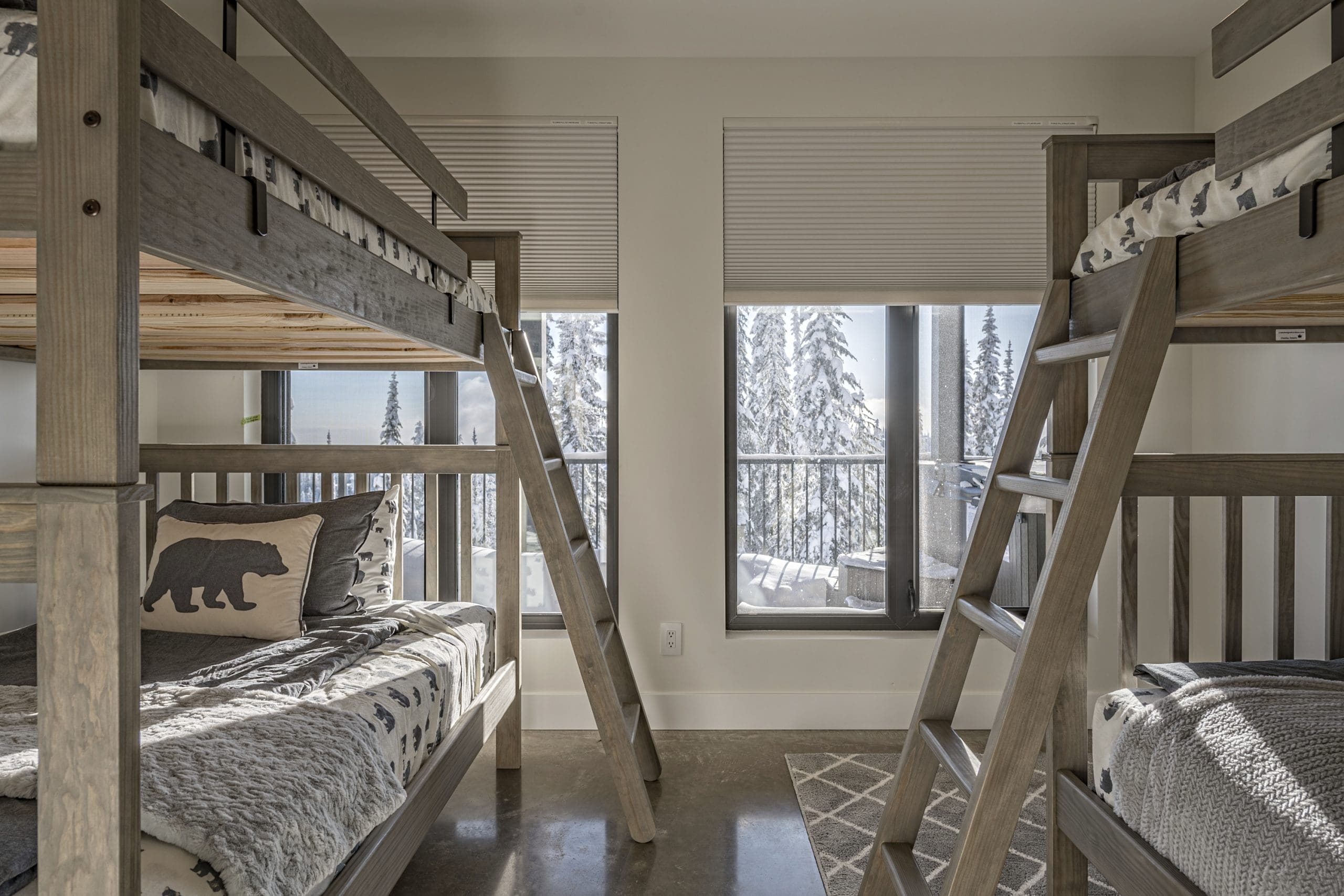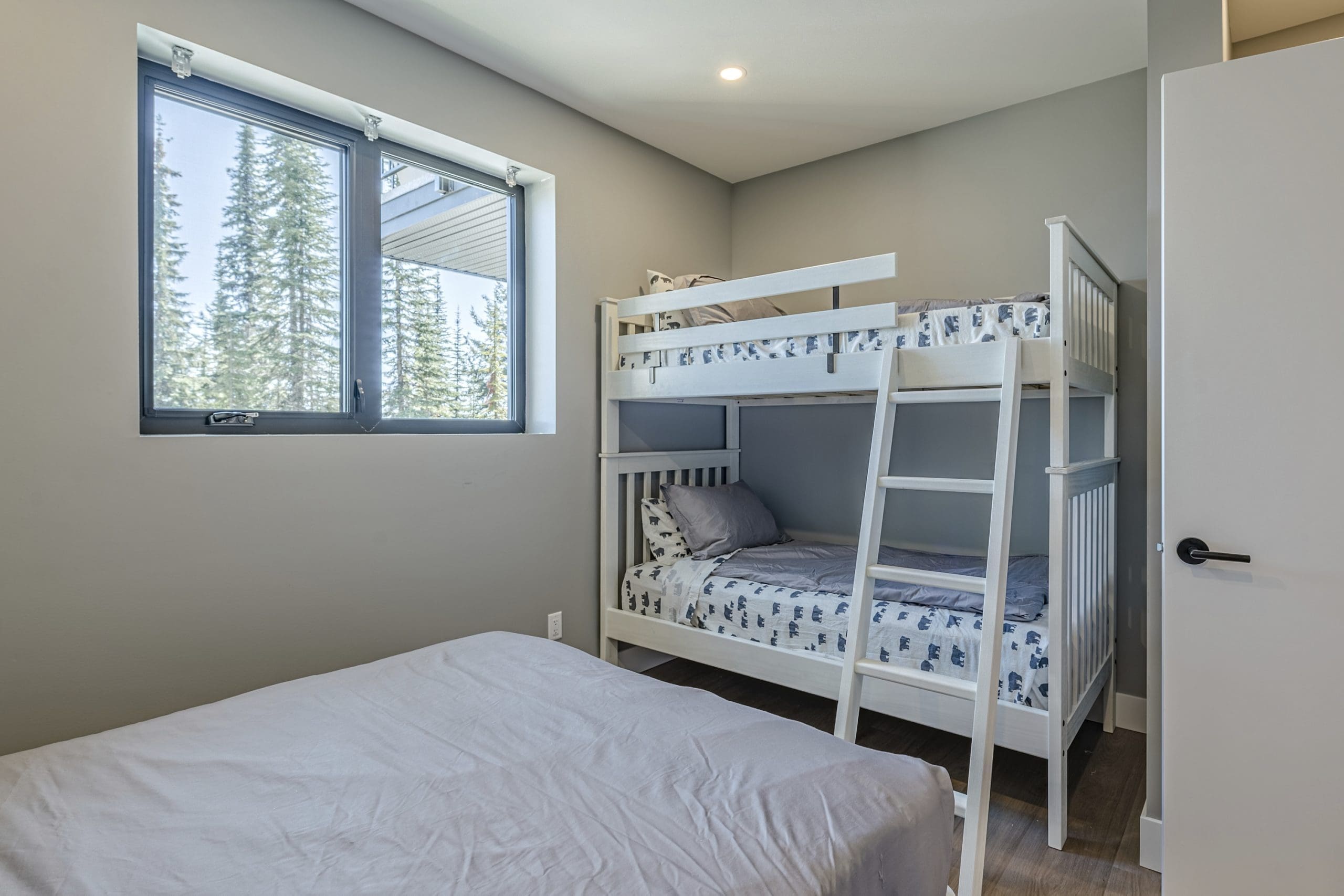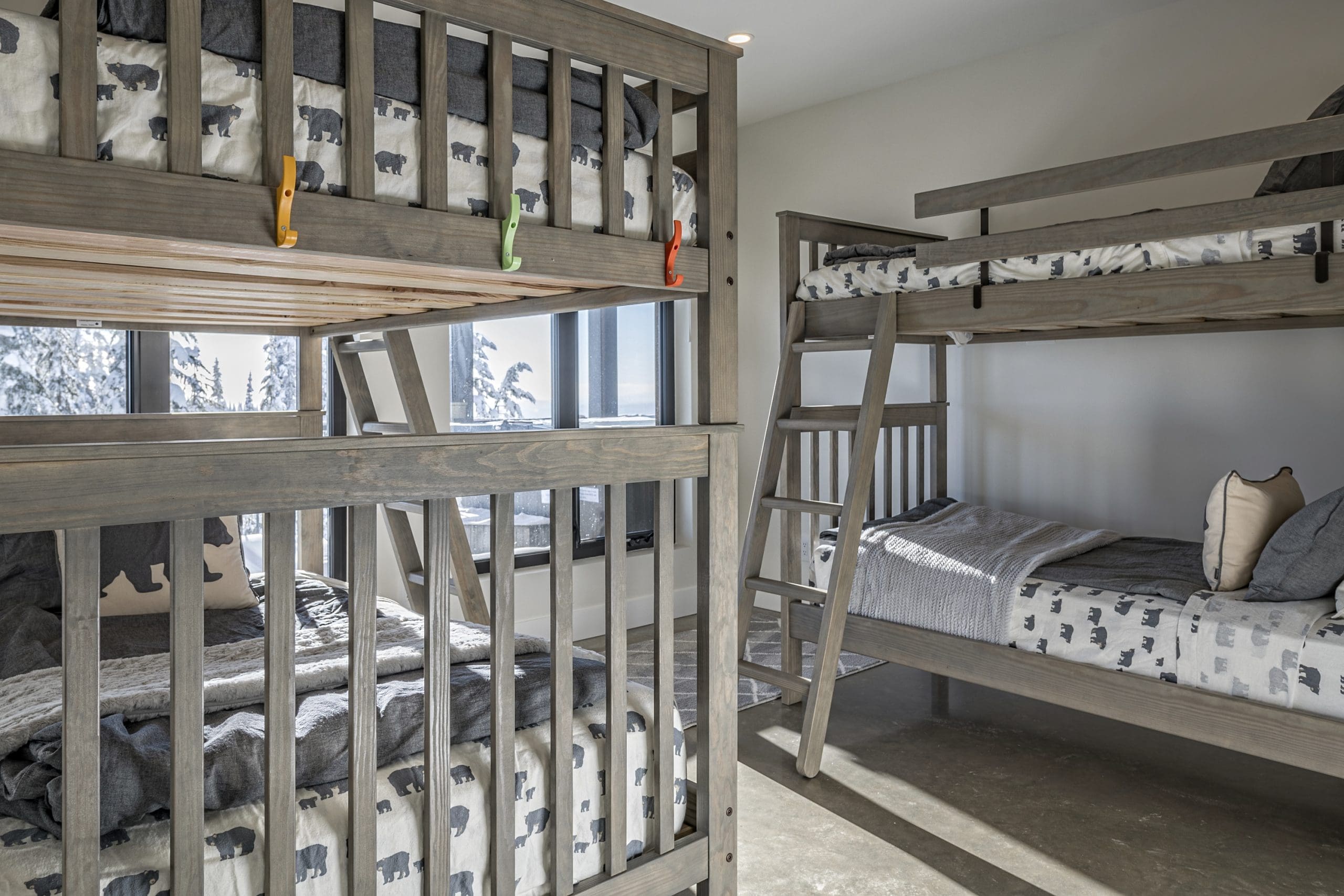 Head downstairs to the bedrooms and the large media room. The media room is set up perfectly for the kids. It has a large TV and cozy couch to cozy up on and watch movies at the end of the day. The master bedroom has a king bed and those same amazing views from the main floor. The master also has a jack and jill ensuite with a stand up shower and soaker tub. On this level, you’ll also find the other king bedroom, the bunk room and the hot tub on the deck off the bedrooms. Soak in the hot tub at the end of a long day on the mountain with those views!