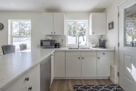 The suite has an open and updated living room, dining area, and kitchen. Right from the kitchen, head out to your deck that has a private hot tub and BBQ for you to use.