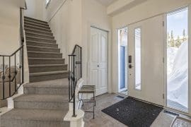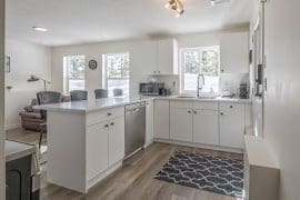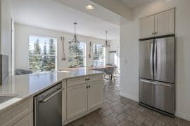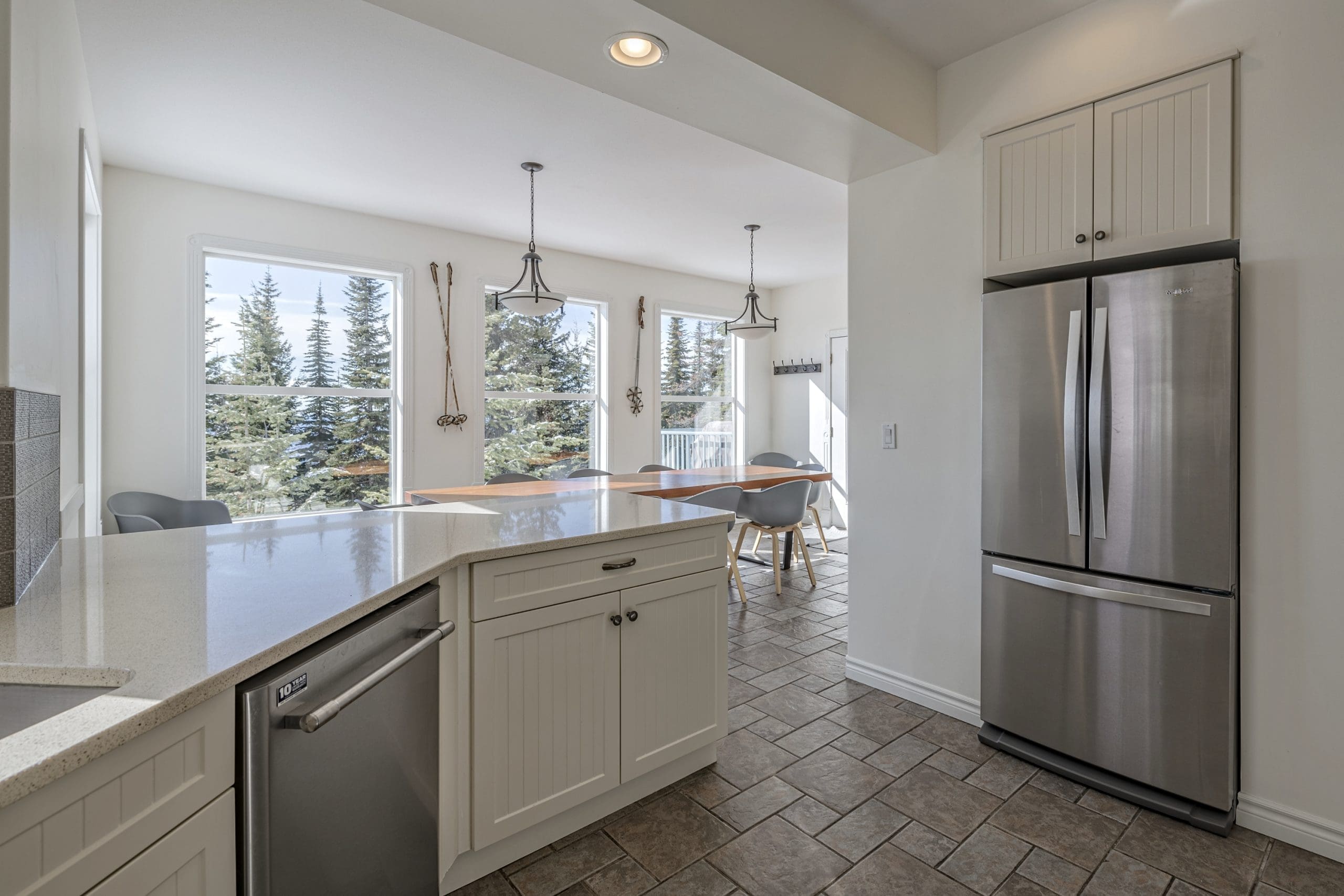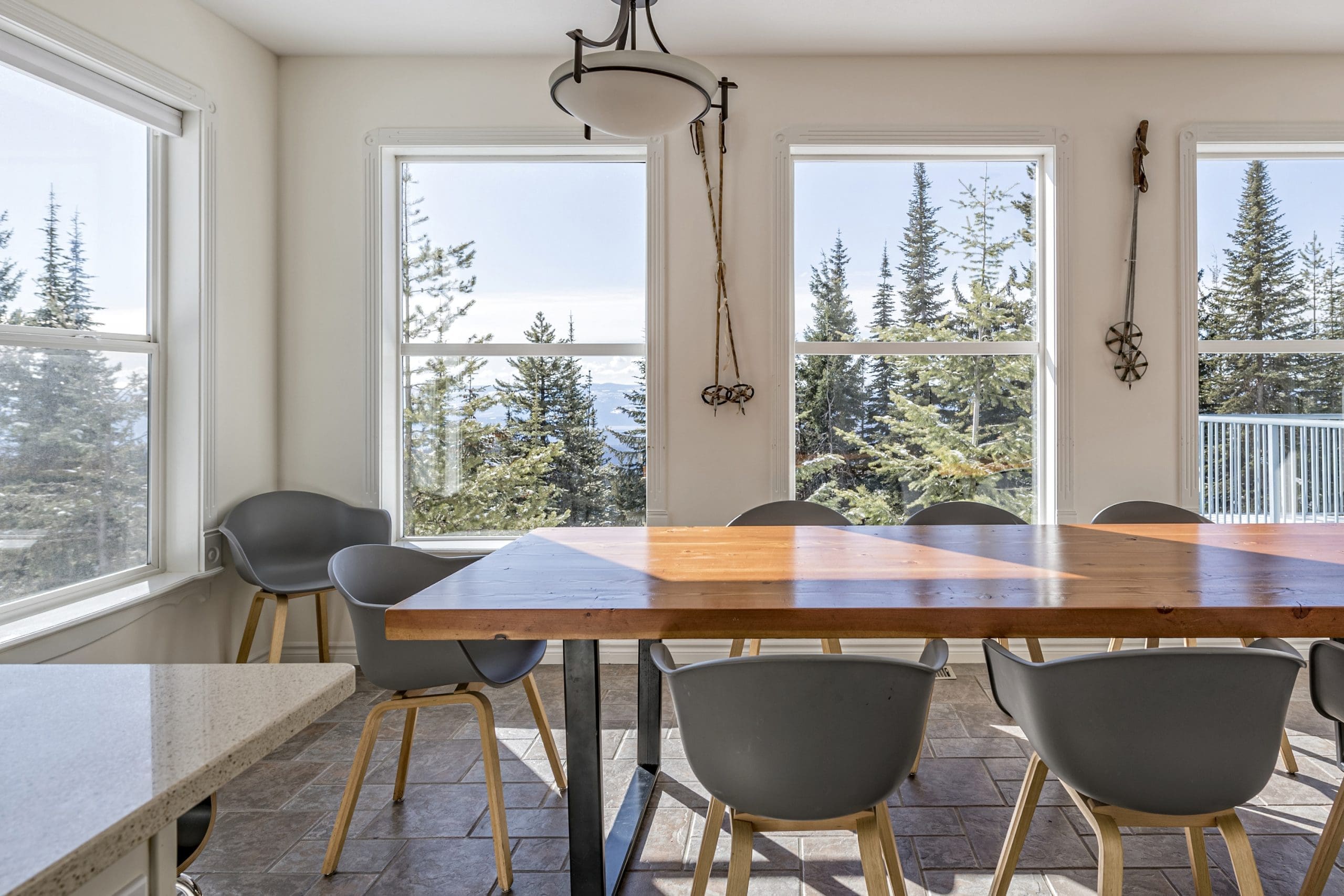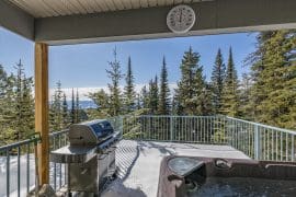 The main living area is accessed right from the front door and there is even a bedroom on this level – perfect location for anyone that wants to be close to all the fun. The main living area has a large living room, dining room with views of the Monashees, and a large dining table that seats 10. The fully equipped kitchen opens up to the dining area – perfect for visiting and cooking together after a day full of activities. There is a large patio off the dining room that has a BBQ and your private hot tub too!