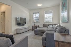 From the main floor here, head up stairs to the 3 other bedrooms and a loft area with a TV and sectional. It’s the best spot for kids to hang out and watch movies while everyone else relaxes downstairs.