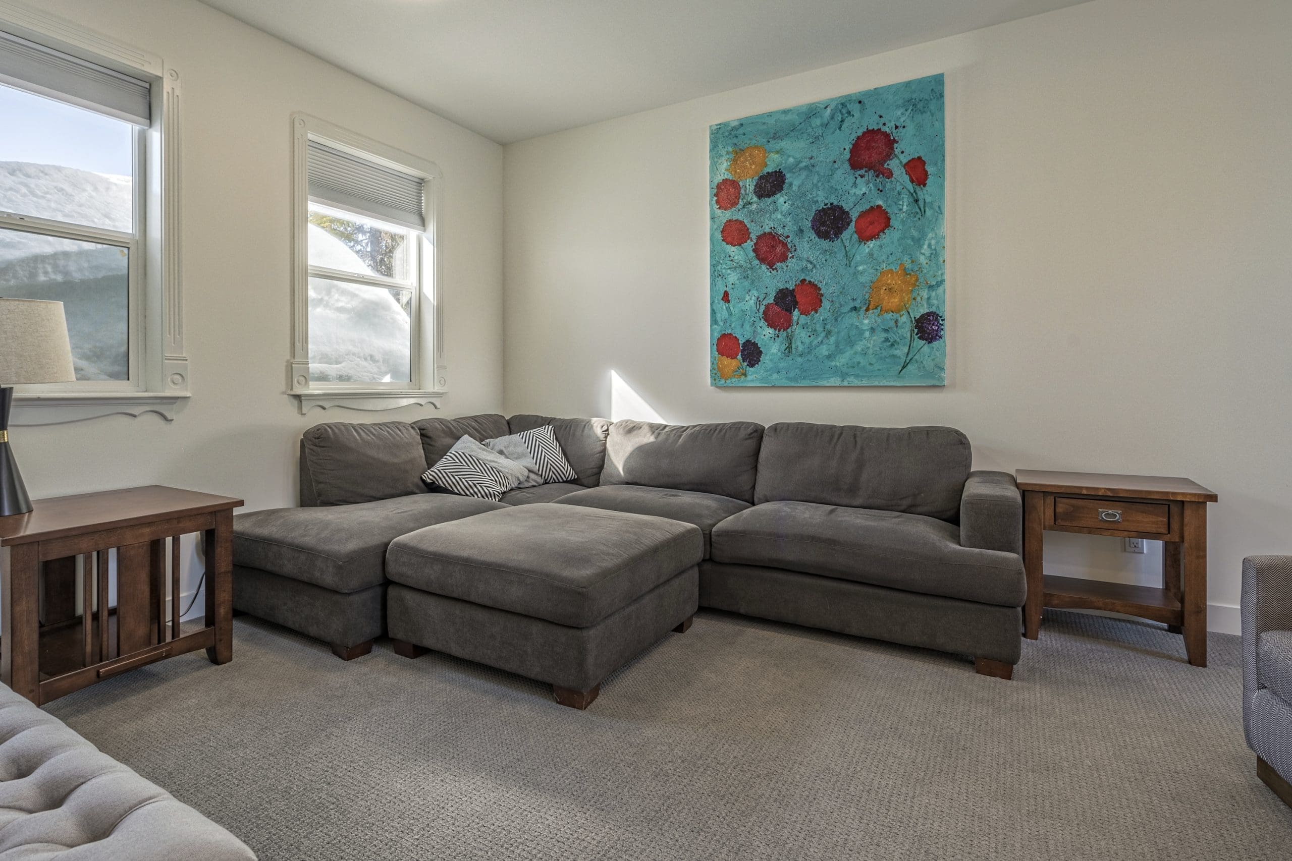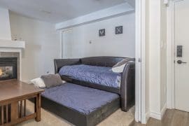 The spacious suite is accessed by an interior door and down a set of stairs. This is where you would find a second kitchen, living area, and the other bedroom and private den with gas fireplace and TV. If you’re coming to visit with a couple of families, this is a great space for grandparents or anyone that needs a little extra space. You’ll also find a second BBQ and hot tub for you to use.