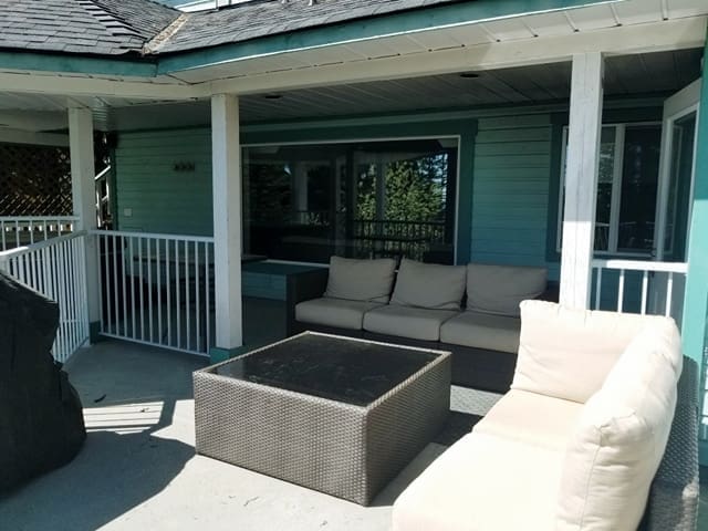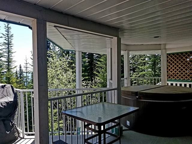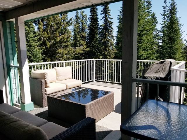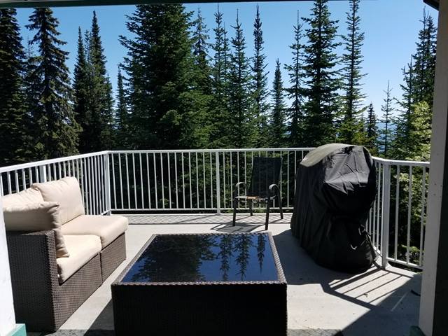 The hot tub and BBQ are located on the back deck on this floor, which is nestled in the woods with a lovely view of Monashee Mountains.