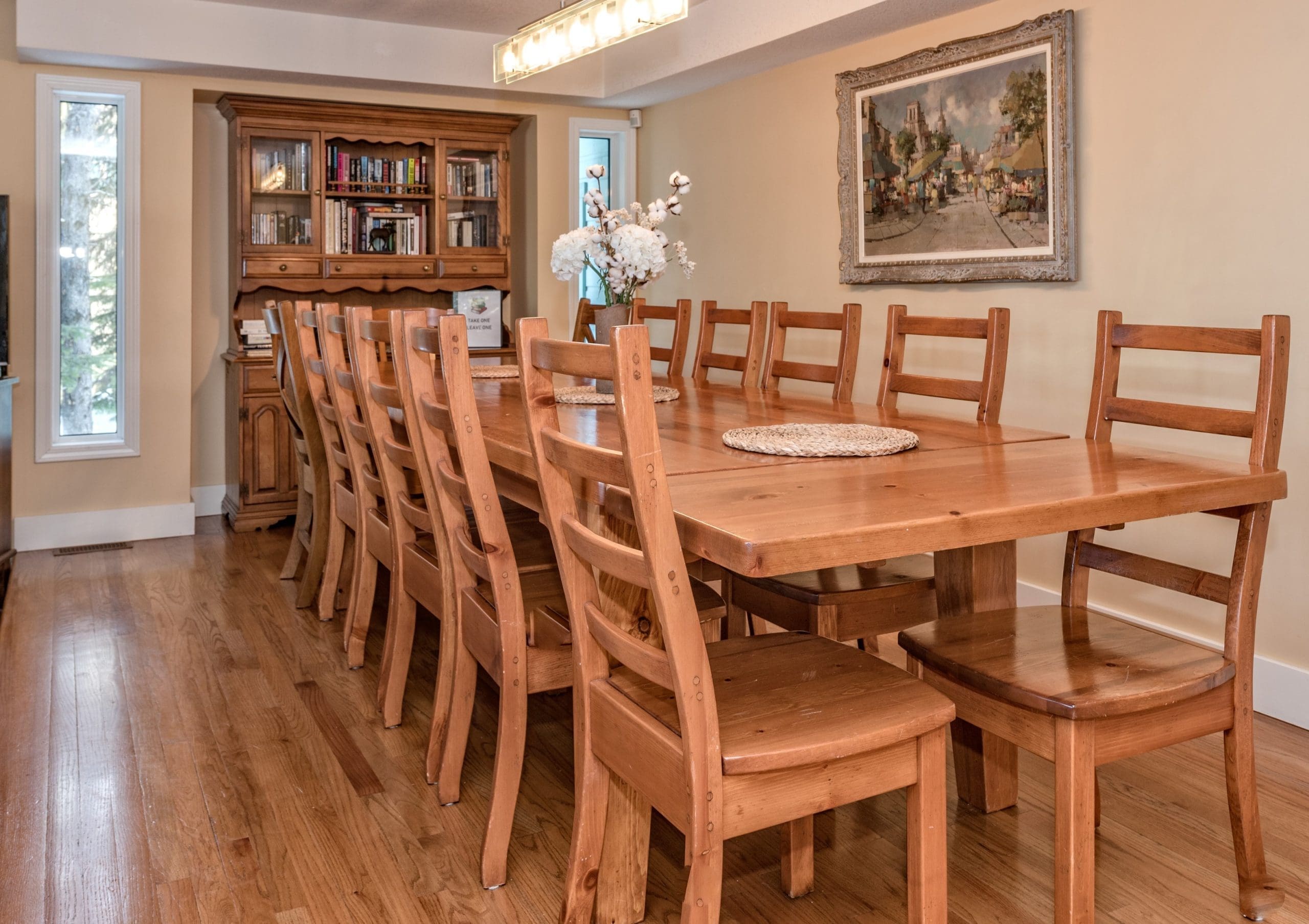 The ground floor has the living/study room with sectional and sofa and T.V. There are 3 dining areas sitting sixteen in total.