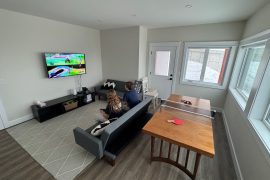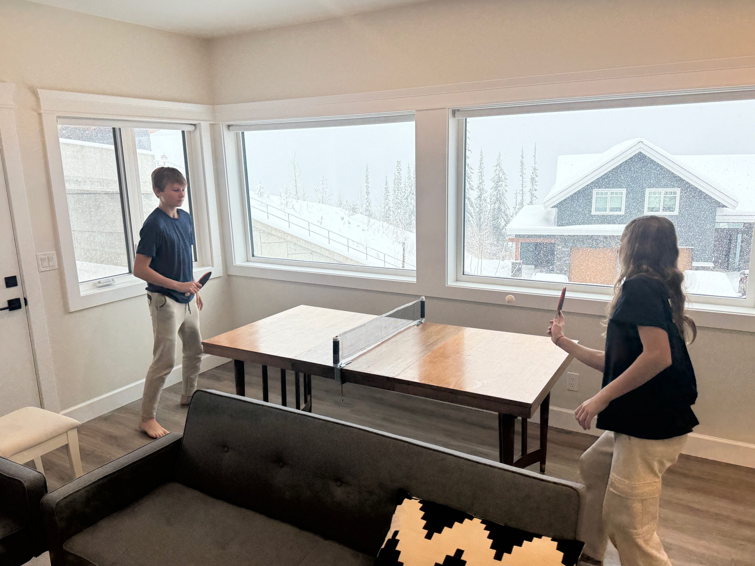 Walk in the front door to the ground level, this is where you will find a large ski/gear room – easy to head right out the door for first trails or tracks. There is also the private den/family room with a large Smart TV, Wii and games table with a modified ping pong net and paddles and two pullout couches (perfect for kids!), one of the king bedrooms with ensuite and a powder room.