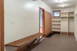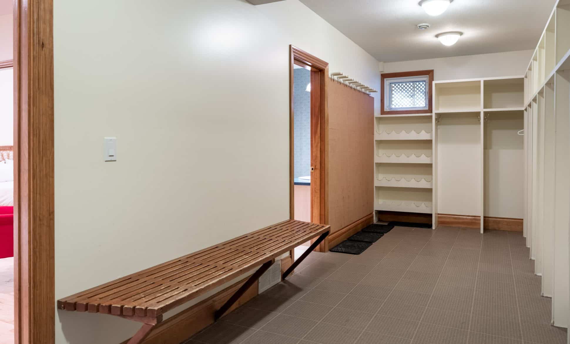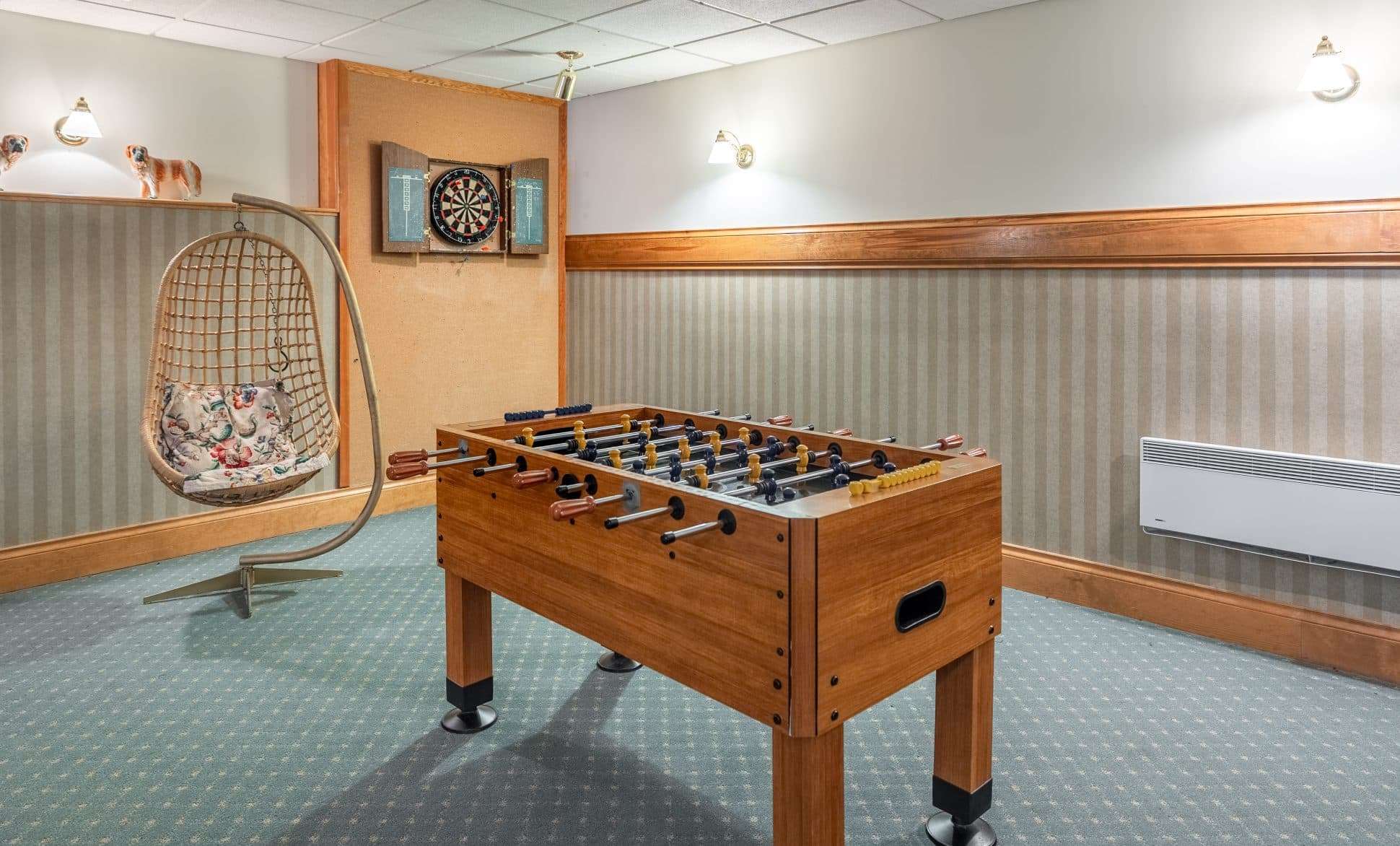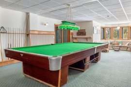 From the main living area, head downstairs to the games room which is a perfect spot to wind down at the end of the day. You’ll find a full size snooker table, foosball table and bar. On this level, you will also find the bedroom with the bunk beds and double bed behind a private door within the room. There is a full bathroom on this level too. This is also where you will access the skiway and where you can store all of your gear. One of the hot tubs is also on this lower level.