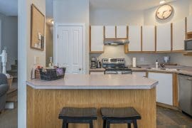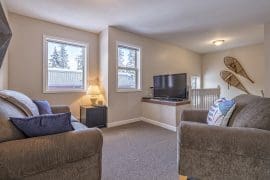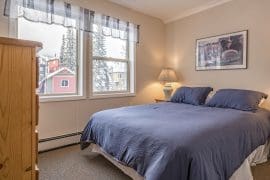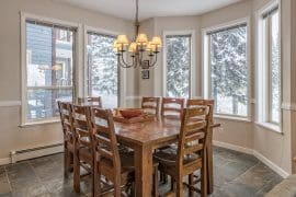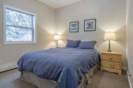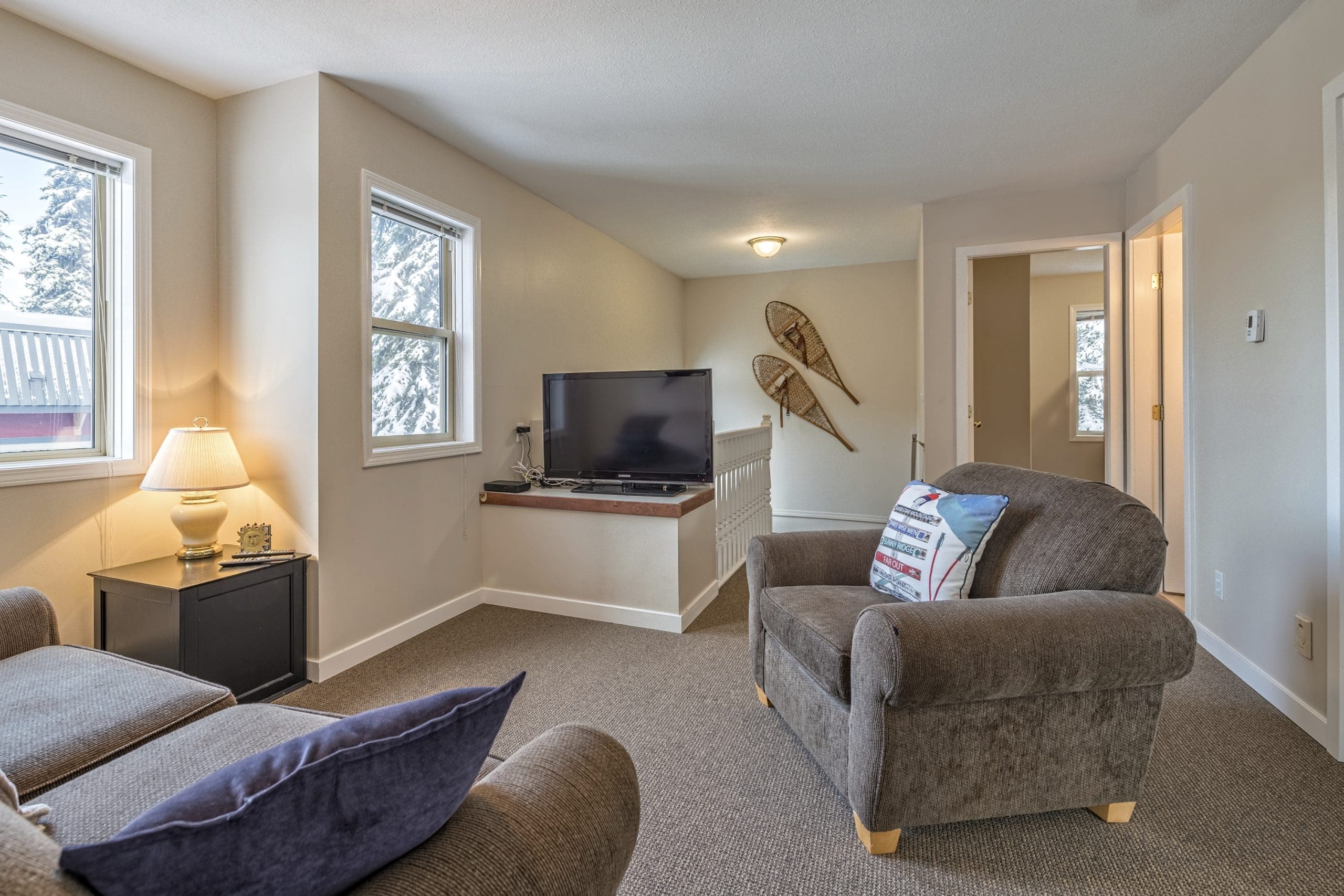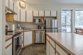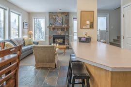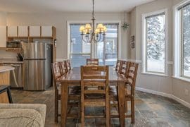 The main living area has large windows and a nice open concept kitchen, living, and dining area. This is the perfect spot to spend time with your family after a long day of skiing or biking. There is also a bedroom, bathroom with a stand-up shower, and laundry on the main level.