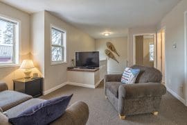 From here, head upstairs where you will find a family room with a TV (and the pullout couch), three bedrooms, and 2 bathrooms. All bathrooms have been recently renovated and now have heated floors – perfect for those chilly days!