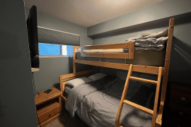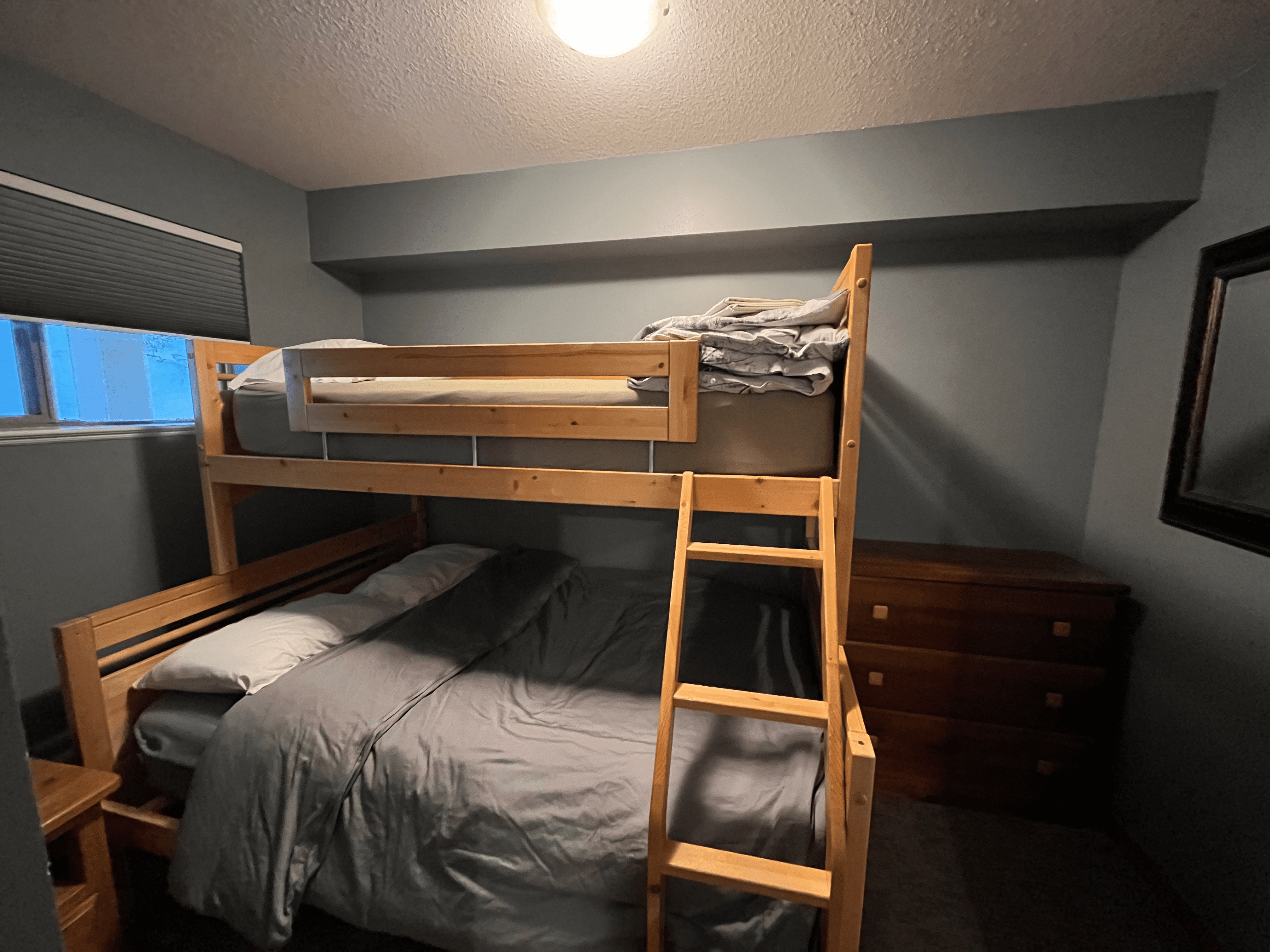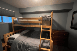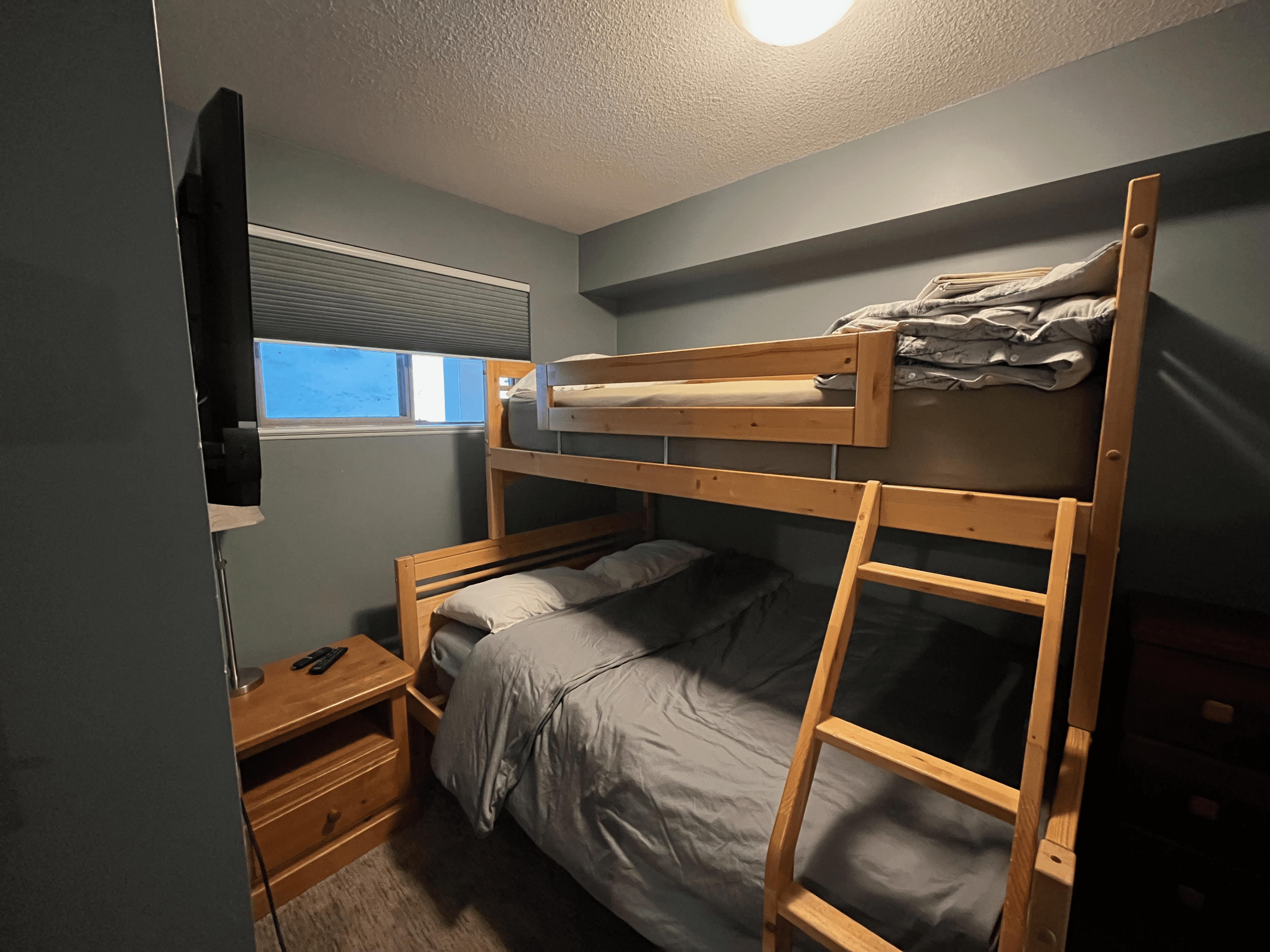 Bedroom Two: Double/Single Bunk bed (sleeps 3) with flat screen Roku TV – perfect for the kids!