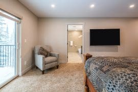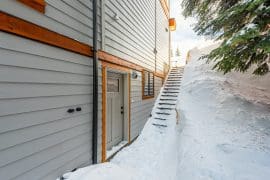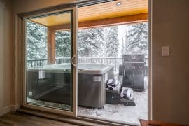 Once you arrive, walk through the grand front door into a large entryway, enough room for everyone and their belongings. On this level, you will find a large bedroom with a beautiful ensuite with large soaker tub and sitting area overlooking the mountains. With sliding glass windows and a balcony beside the bed you can watch the magnificent sunrise right from your king-size bed. In this bedroom, there is also a small kitchenette with a coffee pot, small fridge, toaster and more. There is also a laundry room; perfect for when you walk in the door from a long day of skiing, biking, or hiking.