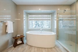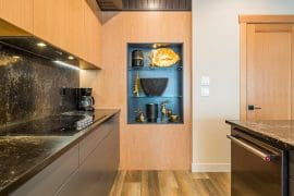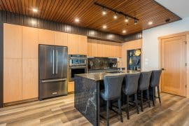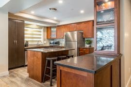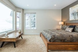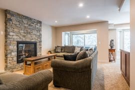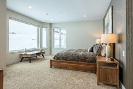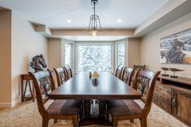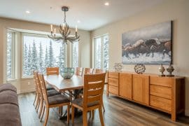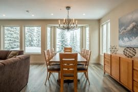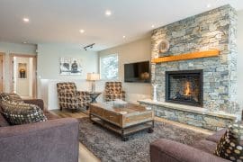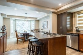 Head up one level to the best spot in the house – the penthouse. This penthouse has a large, modern kitchen, dining room and living room with spectacular mountain views. The large master bedroom is also on this floor with a king sized bed, sitting area, and huge ensuite with stand-up shower, double sinks, and soaker tub.