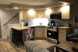 From the entry level, walk down to the ground floor level where you will find a cozy second living room with three full couches, a gas fireplace, a dining room, and a second half kitchen. The kitchen has everything but a stove/oven, plus extra cupboards to store extra food, make small snacks, coffee in the morning, or whatever you feel like.