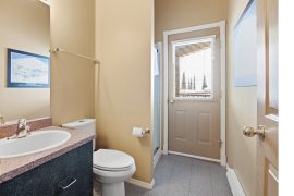Step inside the front door to the main level of the house. This is where you will find the cozy living room with a beautiful gas fireplace, dining room with large table and fully equipped kitchen. If you head down the hall from the living room, you’ll see the private den with a pullout couch and TV – there is a door if you’d like to make this a bedroom for your stay. This is also where you will find the washer, dryer and full bathroom.