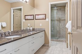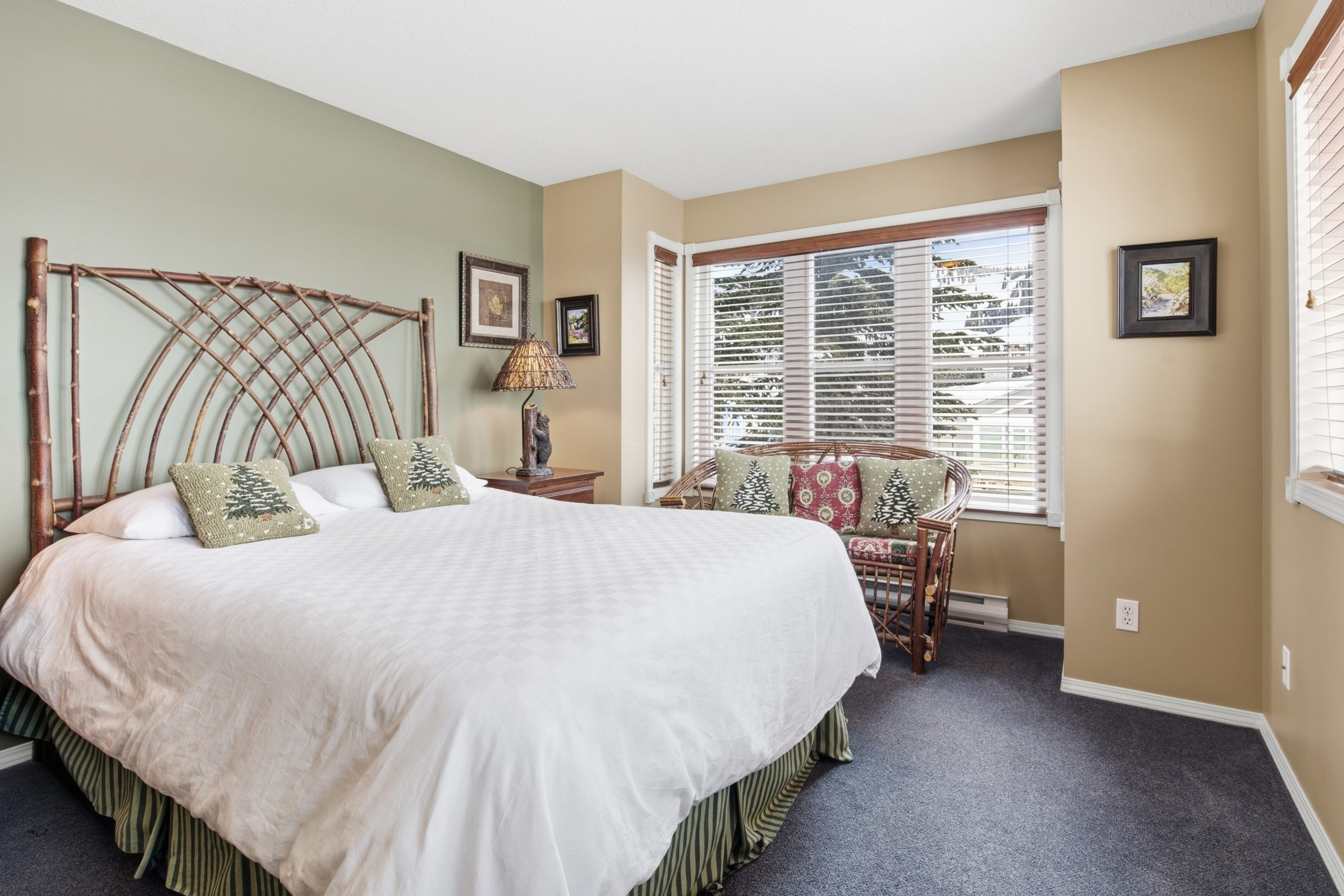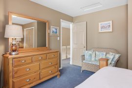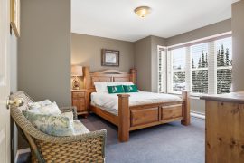 Head upstairs and you’ll find all three bedrooms. The large master bedroom has lots of windows, views of the mountains and an ensuite with a lovely walk-in shower. On this level, you also have the bedroom with a queen bed, bunk room (perfect for kids!) and a full bathroom.