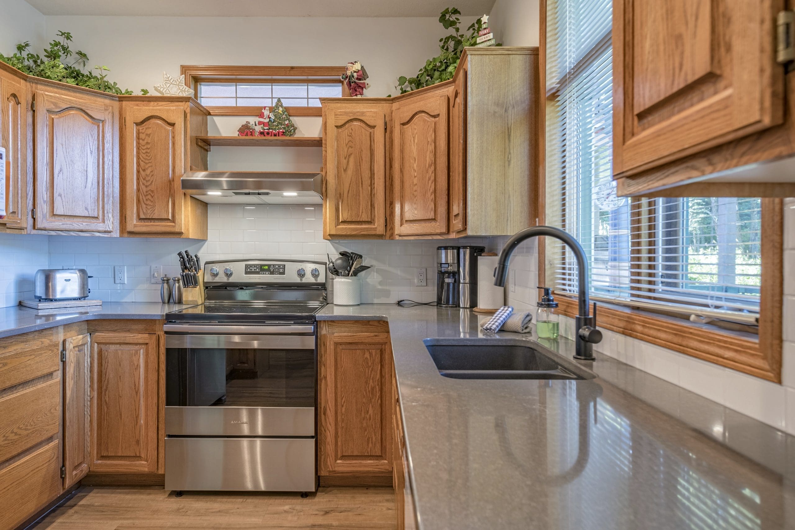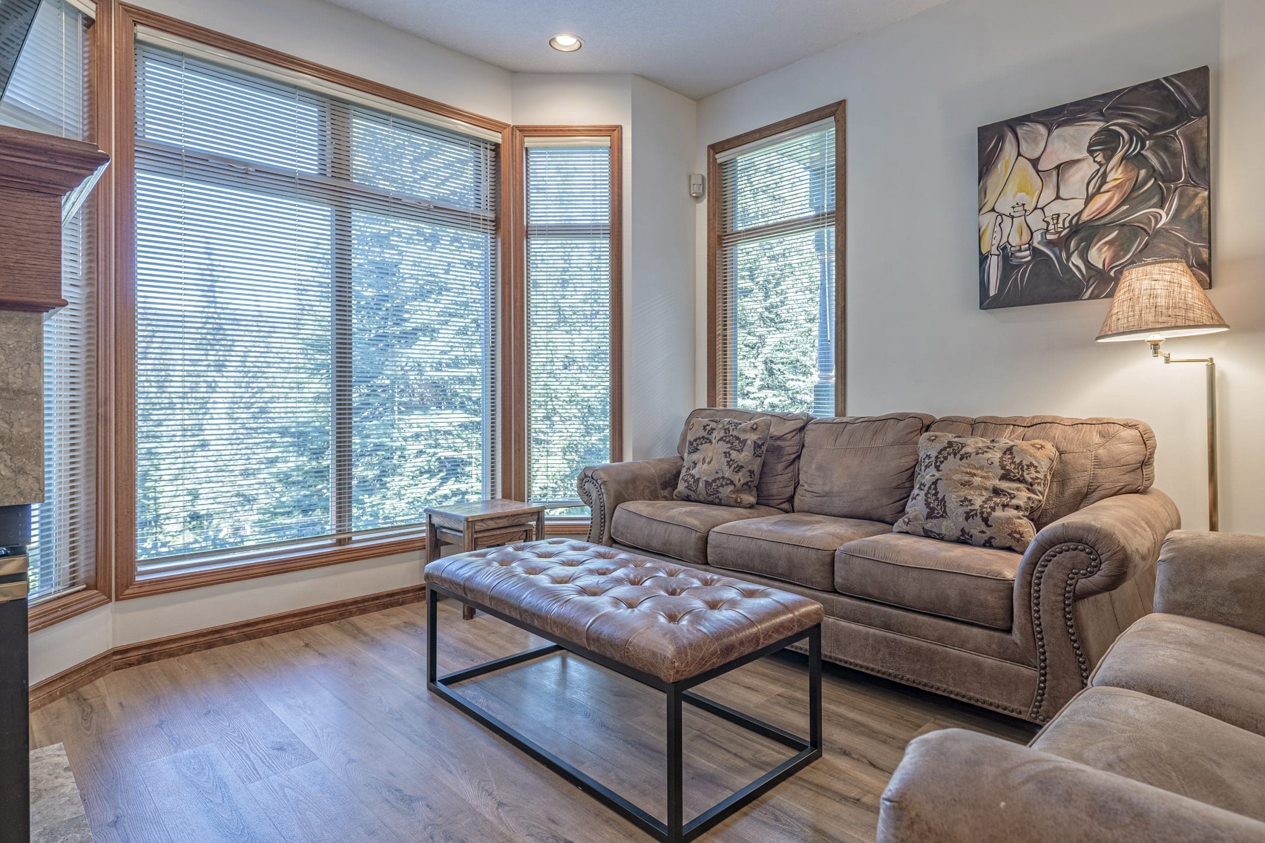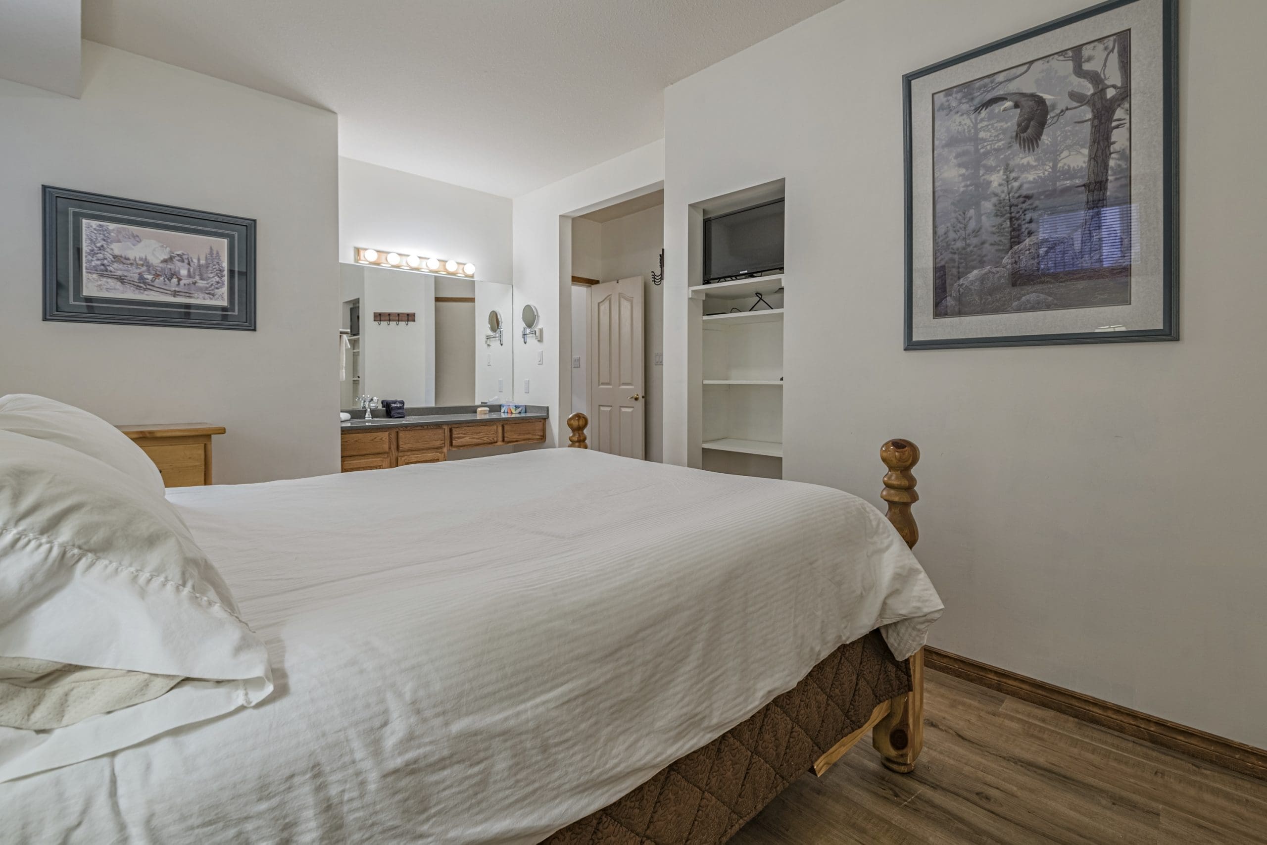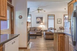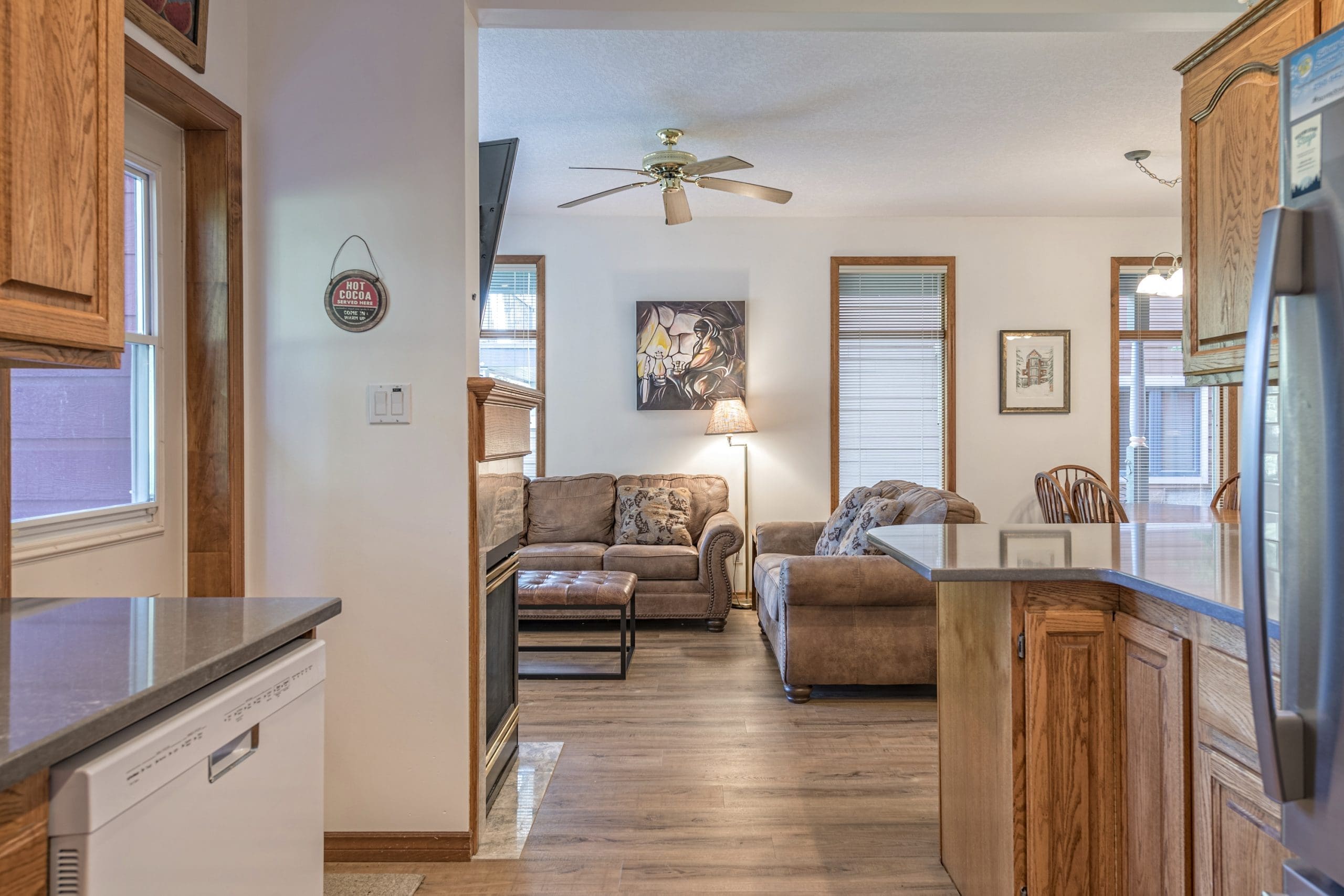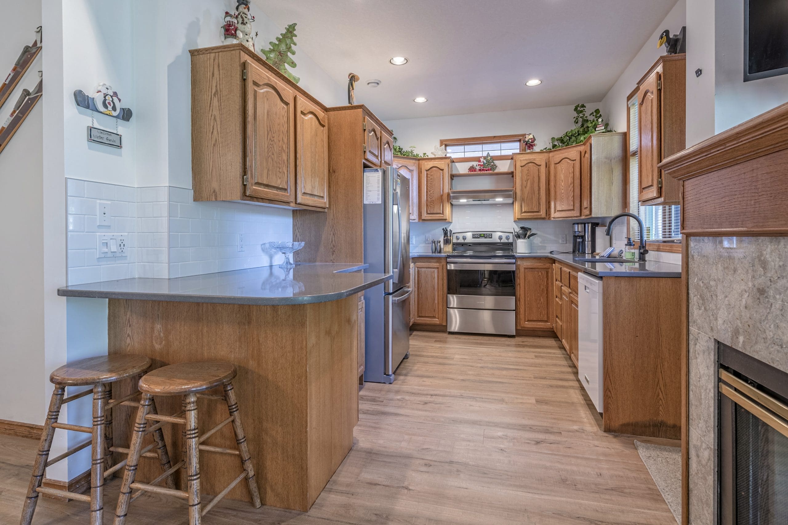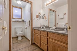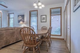 Head in the front door to the large mudroom – perfect for all your gear. Once you’re in the suite, everything is on the same level too. There is a large living and dining room with windows overlooking the pond and a beautiful gas fireplace. The incredibly well-stocked kitchen opens up to a small deck too.