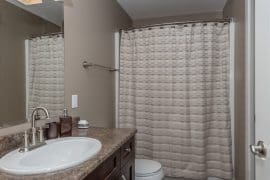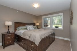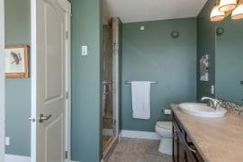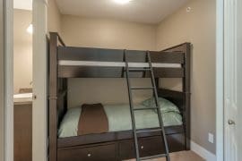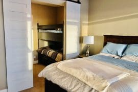 Bedroom number 3 is on this level with a queen bed (lots of storage), a semi-private bunk bed area that has barn doors for added privacy, and an ensuite bath that is shared with the family room with the Murphy bed.