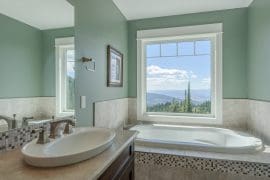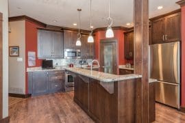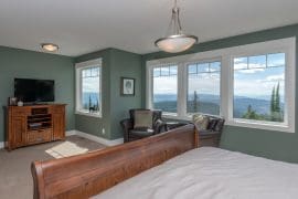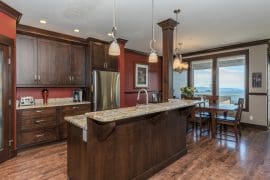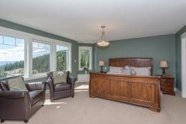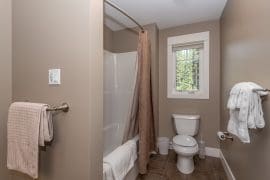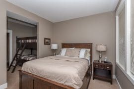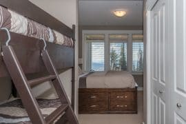 The upper level features a very large master bedroom with a king sleigh bed, a seating area, a 42 inch TV, a large walk-in closet, and an ensuite bathroom. The bath has twin sinks, a walk-in shower and a deep soaker tub with a view of the mountains and lakes. Bedroom two has a king bed with lots of storage, and a semi-private bunk bed area with a curtain for added privacy and an ensuite bathroom.
