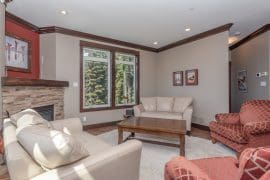 The lower level contains a family room with a large sectional, a comfy reading chair, a 42 inch TV with DVD player, and a ski room to get ready for your day.