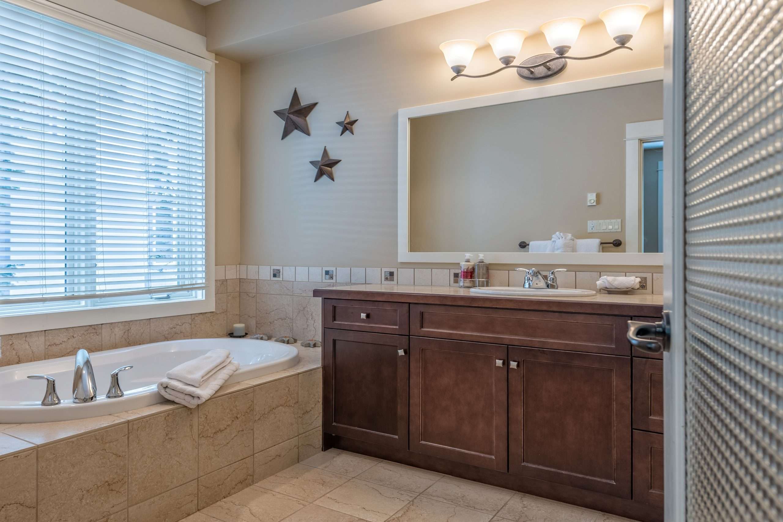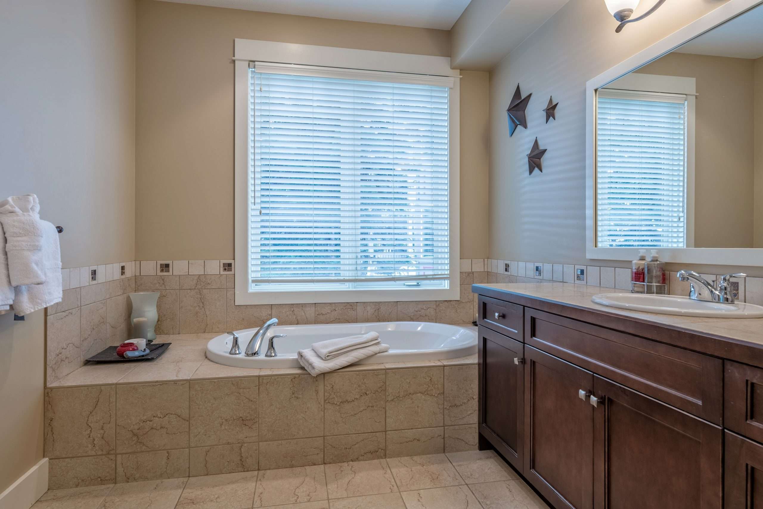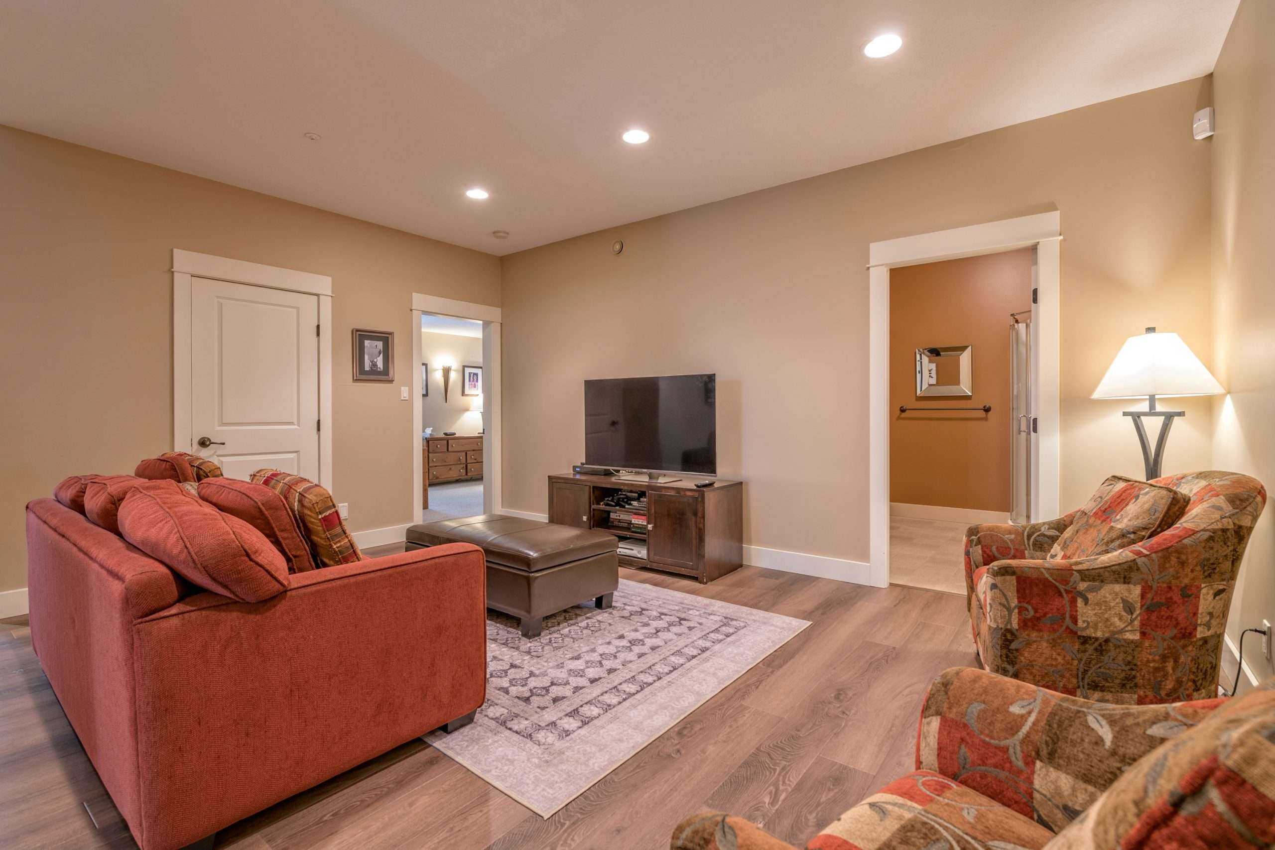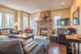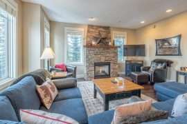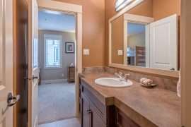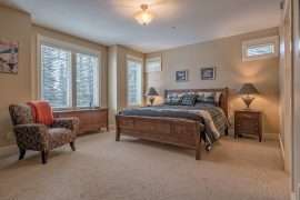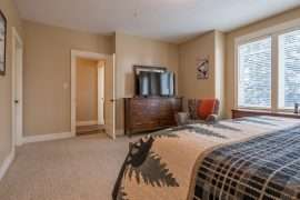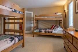 This level also contains the three other bedrooms. The large master bedroom has beautiful mountain views, walk in closet and ensuite with stand up shower and soaker tub. There is a second master bedroom with an ensuite and the third bedroom is a bunk room with a Jack and Jill bathroom – perfect for kids!
