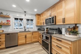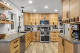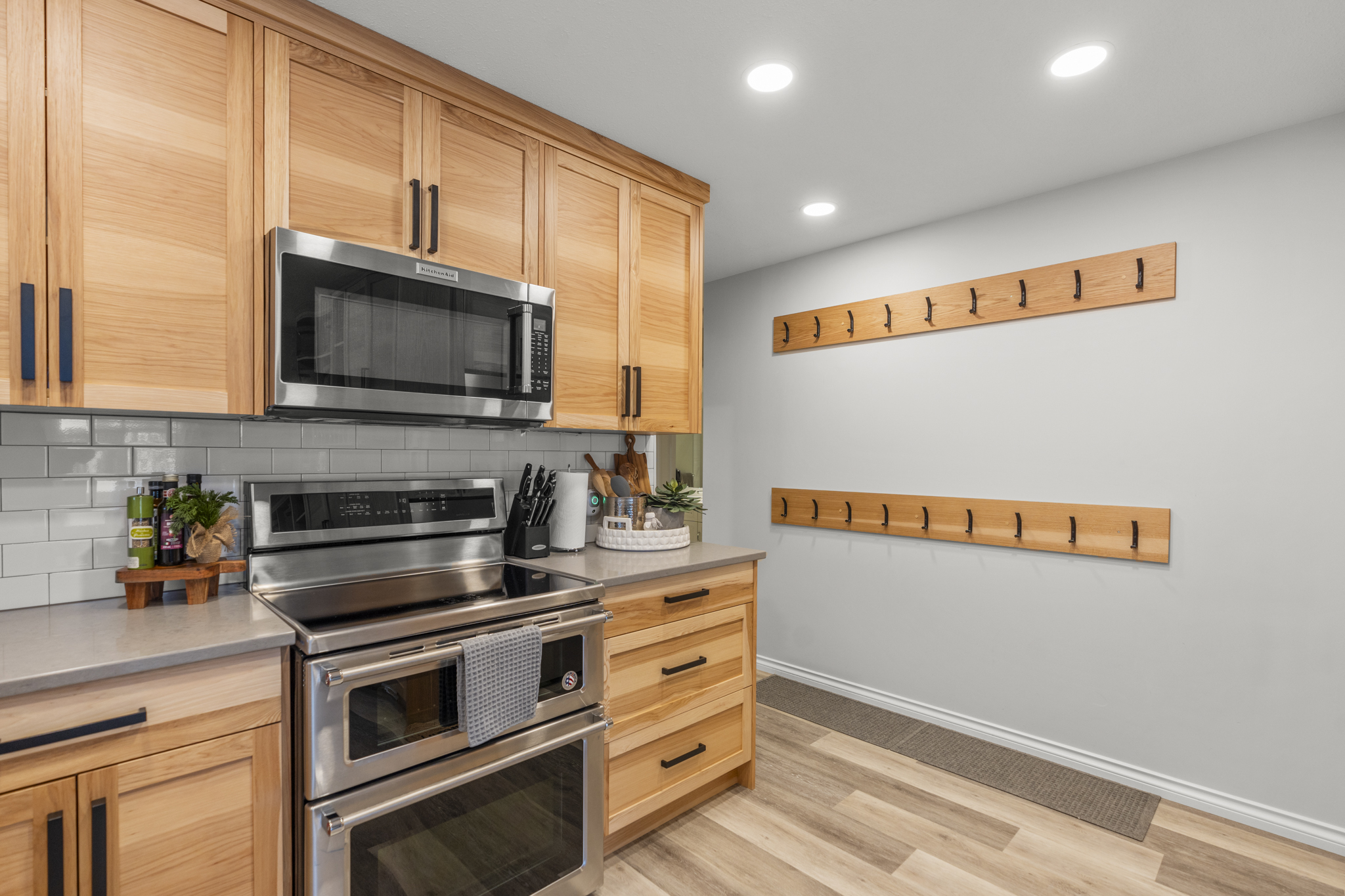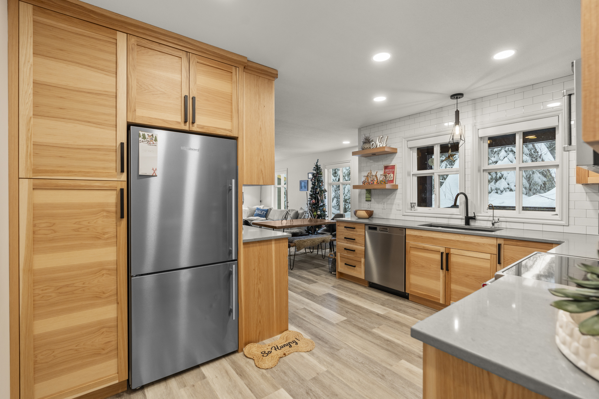 Walk in the front door to your bright and open living room with a sectional couch that is also a pullout couch, beautiful gas fireplace and an open dining room and kitchen. This kitchen is a dream! It has a double oven, large fridge and everything you need to cook meals during your stay.