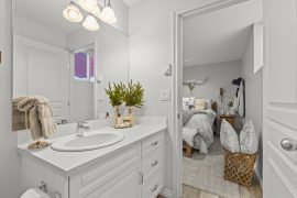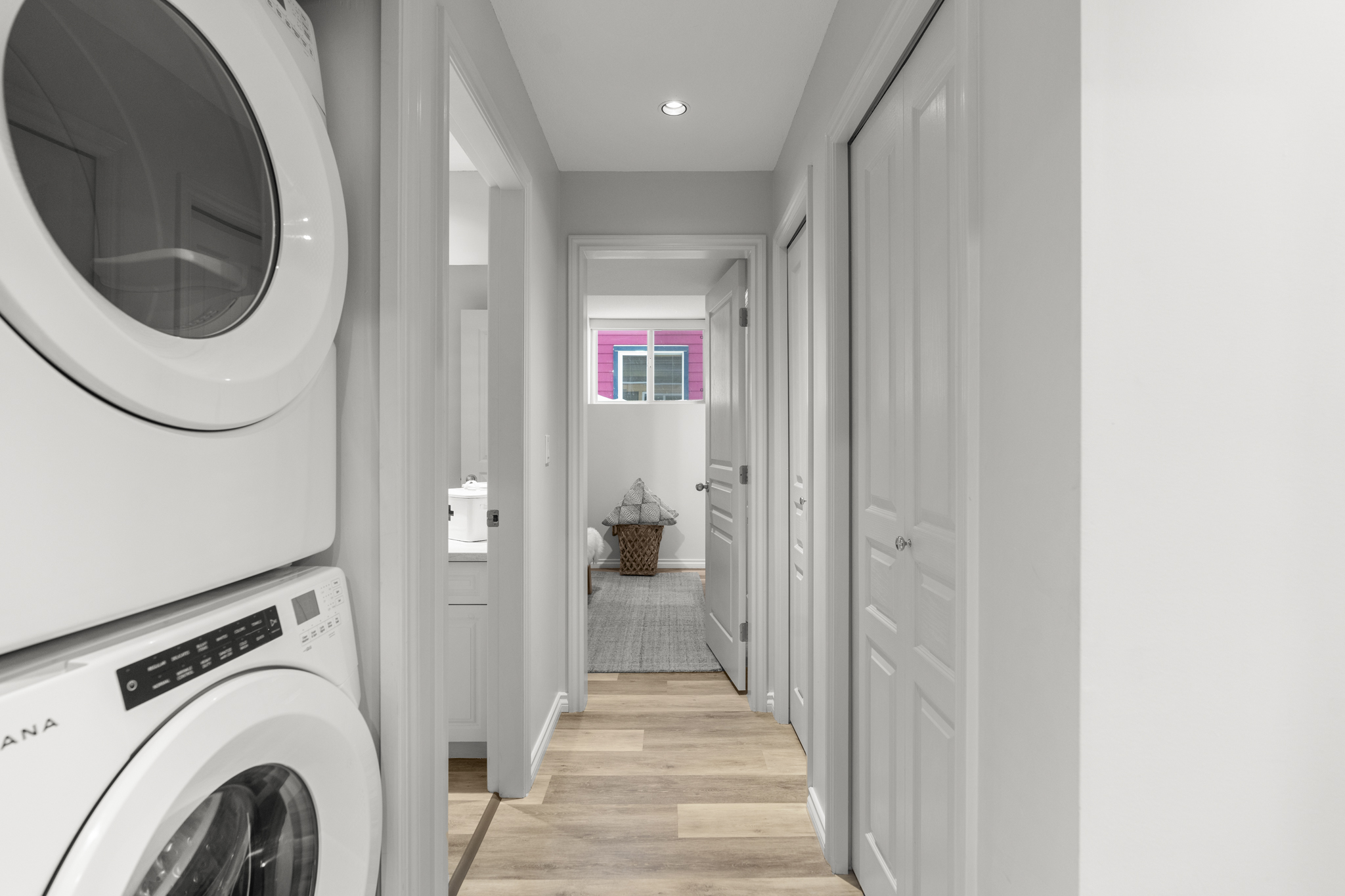 Head down the hall to the master bedroom with half ensuite. The large bunk room has two double over double bunk beds and a TV – perfect for kids! There is also a full bathroom and a washer and dryer for you to use during your stay.