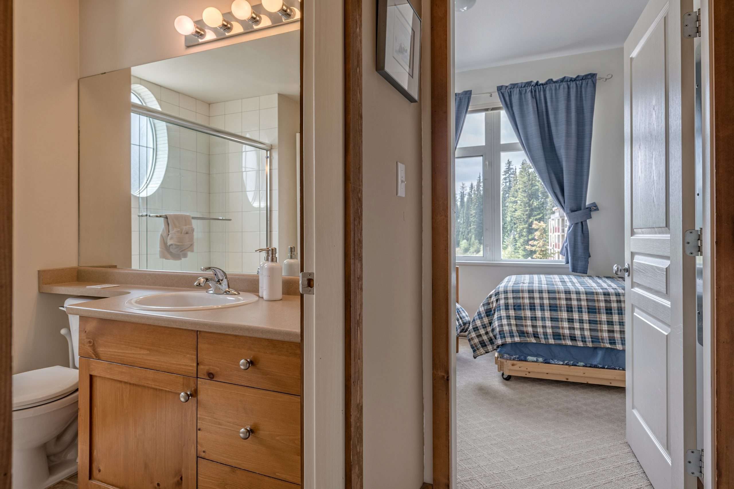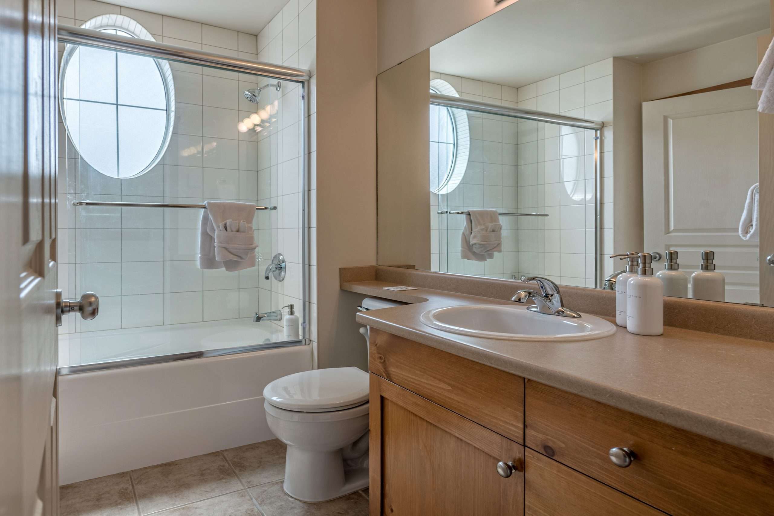 This is the perfect spot for a family or group of friends. The open living area has a dining table, living room with smart TV and fully equipped kitchen, ideal for socializing and après ski. The upstairs sleeping area features two bedrooms, including a master queen-sized bed with a jack and jill bathroom, and a second bedroom with a double and single bed. A second, newly renovated washroom on the main floor also contains laundry facilities.