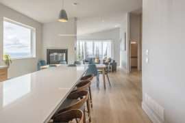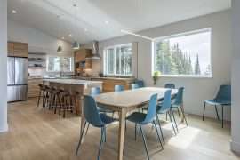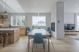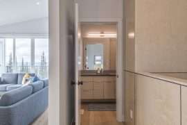 The modern, bright and open living areas on each side have peaked 14 foot ceilings and large windows. The cozy living rooms have a double sided gas fireplace, mountain views and a cute little nook that is perfect for reading. Each dining room has a large table and the upgraded, spacious and full gourmet kitchen has everything you need to cook a meal at the end of a fun day on the mountain. The oven has a built-in air fryer, Insta-Pot, espresso machine and more! On this level, you’ll also find a powder room and an area to store all your jackets and gear. This is also where you will access the private hot tub and where you can head over to the other side from the back deck area.
