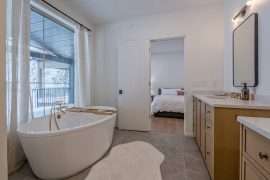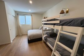Upstairs, you will find the large master bedroom, covered deck and luxurious ensuite with a double sinks, stand-up shower and soaker tub. This is the place where you can relax at the end of your day! The master bedroom also has a large walk in closet which can double as the perfect bedroom for a baby or toddler. You’ll also find a secondary master bedroom with a king bed and single/single bunk bed, ensuite and closet.