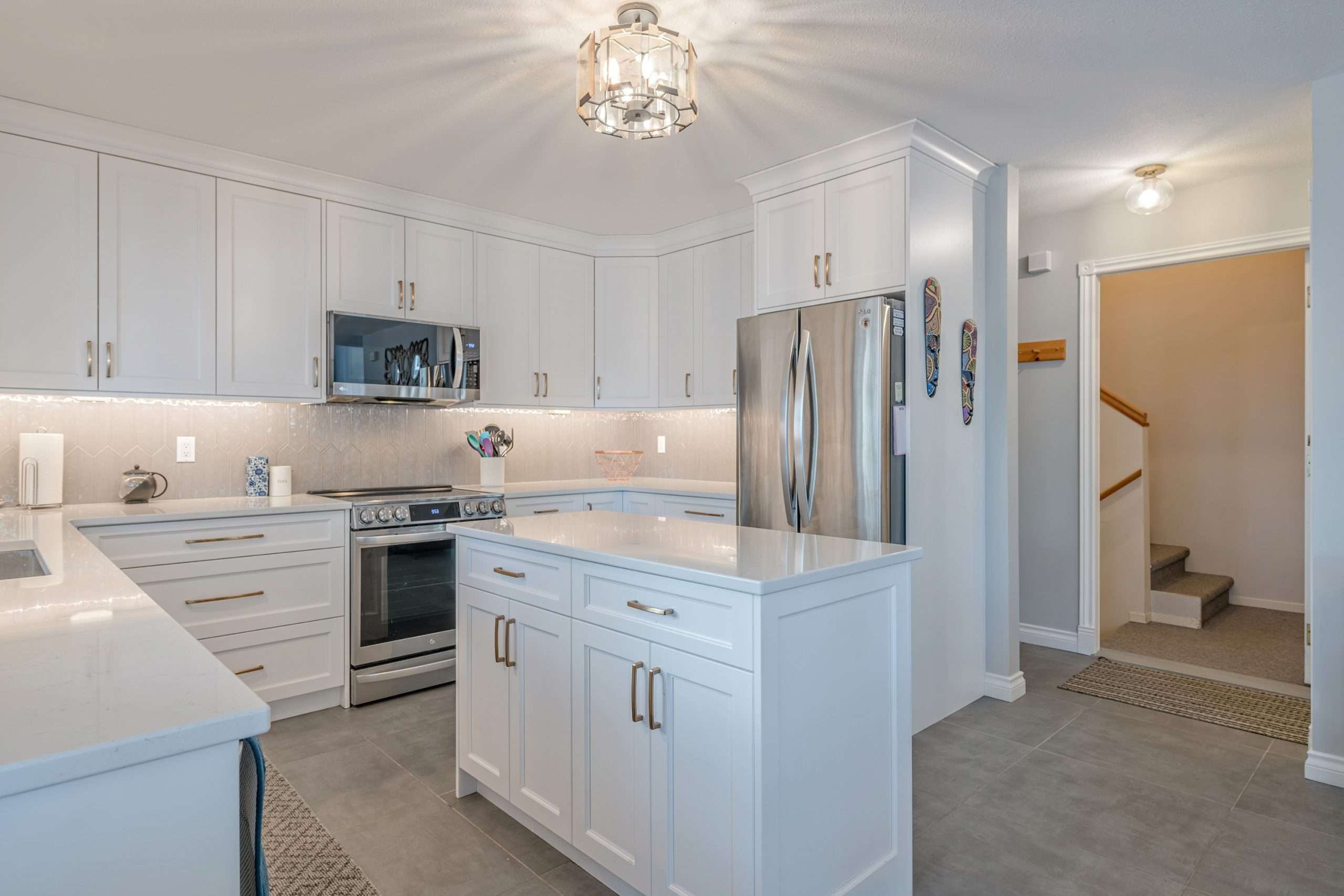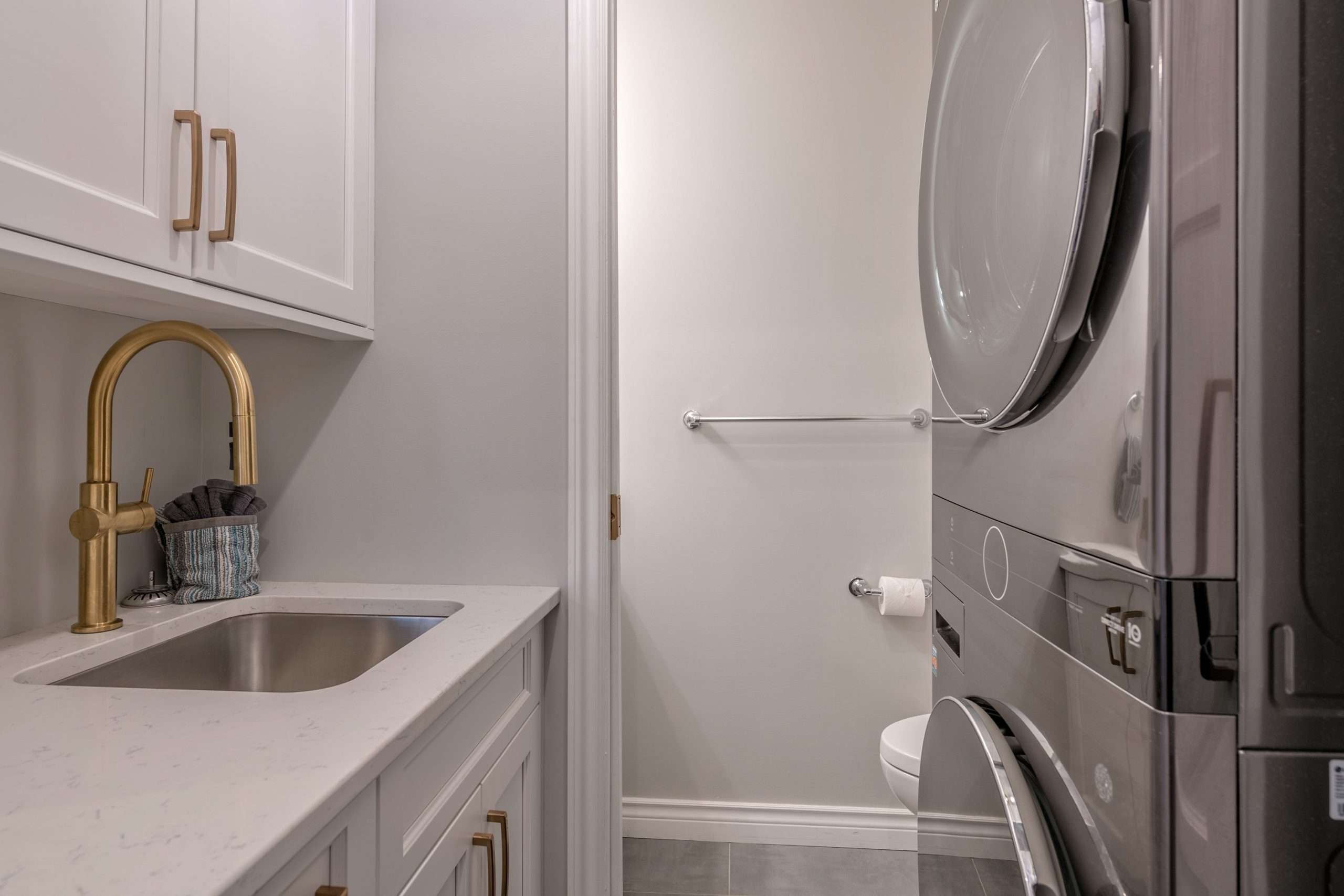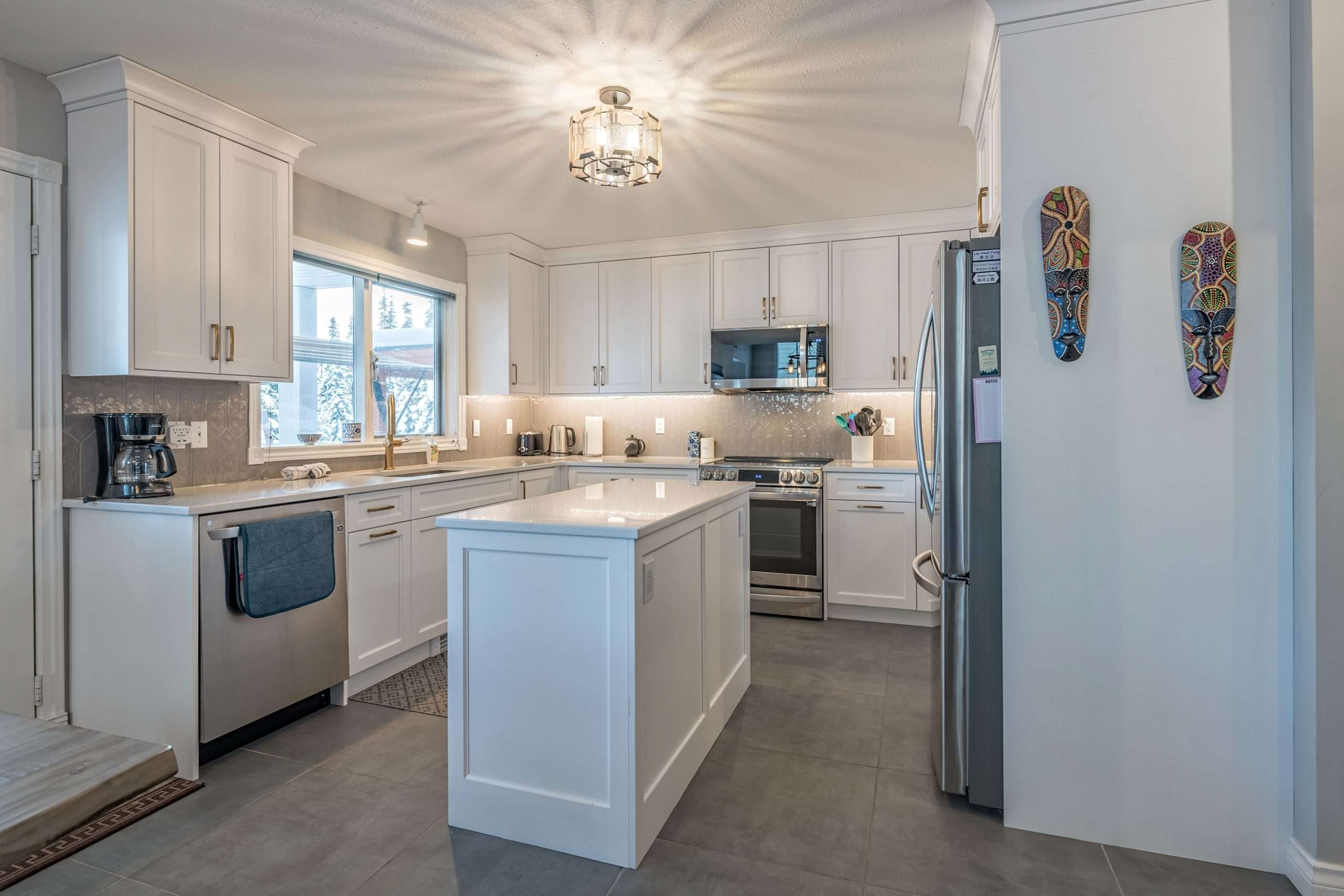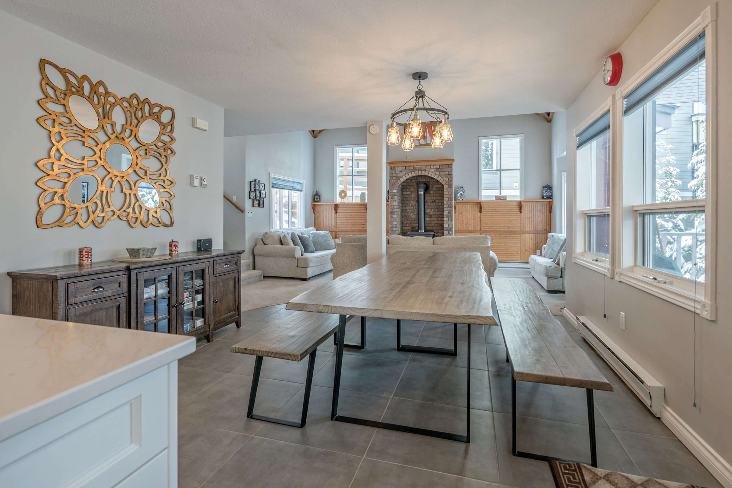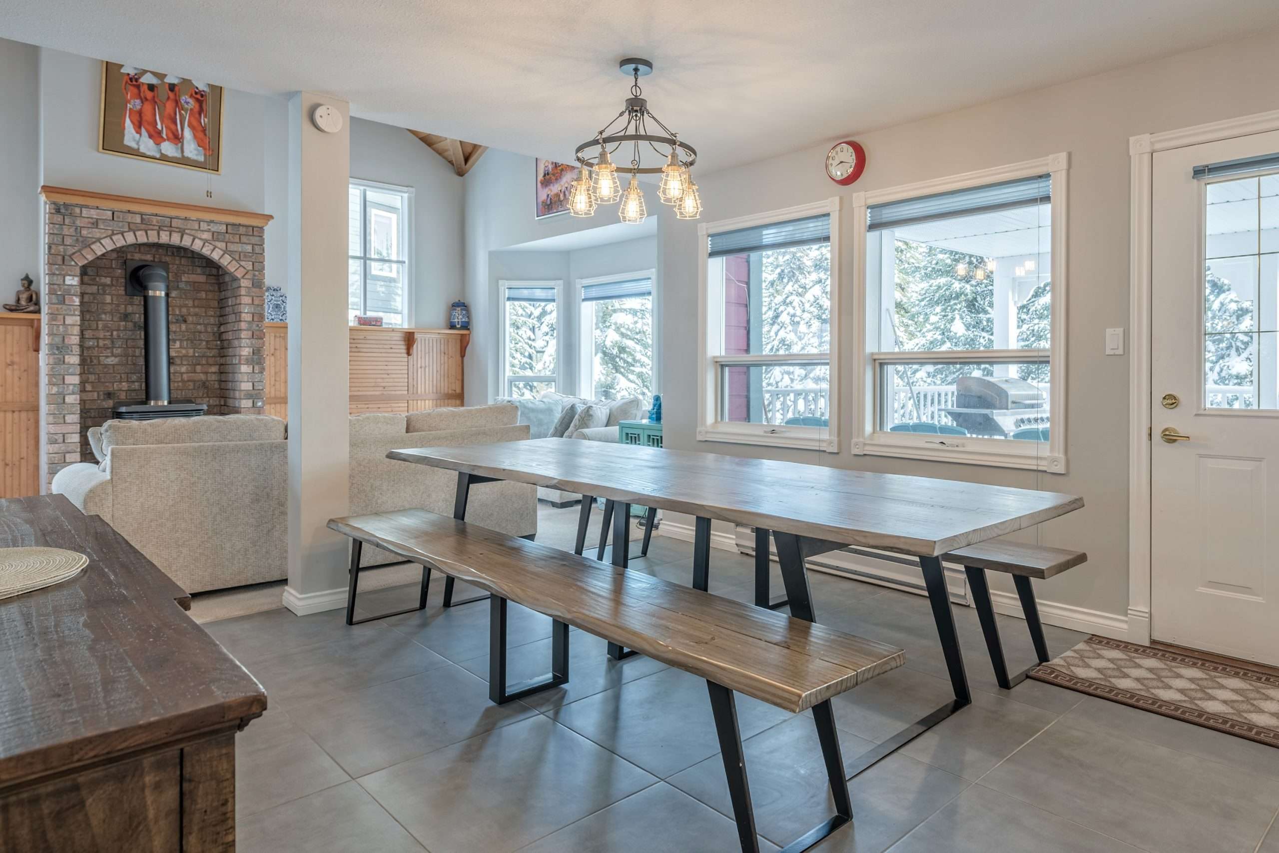 Walk in the front door and head down a few steps to the main living area. This area boasts an open design with vaulted cedar ceilings and gas fireplace in the great room area, dining room with long dining table, and newly renovated kitchen. Just off the kitchen you will find a powder room, laundry room, and even a wine fridge!
