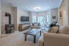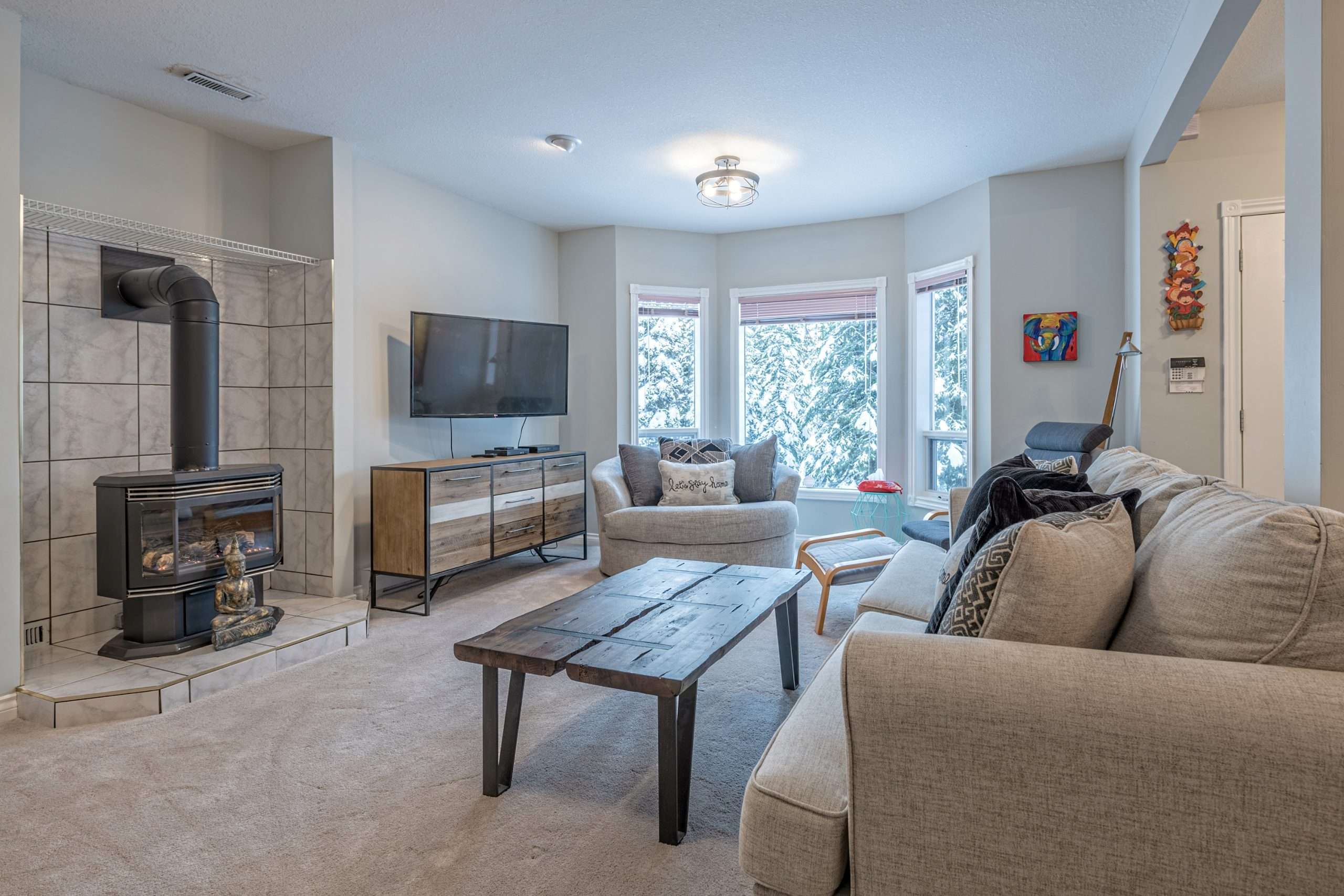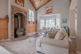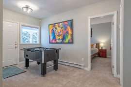 Head downstairs from here and you will find a den with a gas fireplace, cozy couches and even a foosball table. There is another bedroom and full bathroom too. You will also access your private hot tub off this lower level.