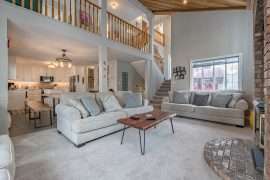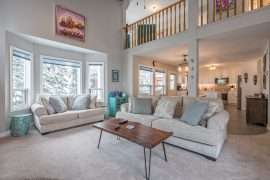 From the front door, you can also head upstairs to the open loft with a pullout couch and three bedrooms. There are two master bedrooms; one with a king bed and ensuite and the other with a queen bed, ensuite and even a cozy sitting area with a TV. This space is perfect for anyone in your group that needs extra privacy. The third bedroom has two queen beds, one sits in an upper loft with a cool kids play area. This home has everything for every age in your group.