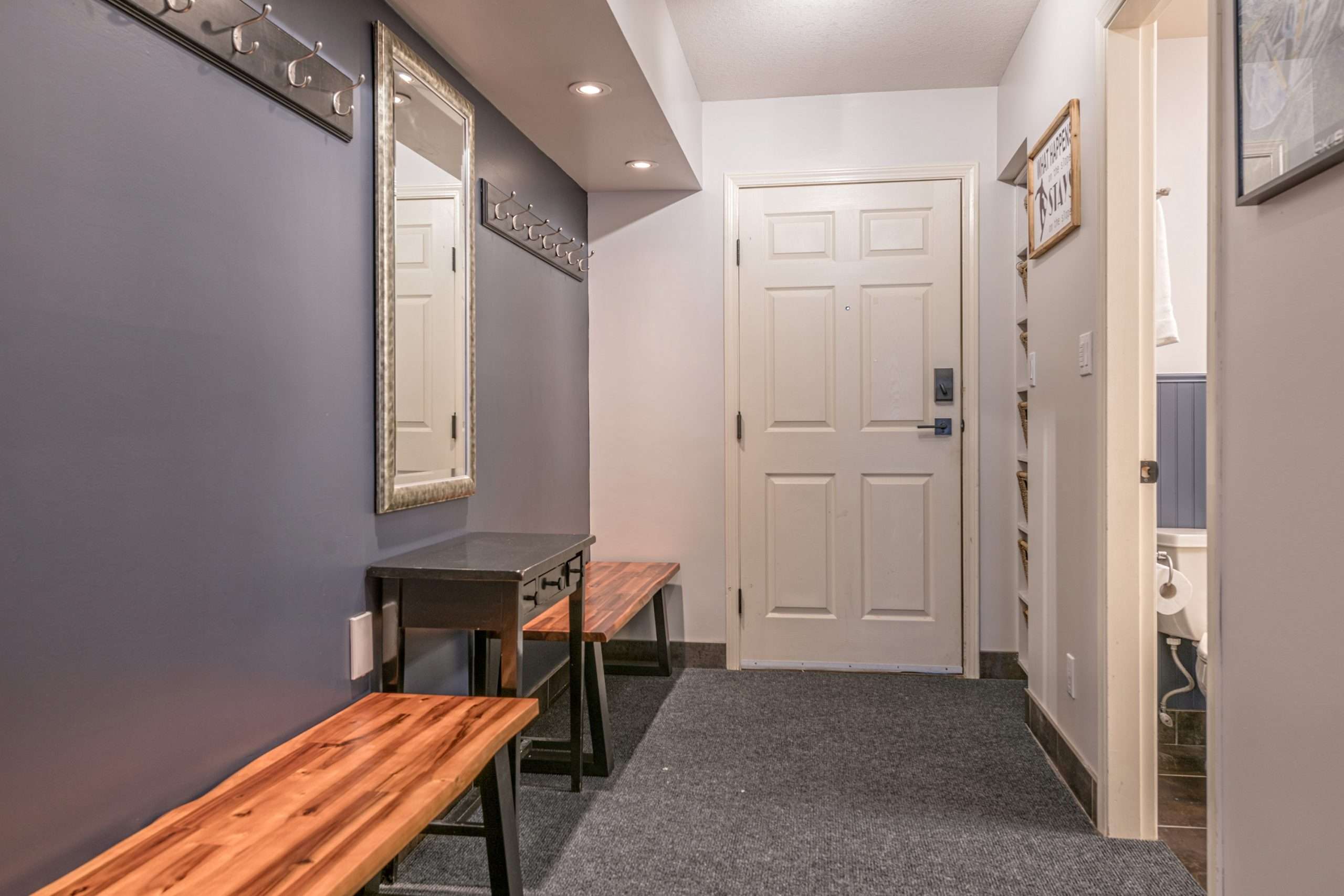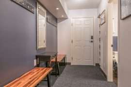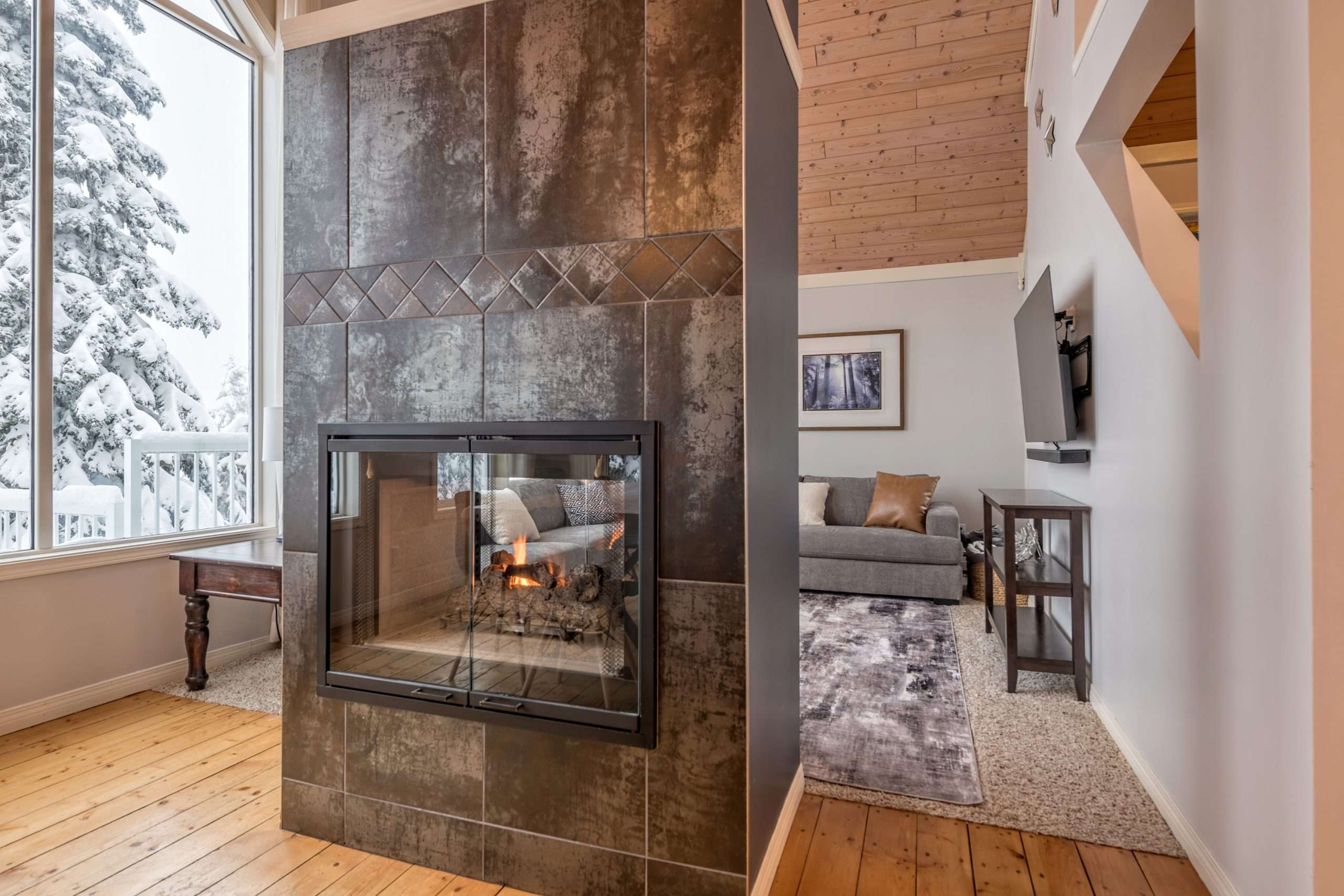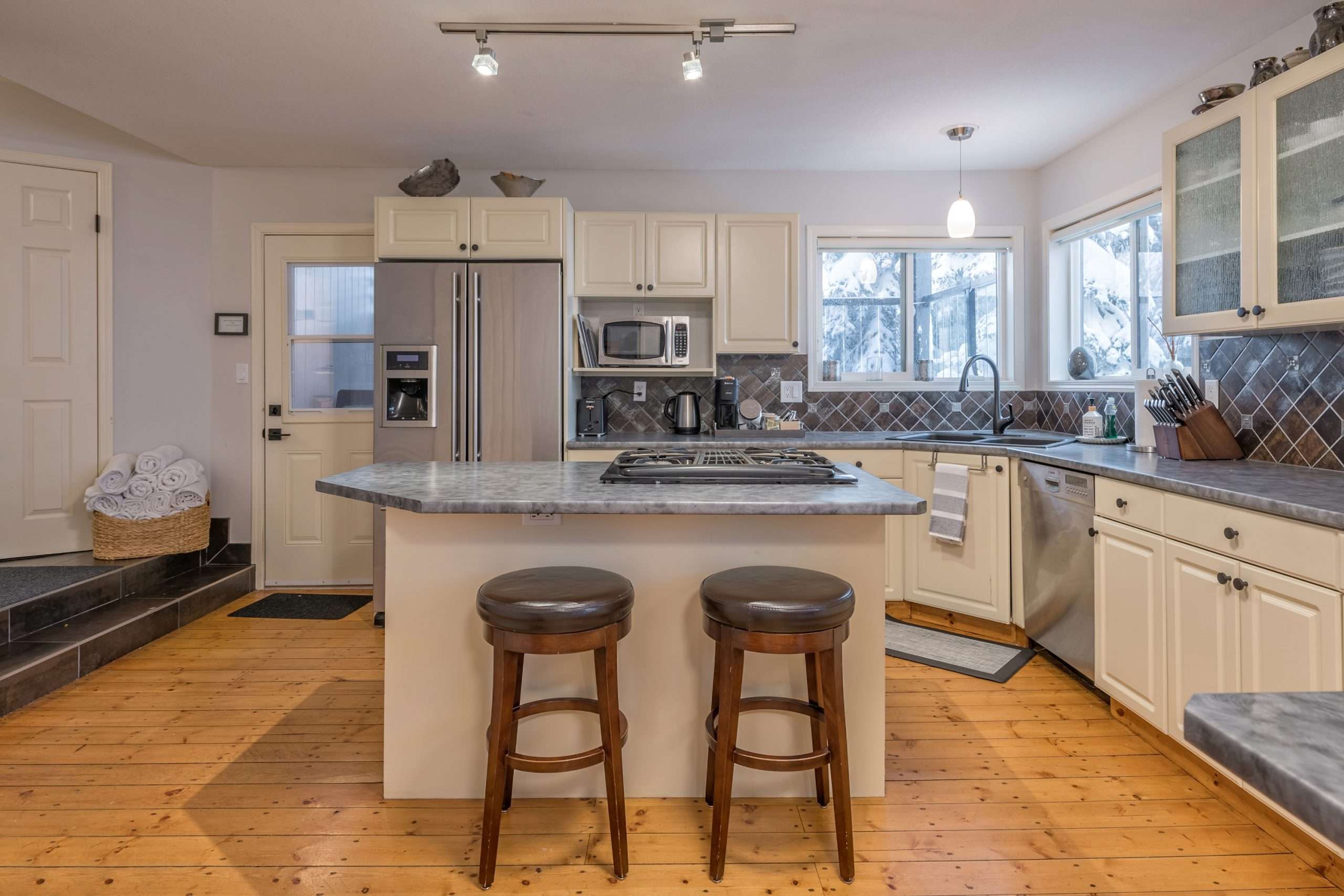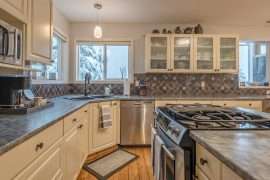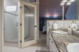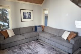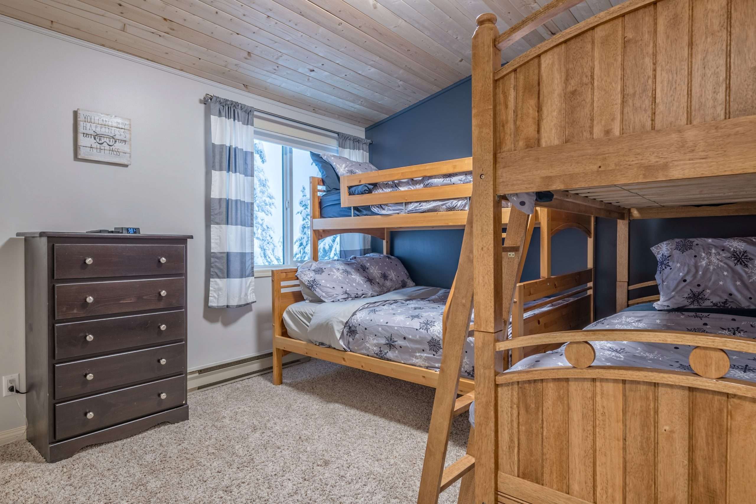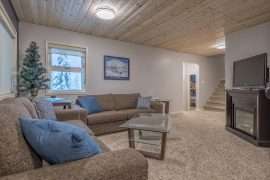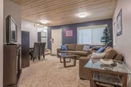 Walk in the front door to the large entryway where you can comfortably put on all your gear before you head out to the mountain. Just off this entryway is where you’ll find the main level full bathroom and a large closet for your coats and boots. Head into Sunset Vista where you will find the fully stocked kitchen, dining room and cozy living room. The bright and airy main living area has vaulted ceilings, large windows and a two-way gas fireplace to keep you warm. Take in the beautiful sunsets from the comfort of your living room. Just off the kitchen, there is a covered deck with your private hot tub and BBQ. On this level, you’ll also find the double/single bunk room which is perfect for someone that would like to be on the same level as the main gathering space or can’t do stairs.