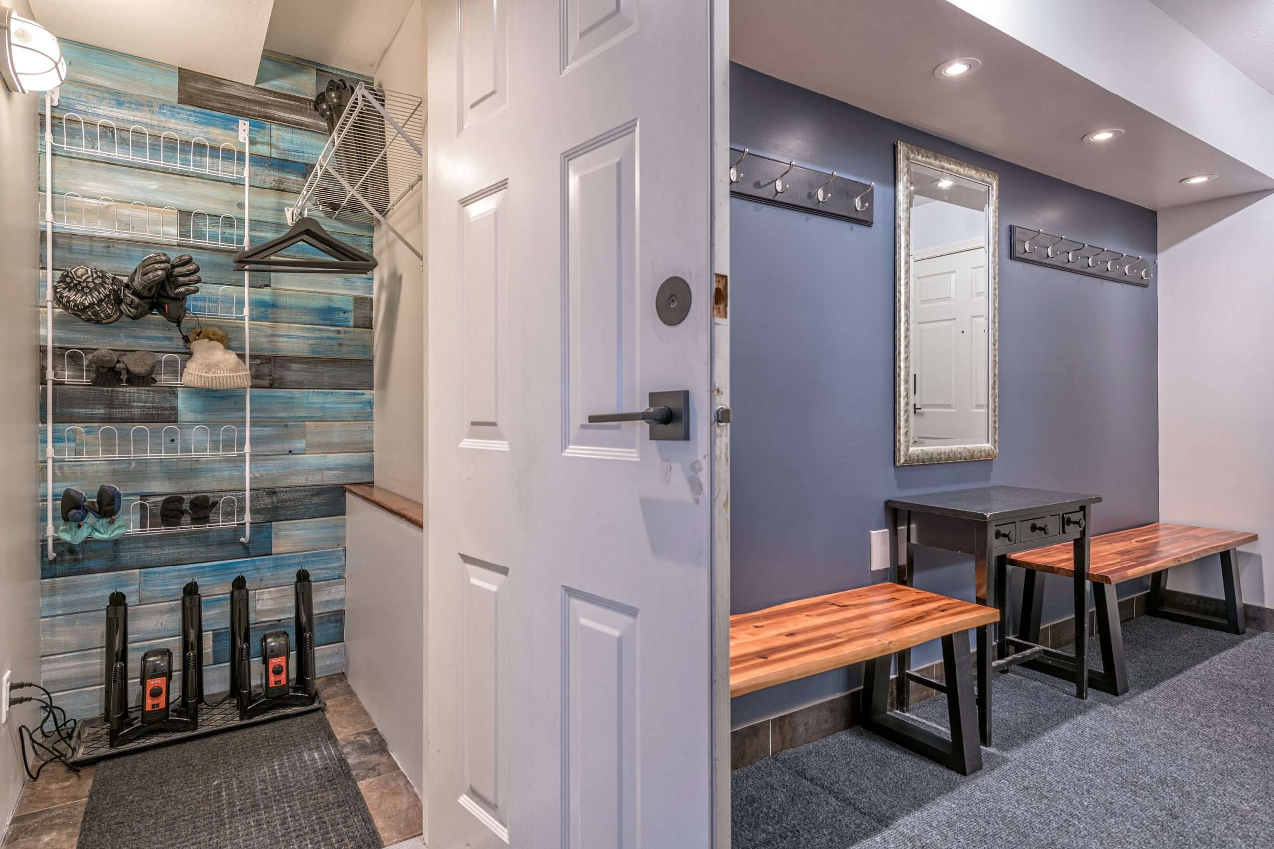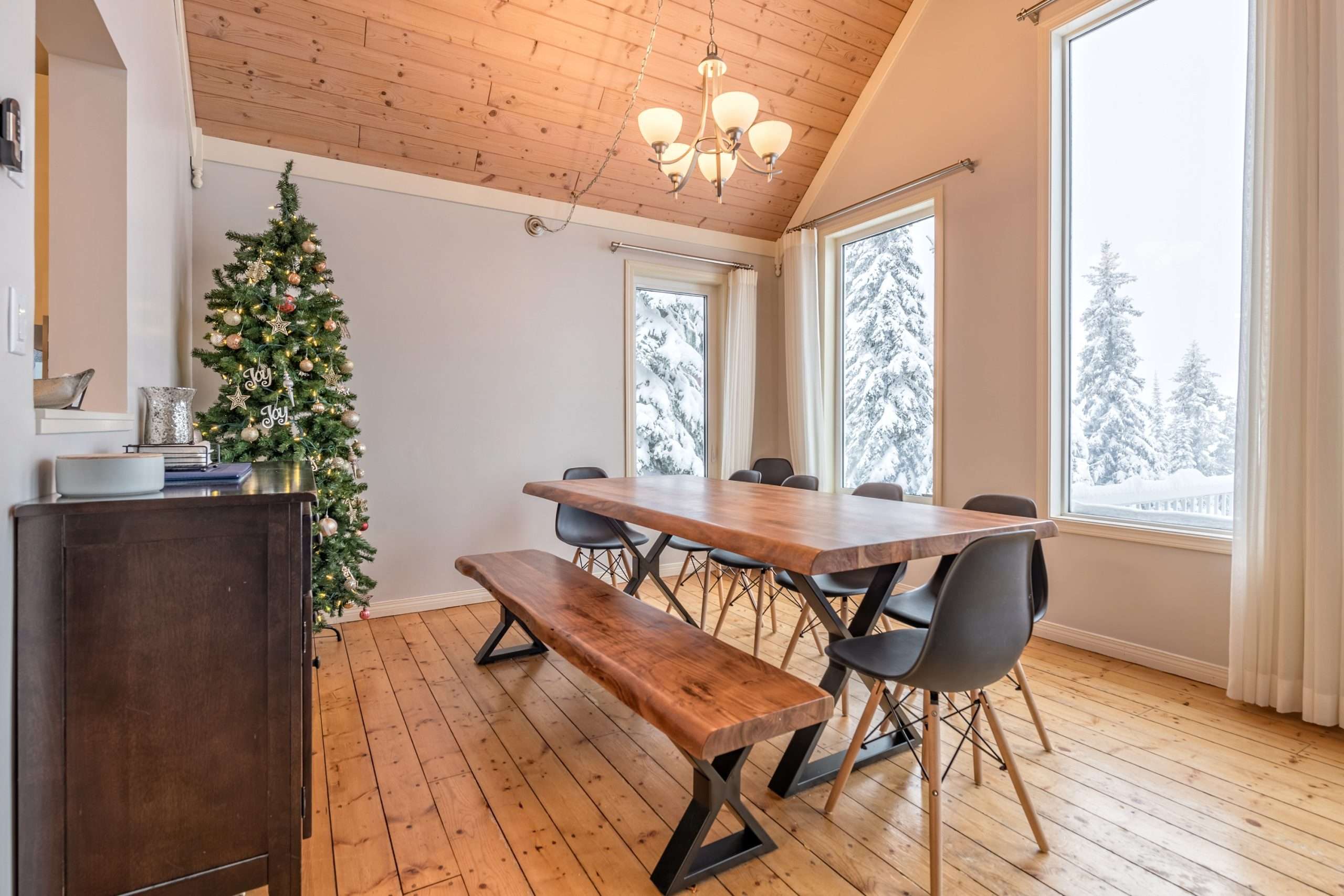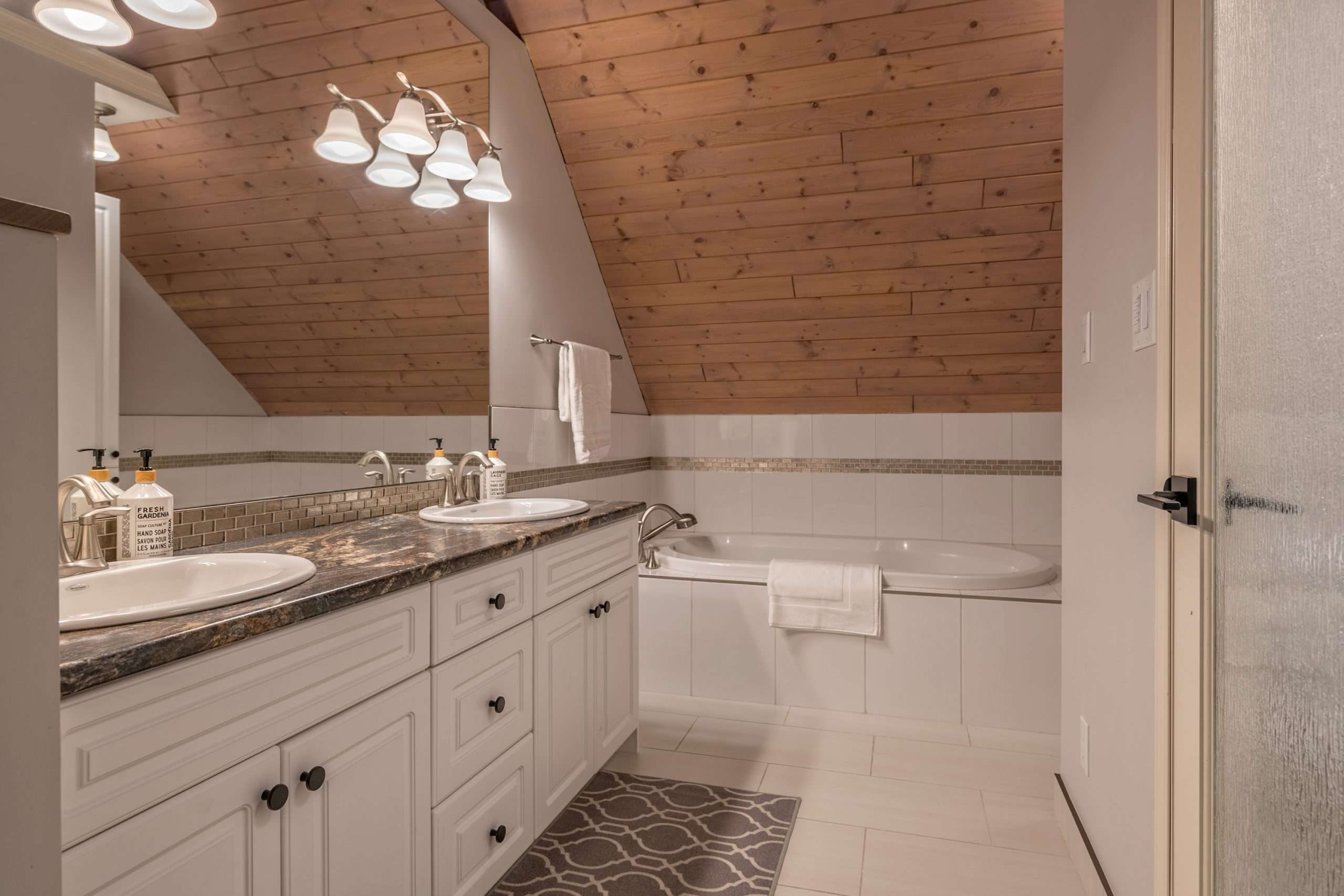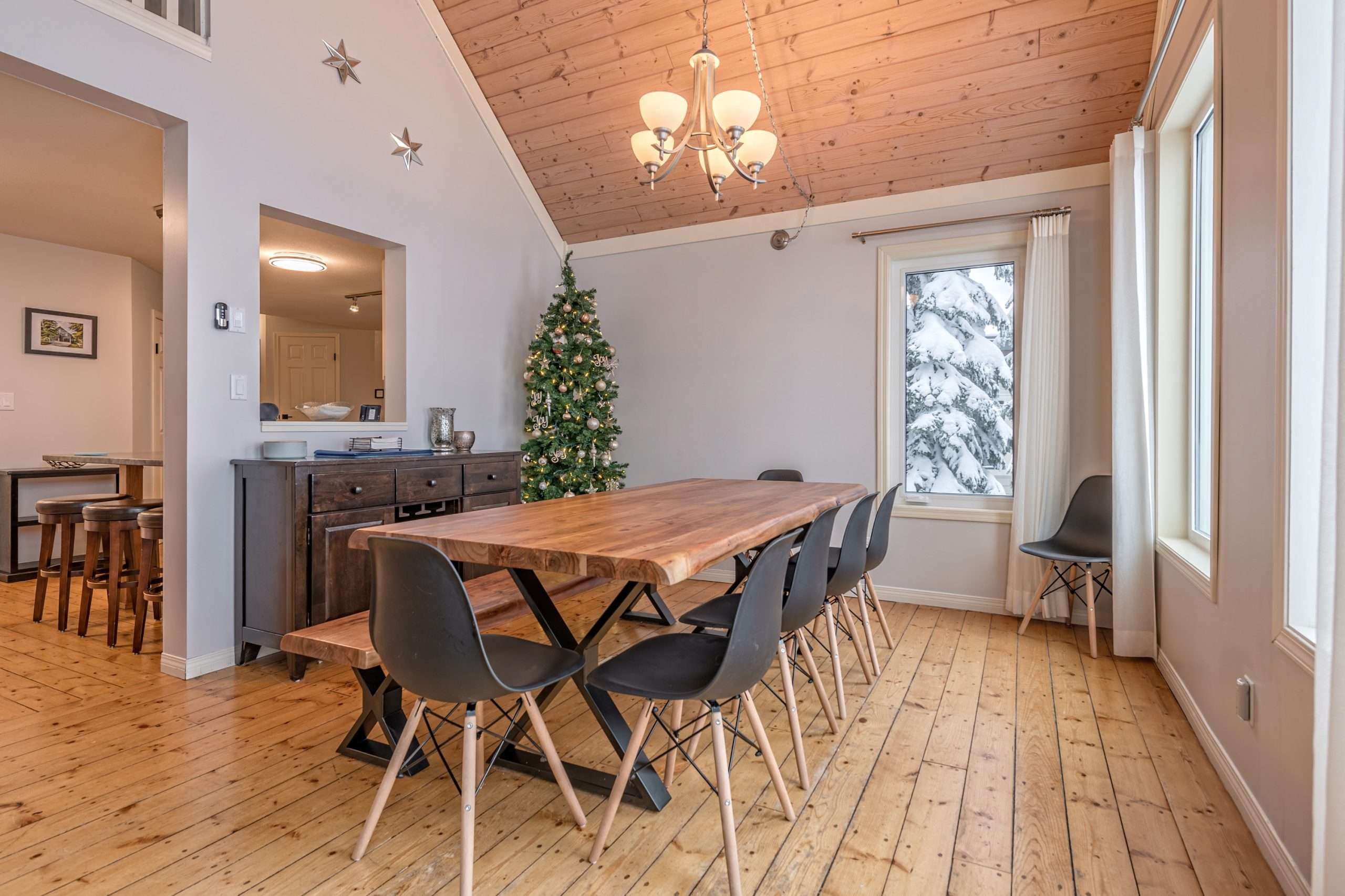 Walk in the front door to the large entryway where you can comfortably put on all your gear before you head out to the mountain. Just off this entryway is where you’ll find the main level full bathroom and a large closet for your coats and boots. Head into Sunset Vista where you will find the fully stocked kitchen, dining room and cozy living room. The bright and airy main living area has vaulted ceilings, large windows and a two-way gas fireplace to keep you warm. Take in the beautiful sunsets from the comfort of your living room. Just off the kitchen, there is a covered deck with your private hot tub and BBQ. On this level, you’ll also find the double/single bunk room which is perfect for someone that would like to be on the same level as the main gathering space or can’t do stairs.