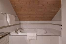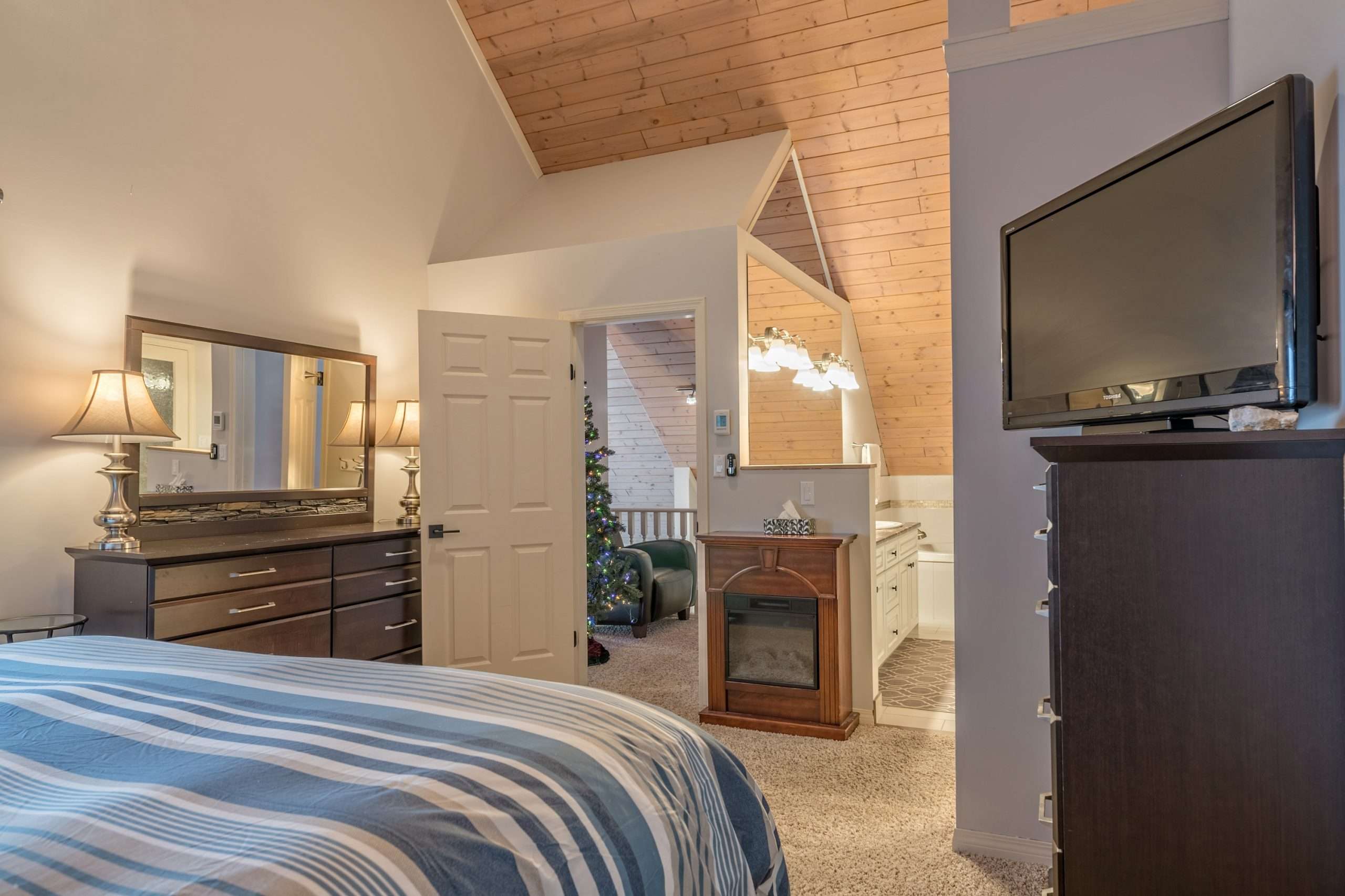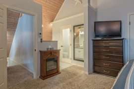 From the main level, head upstairs to the master bedroom. At the top of the stairs, there is a small sitting area and the master bedroom is an open air loft that has a king bed and large ensuite with a soaker tub.
