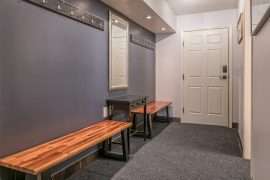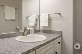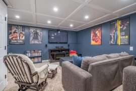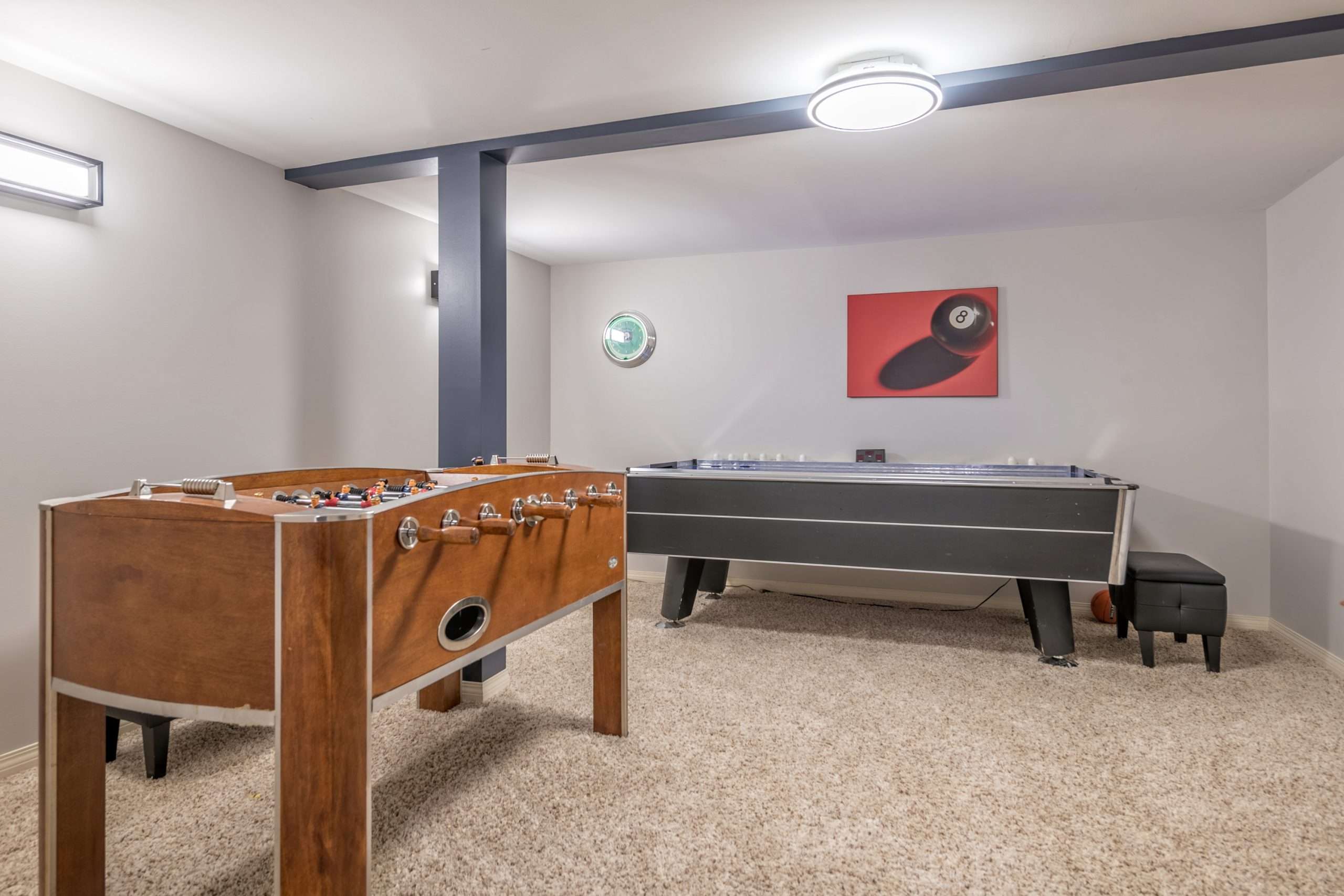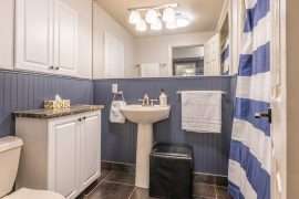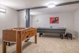 Once you’re back on the main level, head downstairs to the other three bedrooms, full bathroom along with the second living room, media room and games room. This floor also has a wet bar with an extra fridge, just in case you need more kitchen space as well as an extra table to play games. One of the most unique features of Sunset Vista is the media room with theatre seating and the games room with an air hockey table, foosball table and board games. This is the perfect spot to unwind after a busy day on the mountain.