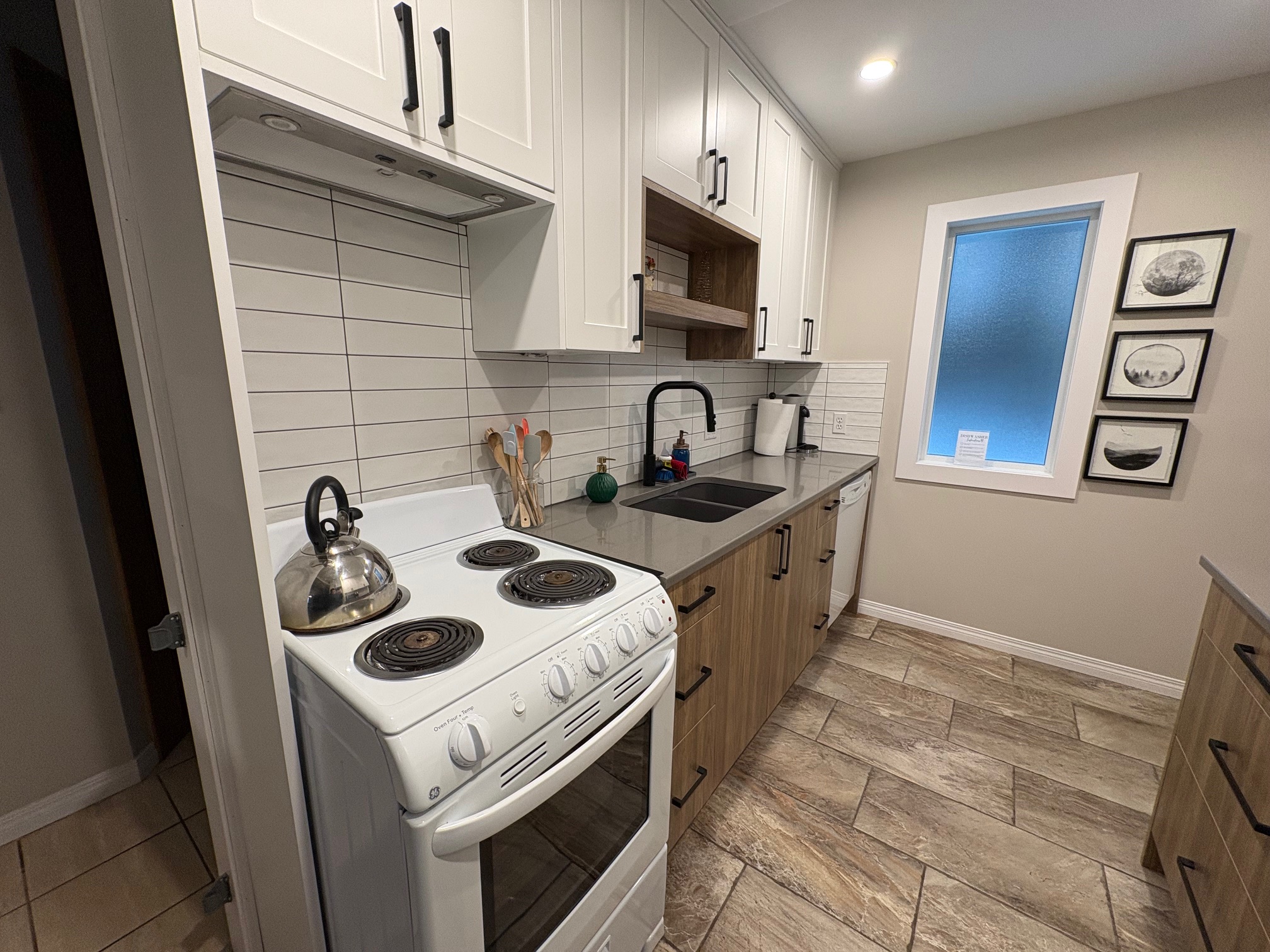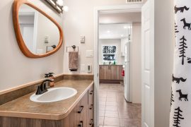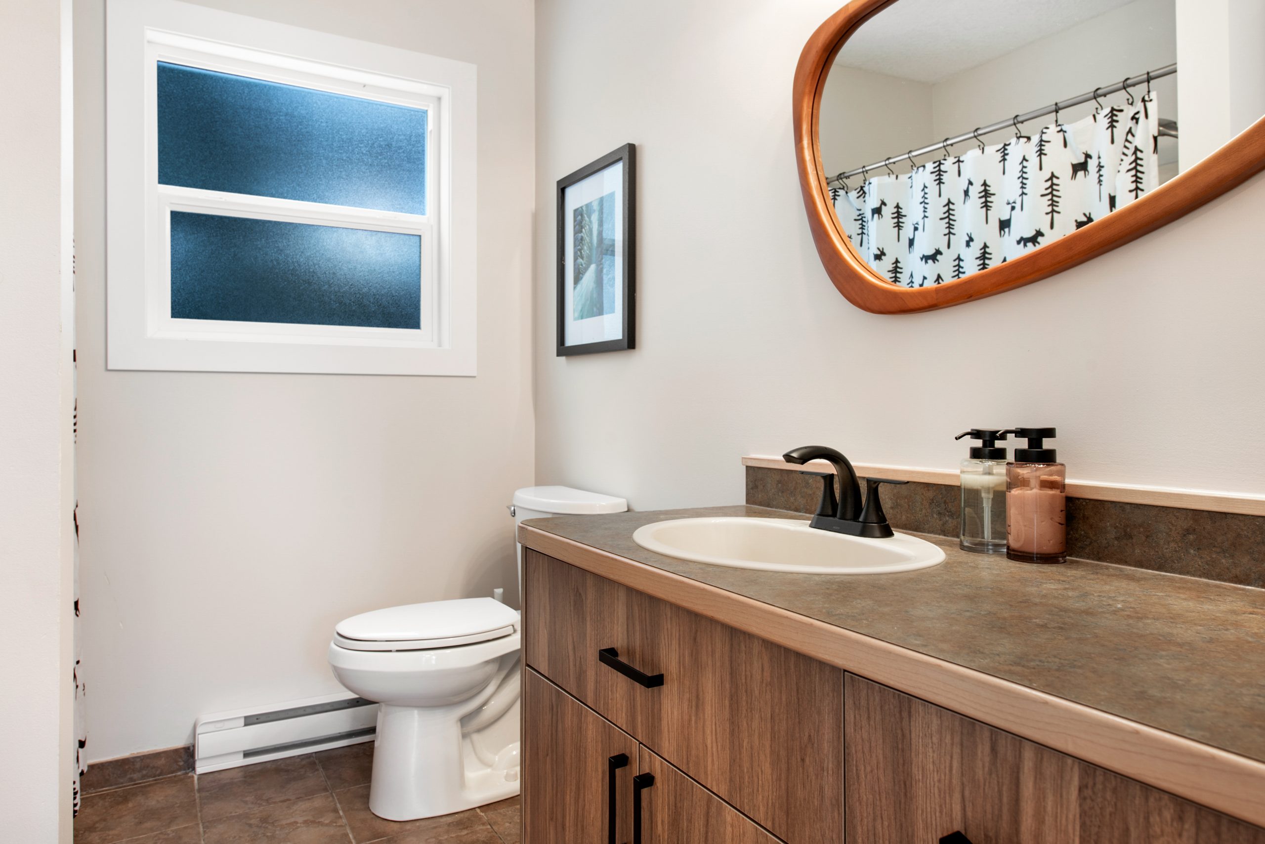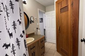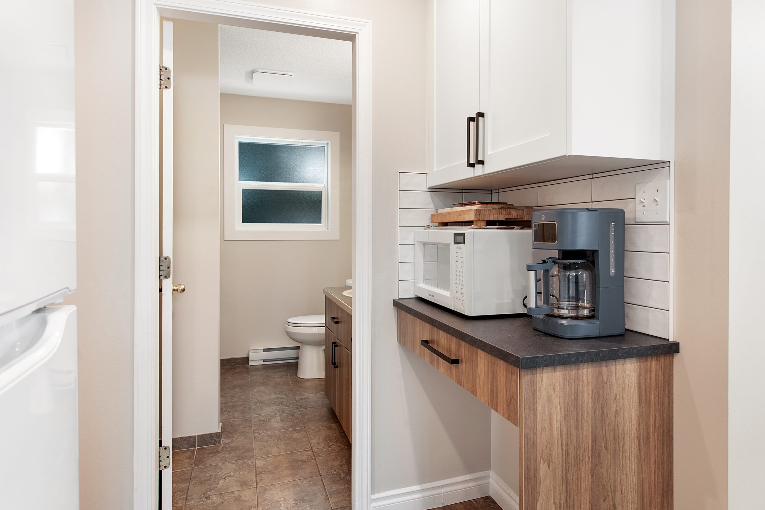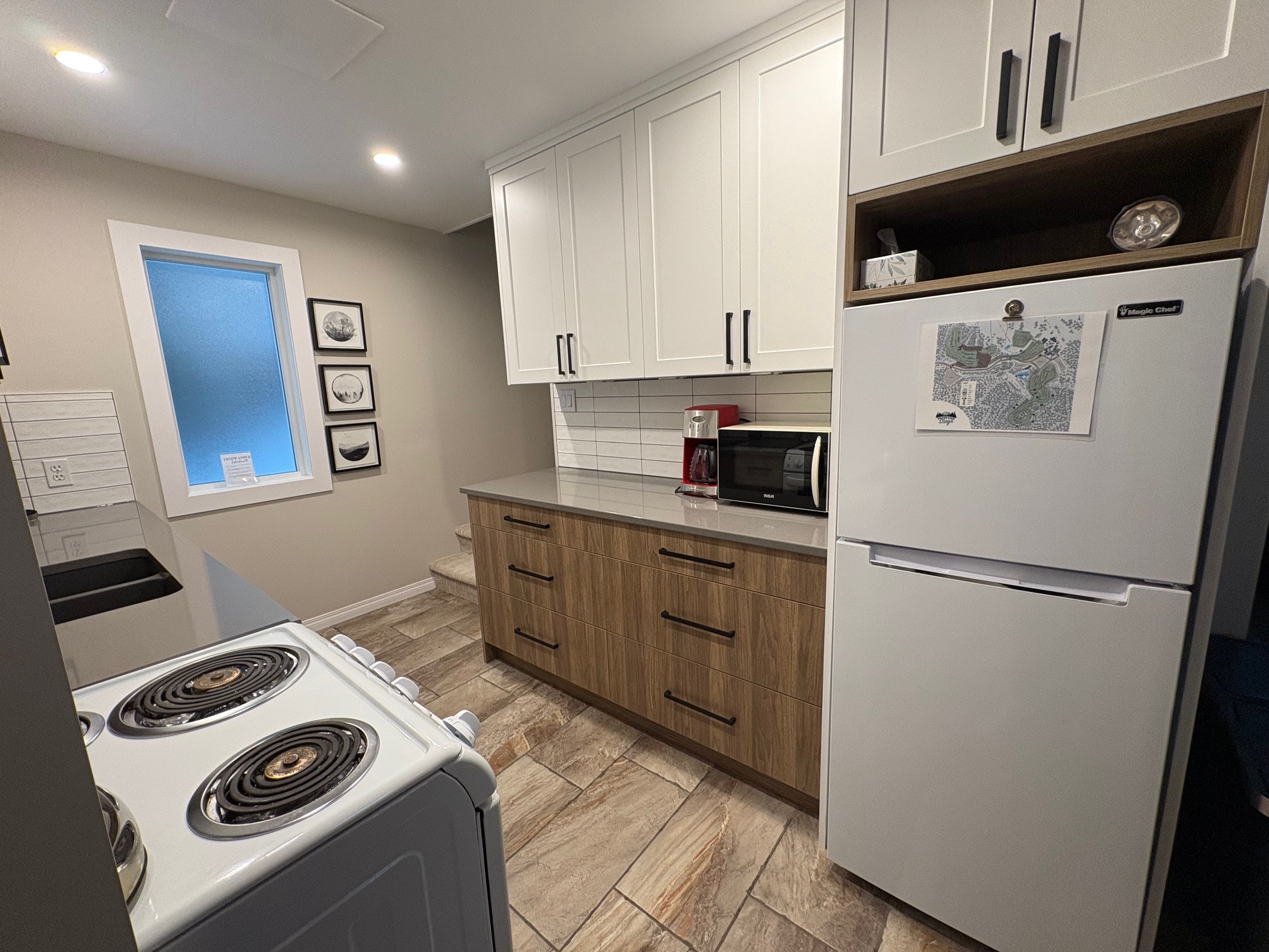 The ground level suite is perfect for those families or groups needing a little extra space. The suite can be internally accessed through a set of stairs in the house and has a full kitchen, two bedrooms, living room with pull-out couch and one full bathroom. This is also where you will find the sauna you can use during your stay. It’s the perfect way to warm up and rest your legs after a long day on the mountain.